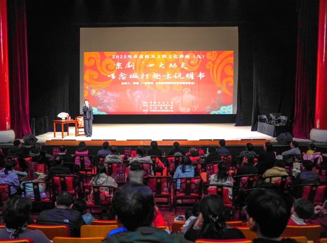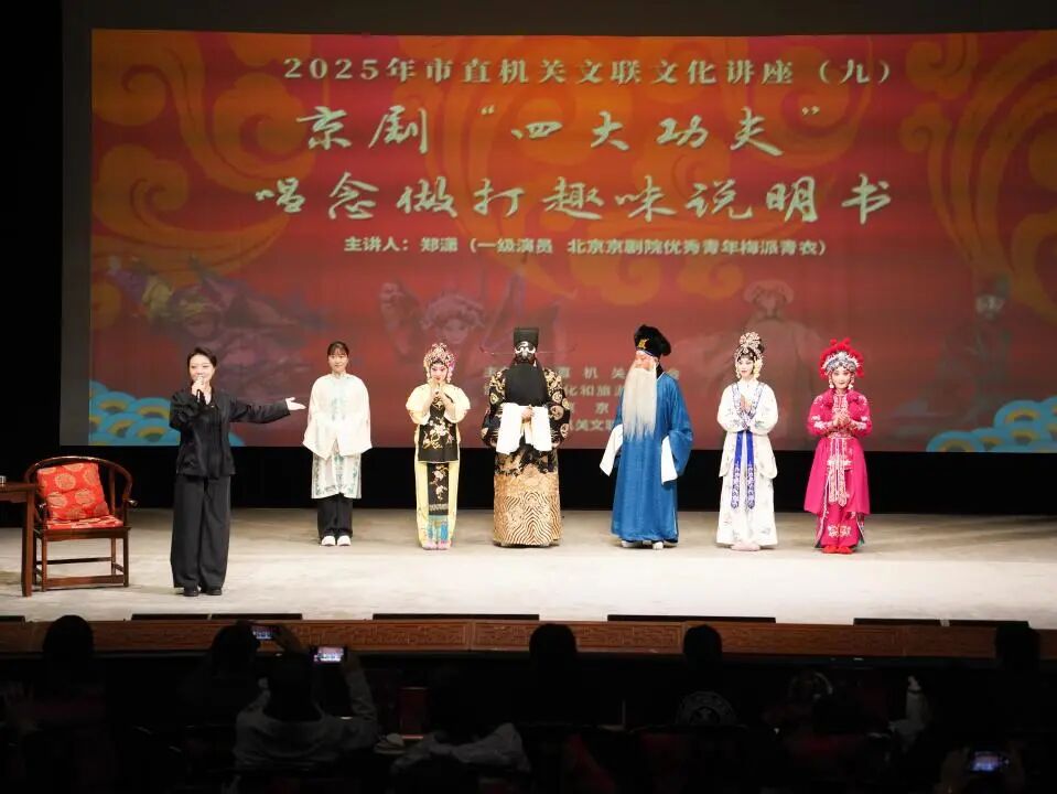 11月23日下午,由市直机关工会主办、市文化和旅游局工会与北京京剧院协办、市直机关文联戏曲分会承办的市直机关文联第九场文化讲座在吉祥大戏院举行。讲座以“京剧‘四大功夫’:唱念做打趣味说明书”为主题,邀请一级演员、北京京剧院优秀梅派青衣郑潇主讲,吸引百余名机关干部职工现场聆听。