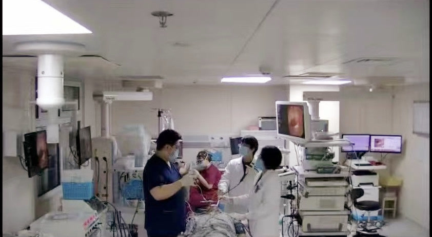时间就是生命!张洁莉主任医师立即通知气管镜室、手术室护士、麻醉科等,紧急将患者转运至气管镜室。19:16,手术开始。