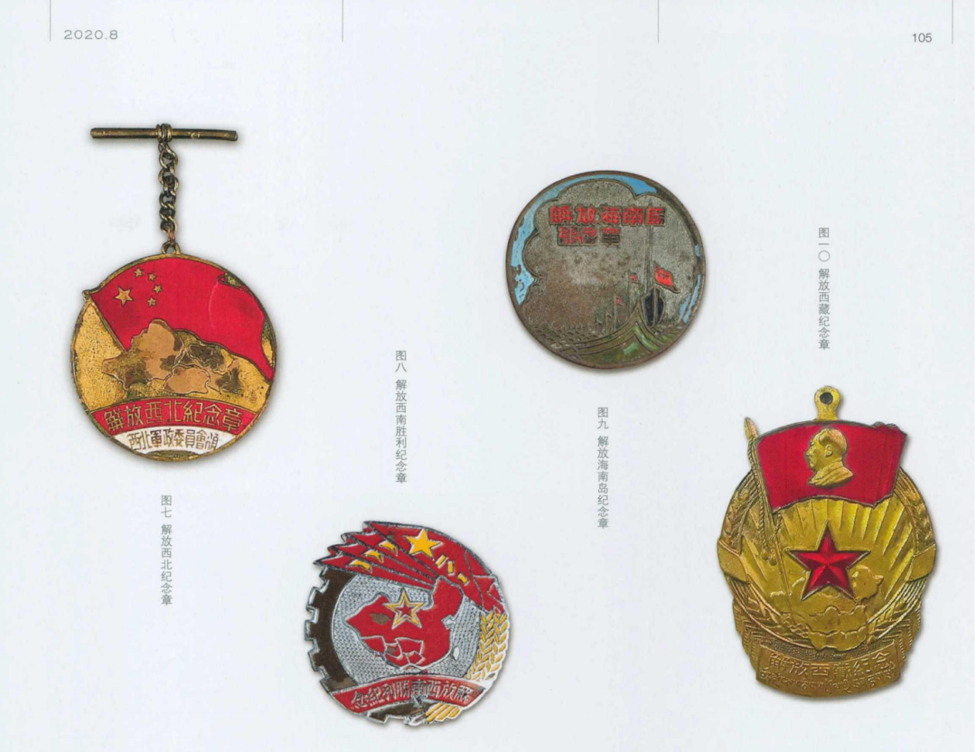 为了表彰奖励在解放大西北中做出贡献的人民解放军官兵,西北军政委员会颁发了“解放西北纪念章”,共50万枚。该纪念章为铜质(图七),章体呈圆形,直径3.5厘米,上方为一面鲜艳飘扬的五星红旗,中间是西北五省区版图(即陕西、甘肃、宁夏、青海、新疆),下方刻有“解放西北纪念章”和“西北军政委员会颁”字样,背面刻有“1950年”及“上海五合制”字样。