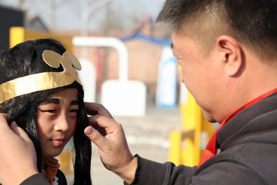 一旁的尹洪营也没闲着,正帮儿子尹梓硕调整武松装扮的红色披风。“腰带再紧点,不然表演时容易松。”他一边说着,一边仔细系好披风上的铜扣。红色披风一扬,引得旁边几个孩子围了过来,8岁的韩正宇睁大眼睛惊叹:“尹梓硕!你这衣服也太威风了!下次我能试试吗?”尹梓硕笑着答应,还顺势摆出一个“武松打虎”的姿势,逗得孩子们哈哈大笑。