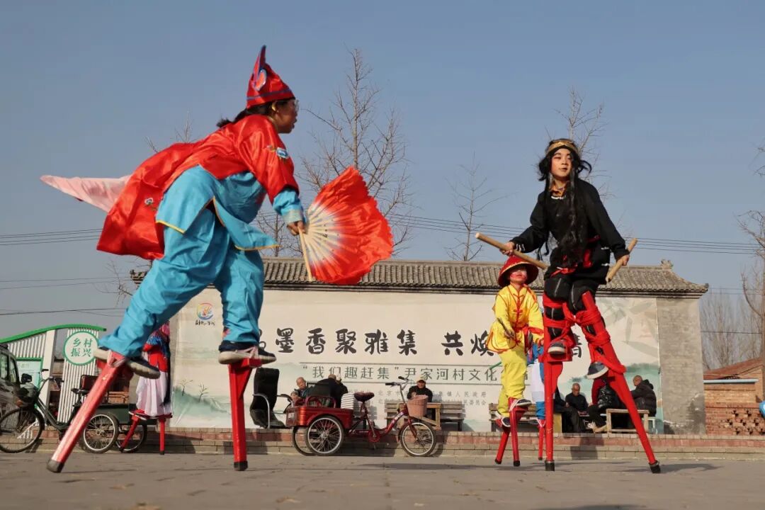 “我们小时候,一到周末就跟着村里的高跷会练习,跟着队伍走街串巷表演,别提多热闹了!”郑辉说,他和尹洪营都是土生土长的尹家河村人,上中学时就加入了村里的高跷会,跟着老人从基础的站立、行走学起,再到难度稍高的转弯、转身,一练就是三四年。“小时候没什么娱乐活动,踩高跷就是最受欢迎的玩法,一放假大家都抢着练。”尹洪营接过话茬,两年前他带儿子看高跷演出,没想到孩子当场就对这门传统技艺产生浓厚兴趣,还主动提出要学。之后尹洪营便利用课余时间陪儿子练习,如今儿子不仅熟练掌握了基础动作,就连倒走、蹲身倒跳等难度较大的动作,也能完成得十分利落。
