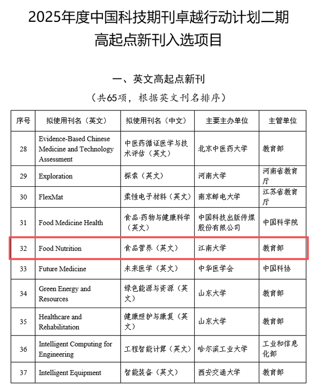 12月5日,中国科协正式公布了2025年度中国科技期刊卓越行动计划二期高起点新刊入选项目。经过严格的专家评审和公示程序,由江南大学主办的英文开放获取期刊《食品营养(英文)》(Food Nutrition)成功入选。这是Food Nutrition在创刊首年获得的一项重要国家级项目支持,标志着期刊的学术定位与发展潜力获得学界与科技出版界的高度认可。