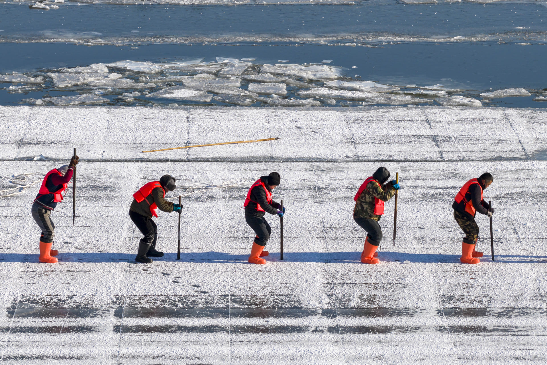 工人在松花江哈尔滨段采冰,运往冰雪大世界园区等地用于景观建设。新华社记者 张涛摄