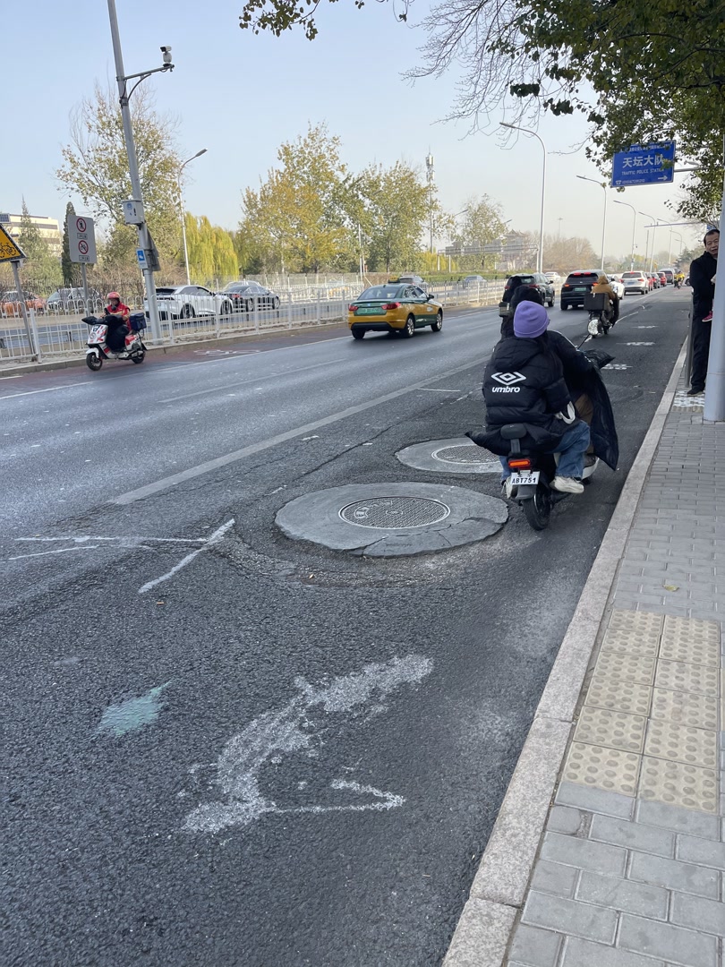 还有市民反映,在永定门西滨河路南侧的永定门西公交站前,非机动车道存在坑洼问题。只见3个井盖位于非机动车道中央,西侧的井盖边缘已经碎裂,露出了下方的混凝土基座,部分基座也已碎裂,坑洼处出现碎石;中间与东侧的井盖周围沥青填补层鼓起,与路面形成了一道“台阶”。正在公交站台候车的一位乘客说:“井盖边缘与路面的落差最高处足有两三厘米,井盖俨然成了绊脚石,我看着骑车人飞驰而过,都替他们捏一把汗。”记者见到一位骑电动车的女士贴着井盖边缘通过,车筐里的东西被颠得“哐当”响。在她身后,一辆外卖配送电动车赶紧刹车减速,车轮碾过井盖旁的破损路面时,车身猛地一颠,骑手连忙往后伸手扶了扶后座上的餐箱。