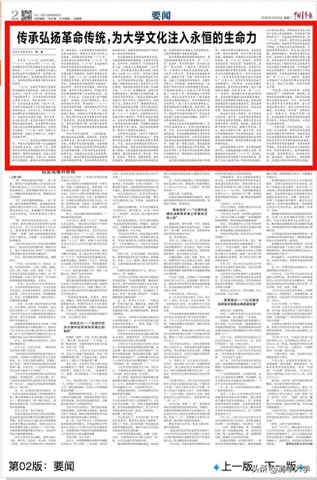 2025年12月9日,《中国青年报》刊发清华大学党委书记邱勇的署名文章《传承弘扬革命传统,为大学文化注入永恒的生命力》。文章根据作者在清华大学纪念“一二·九”运动90周年、“一二·一”运动80周年座谈会上的讲话整理。文章指出:今年是“一二·九”运动90周年、“一二·一”运动80周年。在中国人民争取国家独立、民族解放的壮阔历史上,这两场爱国运动都是可歌可泣的不朽篇章。在这两场伟大的爱国运动中,清华都英勇站在斗争最前列,发挥了重要的主导作用。革命传统是大学文化中最鲜亮的组成部分,学习革命前辈的崇高精神、传承弘扬革命传统,才能为大学文化注入永恒的生命力。全文如下: