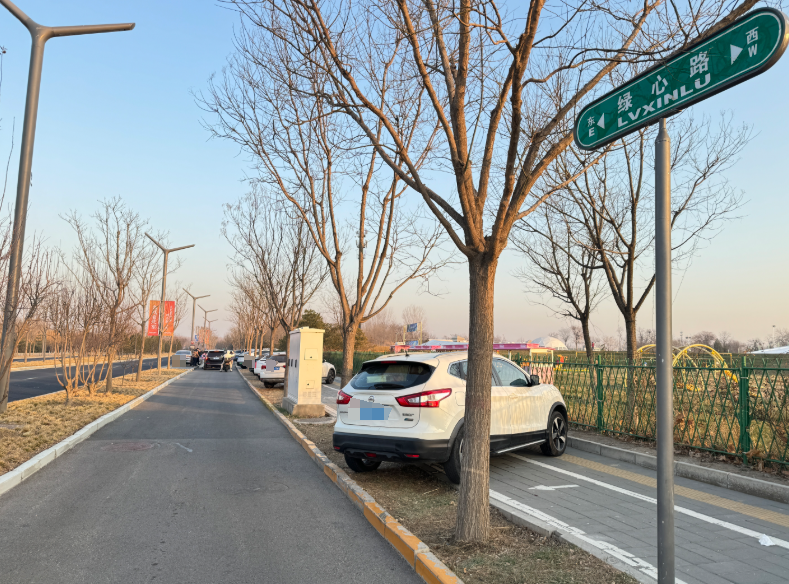 12月6日,记者在通州区奇趣多•绿野森林乐园门口看到,绿心路南北两侧的人行道边,画有鲜明的黄色禁停标线,但还是有不少车辆从坡道处轧着树坑,开上人行道的台阶。绿心路南侧,有10余辆私家车斜停在路侧的人行道上,车轮下就是盲道。有些车身上落满枯叶和泥土,显然已经停了不少时日。