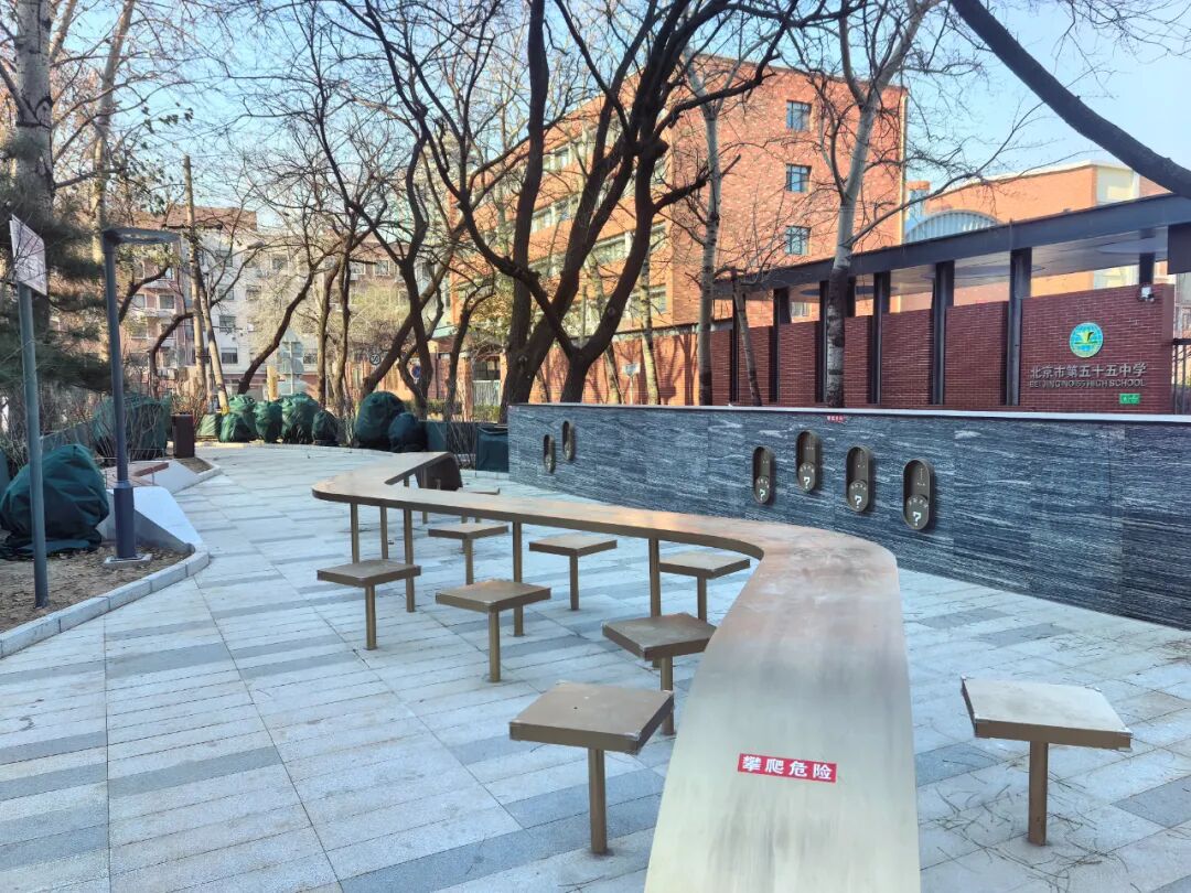 在北京市第五十五中学南门前,全新亮相的成长广场成为家长与学生们的“心头好”。每天放学时分,这里便热闹起来,崭新的长桌两侧设置有10张座椅,家长们可坐在这里休息等候。学生家长李女士说:“以前等孩子放学,只能在路边站着,现在有了专属的家长等候区,能坐着歇脚,还能和其他家长交流育儿经验,太贴心了。”广场一侧的科普标识景观墙更具巧思,内侧是北京市花科普互动体验区,外侧是图文并茂的“花植识趣”科普墙。“油松是中国特有的树种,在北方有防风固沙、防止水土流失的作用呢。”放学的学生们围在墙边,一边驻足观看,一边相互讨论,让放学时光变得富有知识性与趣味性。