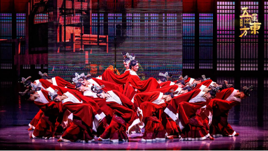 凸显新意又恰到好处的舞蹈编排是舞剧《五星出东方》的一大亮点。剧中集纳了丰富多样的舞蹈语汇,精绝城中充满西域色彩的夜宴“灯舞”可以找到民族舞的影子,精绝集市中各族人民共同起舞的“蹦迪”舞段,又仿佛是街舞和踢踏舞的混合呈现,“锦绣”中展现出的提袖折腰又属于古典舞的范畴,各式各样的舞段精彩绝伦,让人意犹未尽。不同舞种轮番亮相,既有各自鲜明的艺术特色,又与剧情发展自然融合,被认为是中国舞剧的一次全新尝试和探索。