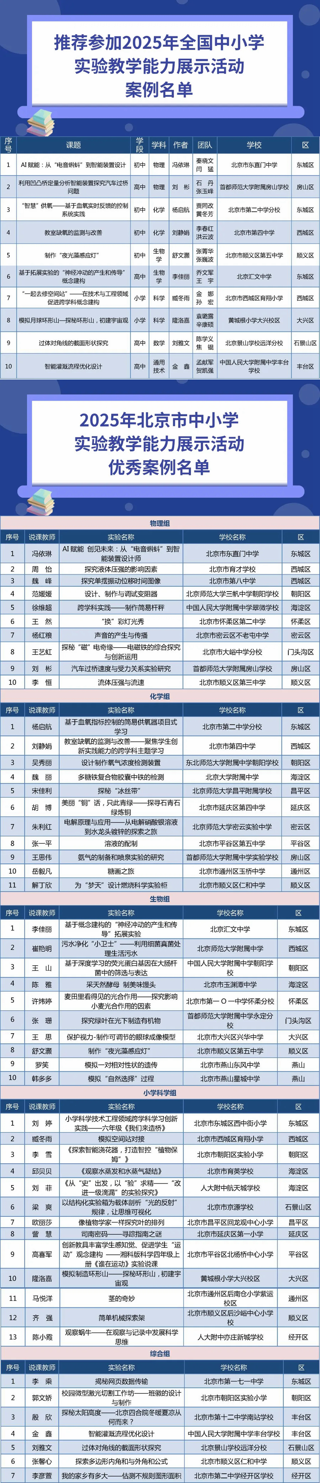 根据2025年北京市中小学实验教学能力展示活动安排,经区级遴选推荐、市级评选,全市各区遴选推荐的51个案例获评市级优秀案例,其中,择优推荐10个案例参加2025年全国中小学实验教学能力展示活动。