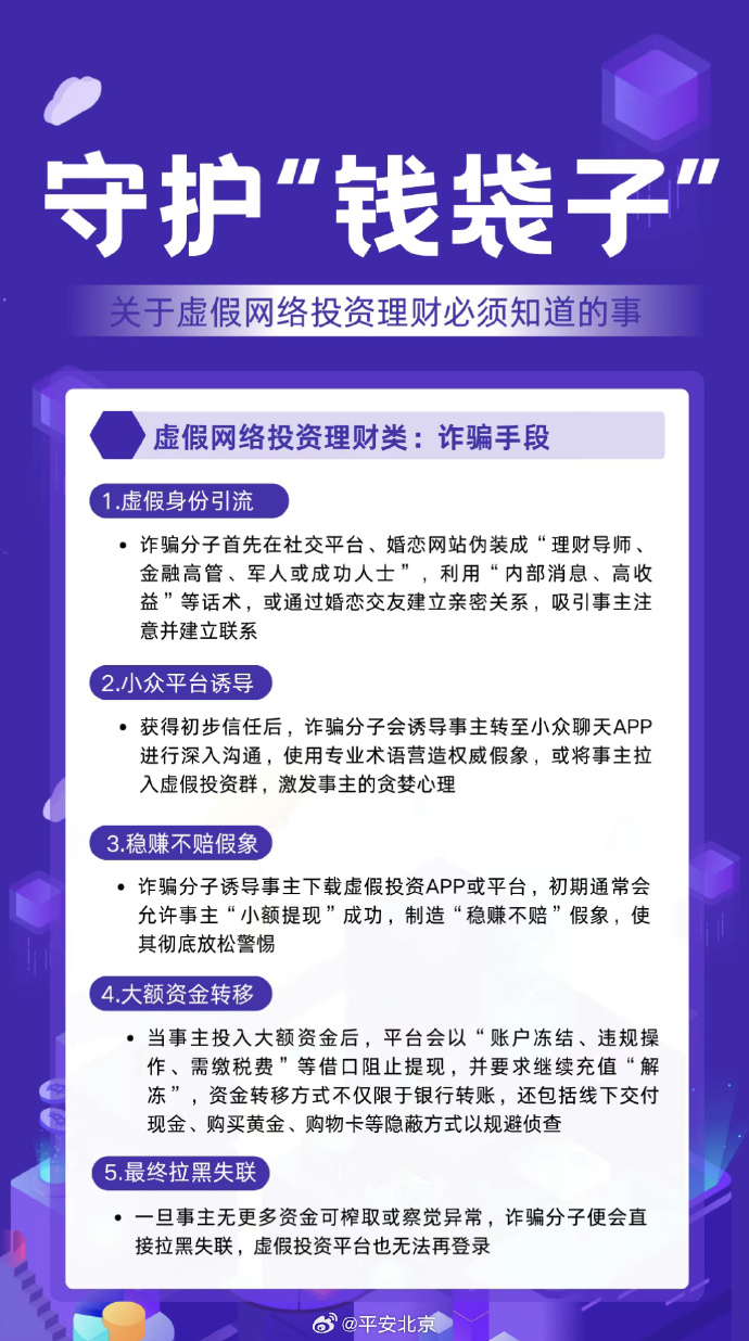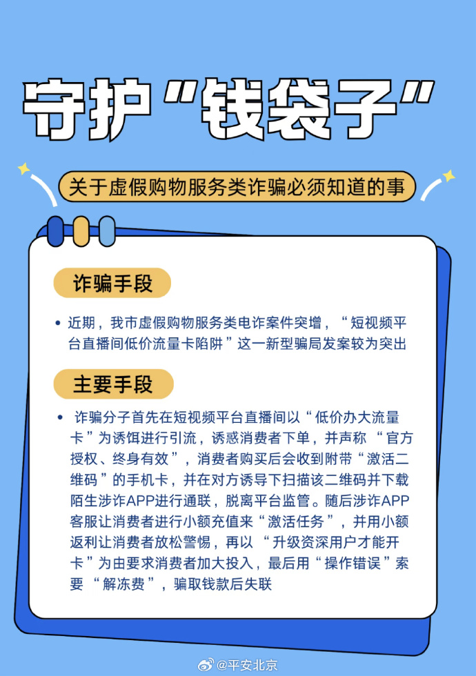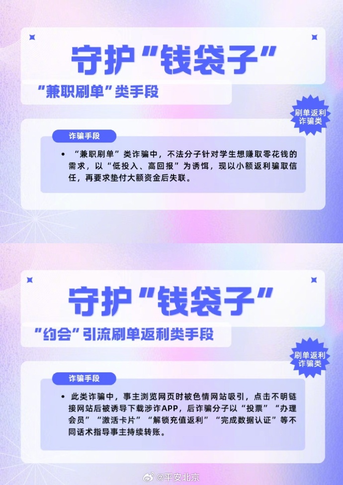 注意!年终岁末诈骗高发期已至,四类骗局专盯你的“钱袋子”!想靠理财赚钱?虚假平台可能让你血本无归;担心“百万保障”关闭影响APP使用?冒充机构 “取消服务” 全是诈骗;想靠刷单赚零花钱?小额返利后必是大额失联;短视频平台直播间买低价流量卡?错误操作可能货财两空。骗子踩着岁末需求精准设套,稍有疏忽就会中招!