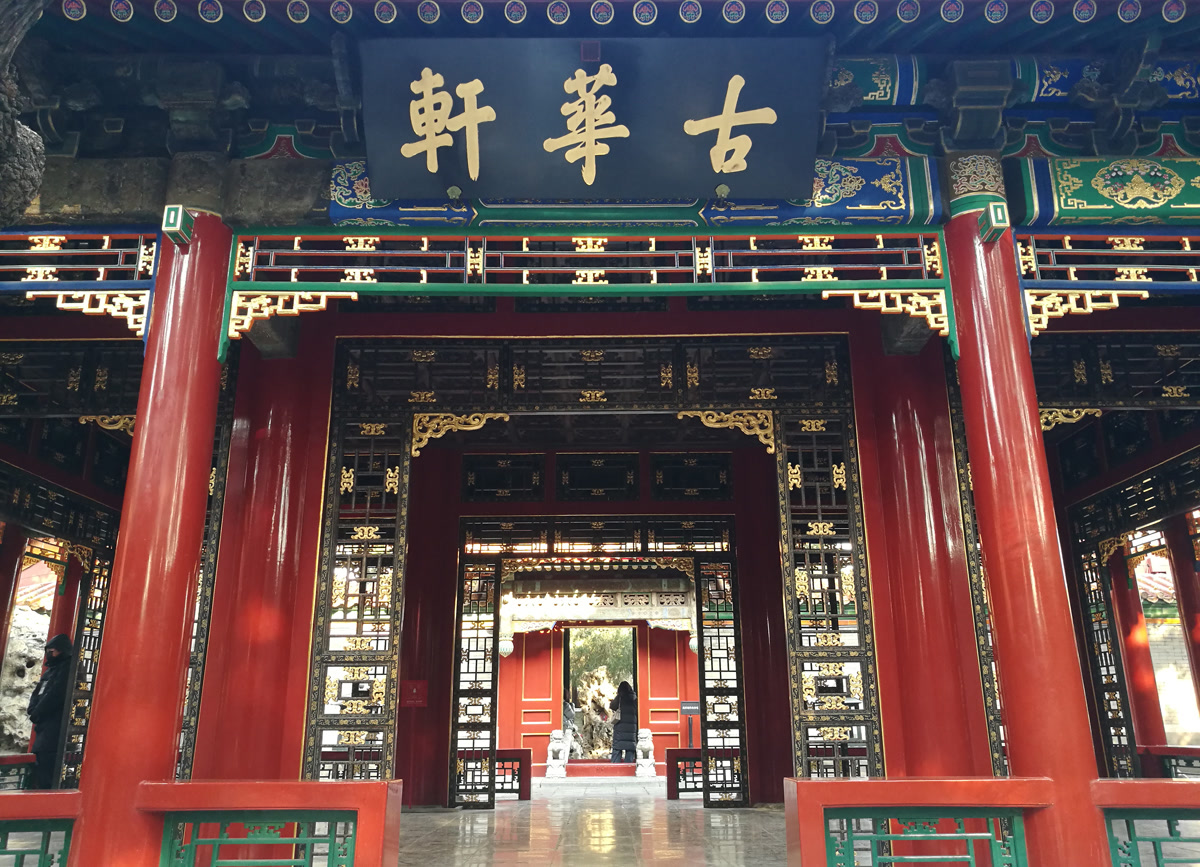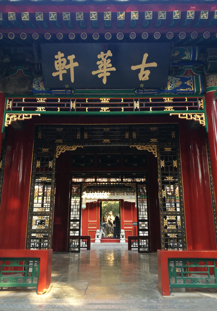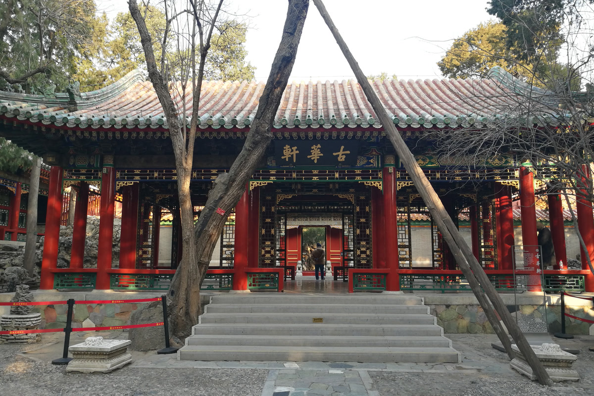 乾隆花园的入口,叫衍祺门。衍祺门面阔三间,卷棚硬山顶,黄琉璃瓦绿剪边,门内有假山为影壁。穿过假山,走进第一院落,迎面看到的就是一进院的主体建筑――古华轩,轩名来源于轩前的一棵古楸树。每年4月中旬,淡紫色的花朵如云霞般铺满枝头,乾隆皇帝曾坐在轩内,欣赏这如画美景。