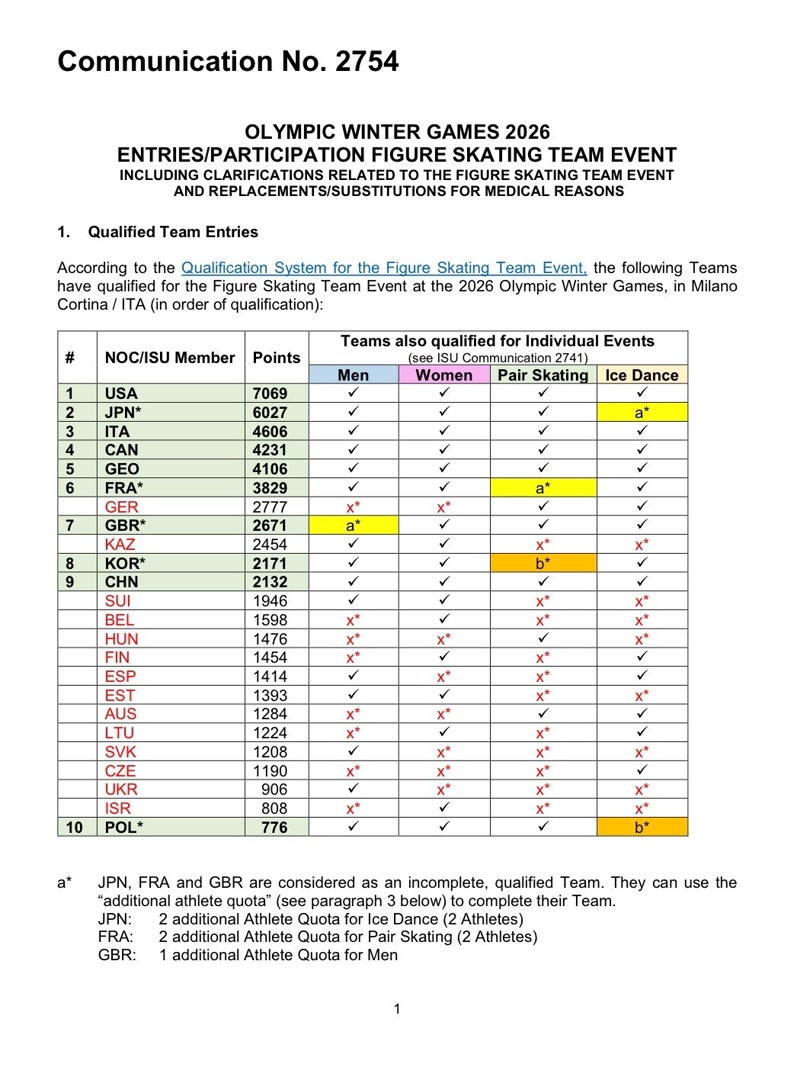 随着最后一项团体赛积分赛——世界花样滑冰大奖赛总决赛上周末在日本结束,北京时间12月10日,国际滑联正式确认了获得2026年米兰冬奥会花样滑冰团体赛的国家或协会名单。中国队作为五个四单项皆有选手入围冬奥会的国家之一,毫无悬念收获团体“门票”,将全项目参加米兰冬奥会。
