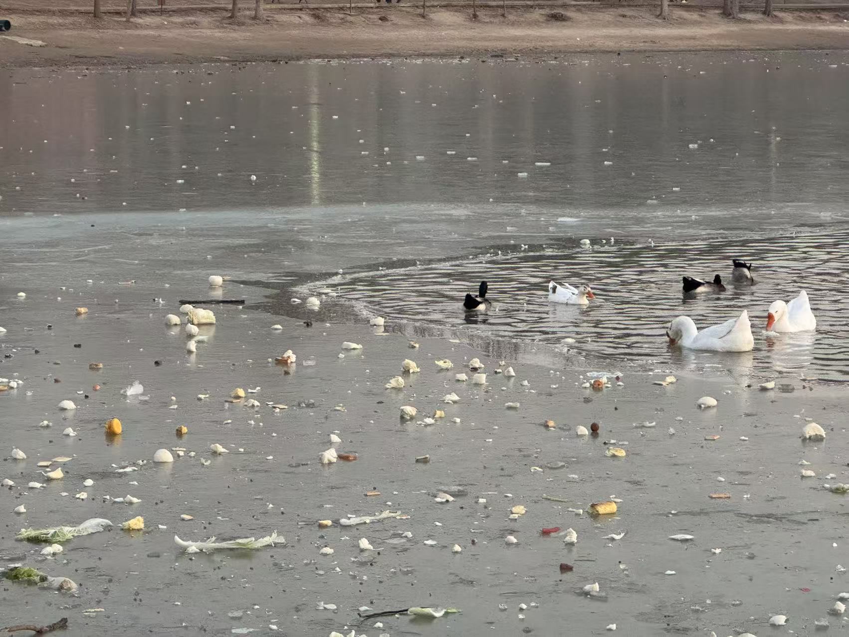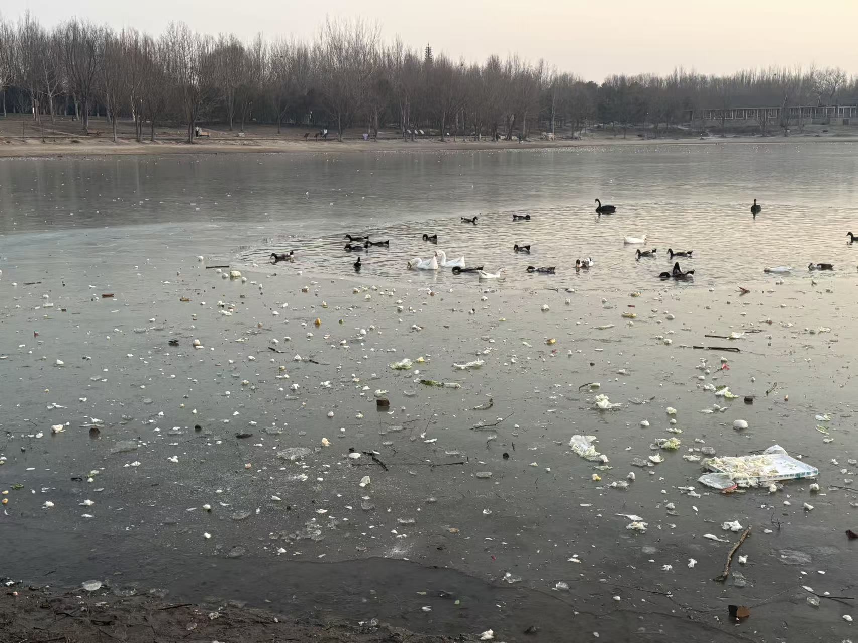 在南海子公园鹿鸣海东岸旁,约40只天鹅聚集在冰面环绕的水域间。它们脖颈修长,眼神灵动,不时低头啄食。记者看到,岸边聚集了三四十位游客,他们一边观赏,一边拿着菜叶子、面包、馒头等食物,撕碎后用力扔向天鹅。在靠近岸边约200平方米的冰面上,零零碎碎散落着数百块食物碎屑,看上去十分脏乱。记者通过相机镜头仔细分辨,发现其中不少面包、馒头和菜叶子甚至都没有掰碎,一块块、一片片“躺在”冰面上。除南海子公园外,不少市民反映在玉渊潭公园和奥森公园投喂野鸭、大雁的游客也不少。