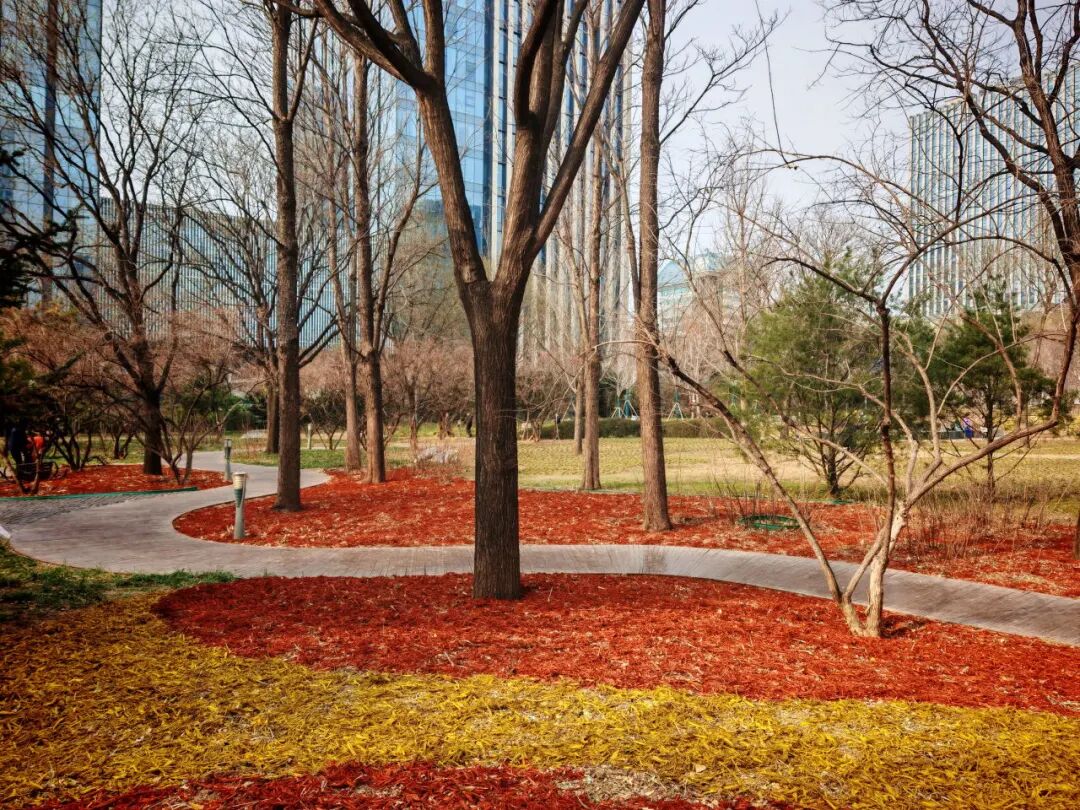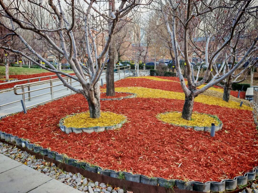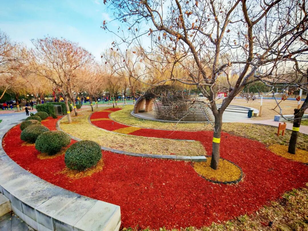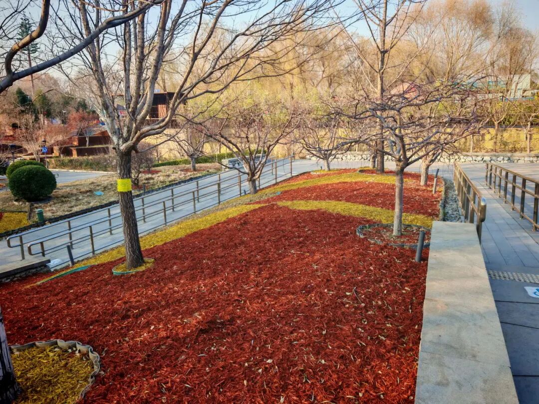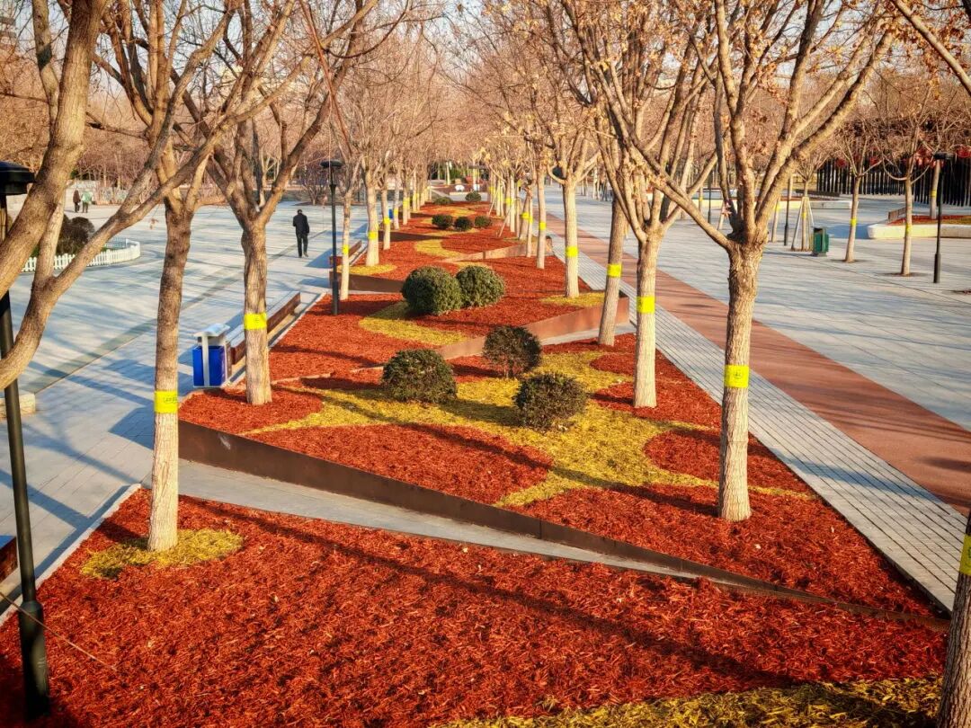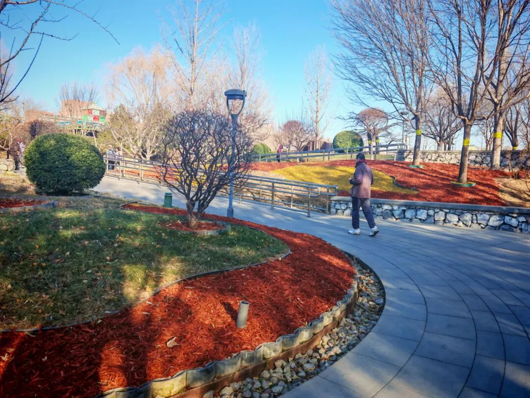 不仅如此,天然树皮还具有天然的吸附性,能有效抑制地表扬尘,从而进一步改善局部空气质量。这一“一材多效”的创新做法,不仅精准满足了植物冬季养护的需求,更从景观美化与环境净化两个维度,同步提升了公园的整体品质,为市民在冬日里营造出一个更为舒适、健康且宜人的公共休闲空间。