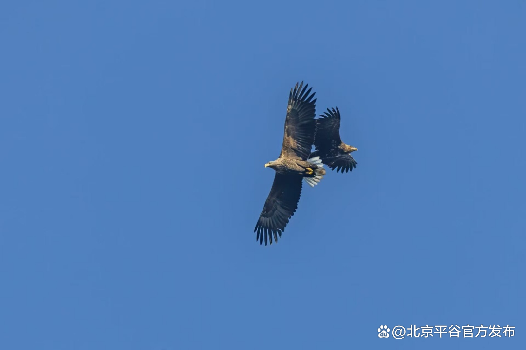 这并非偶然邂逅。12月3日,平谷区(市级)陆生野生动物疫源疫病监测站在西峪水库监测到伴飞的白尾海雕2只,随后黄松峪水库、金海湖也相继监测到3只,单日监测总量达5只,较历年同期水平显著偏高。自20世纪90年代起,平谷已连续三十余年监测到白尾海雕的身影,独特的地理环境与稳定向好的自然生态,让这里成为它们冬季栖息的“优选之地”。