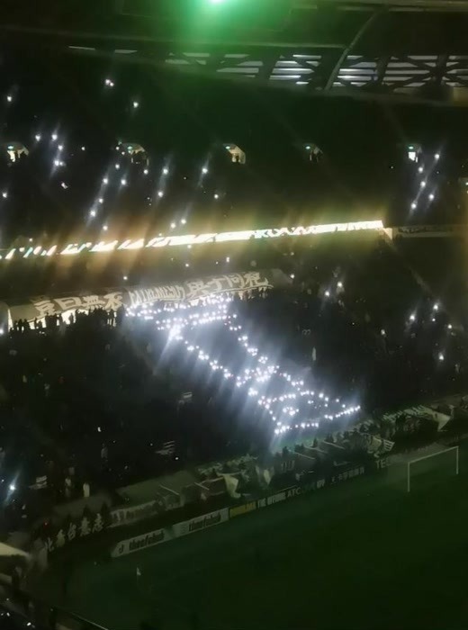 北看台上的死忠球迷组织御林军从开场就亮出绝活——由于赛事主办方亚足联拒绝了国安队在比赛期间展示冠军奖杯的请求,球迷们在看台上用手机闪光灯拼出了足协杯奖杯的图案,以此向球队致敬。