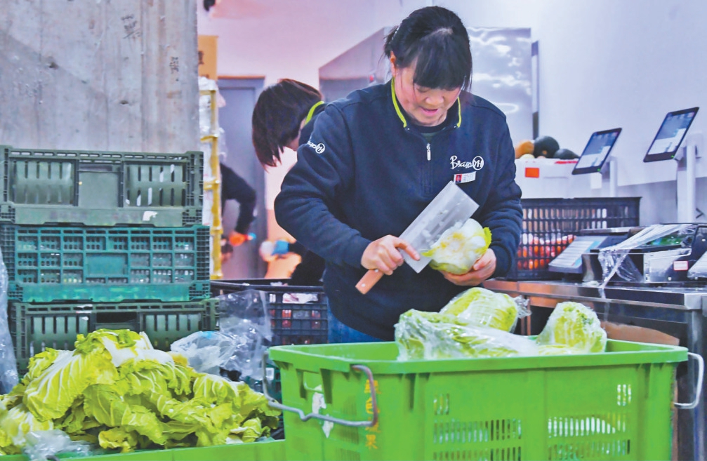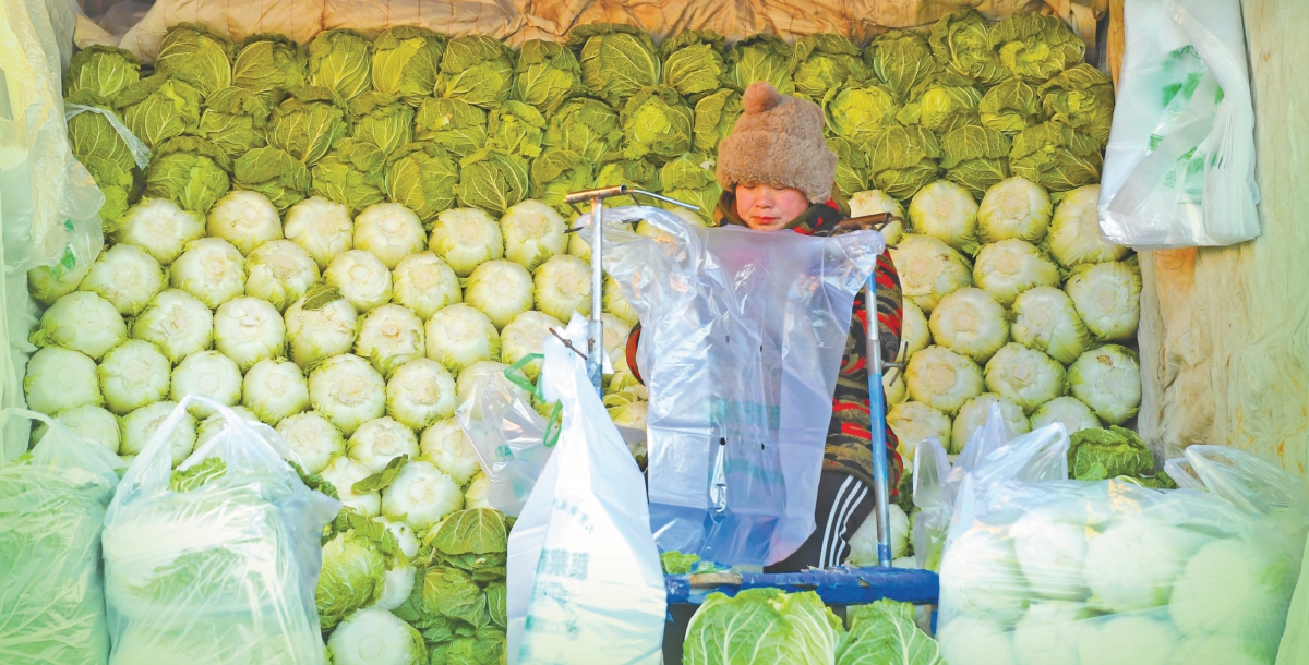 在新发地农产品批发市场,白菜作为冬储菜顶流,被装袋分销