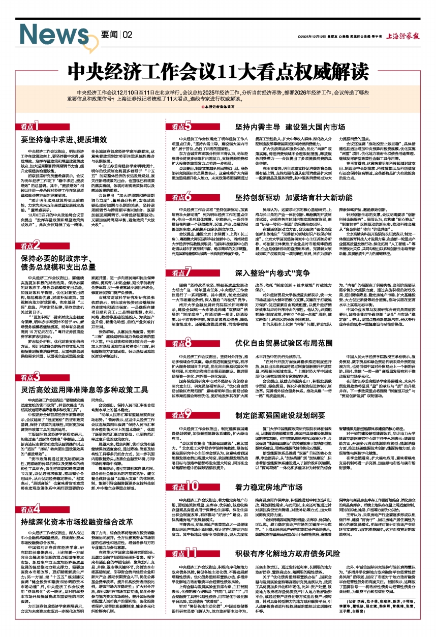 中央经济工作会议12月10日至11日在北京举行。会议总结2025年经济工作,分析当前经济形势,部署2026年经济工作。会议传递了哪些重要信息和政策信号?上海证券报记者梳理了11大看点,连线专家进行权威解读。