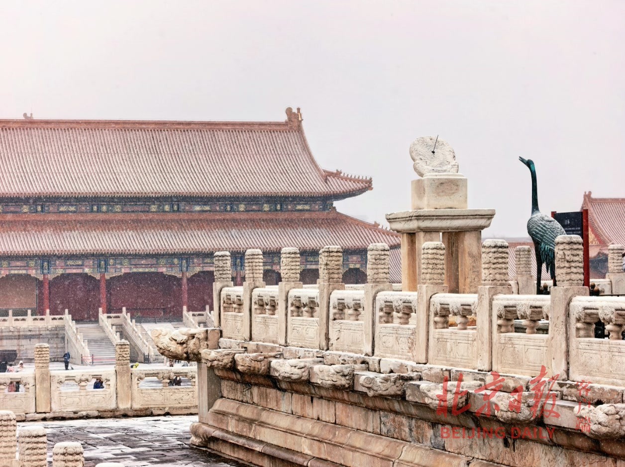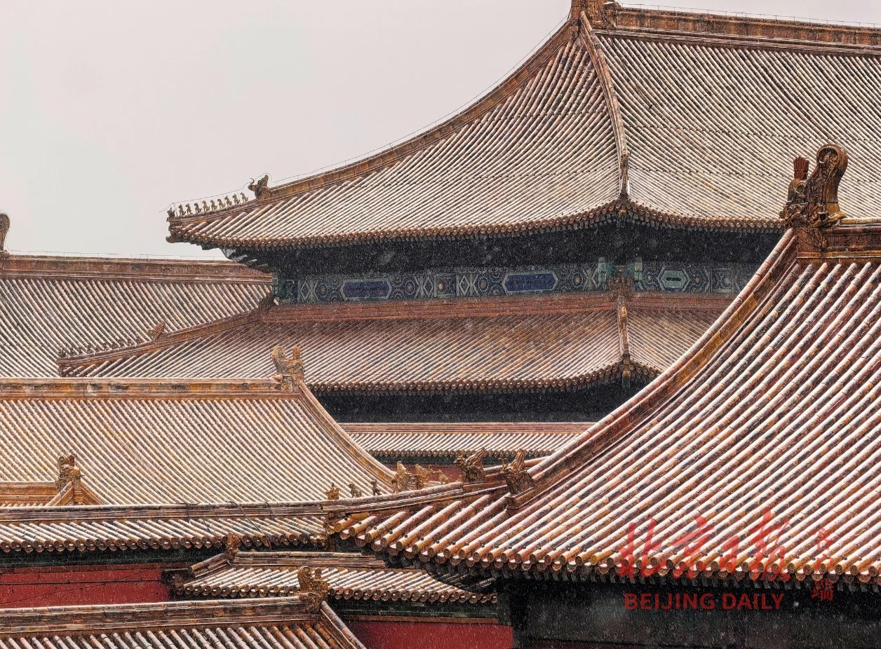 雪花落到紫禁城,自带背景音,淋漓尽致地展现中式浪漫。朱红色的宫墙、金色琉璃瓦……纷纷洒洒的白雪给饱和度高的紫禁城加了一层天然滤镜,为严肃的大殿添了一抹温度。