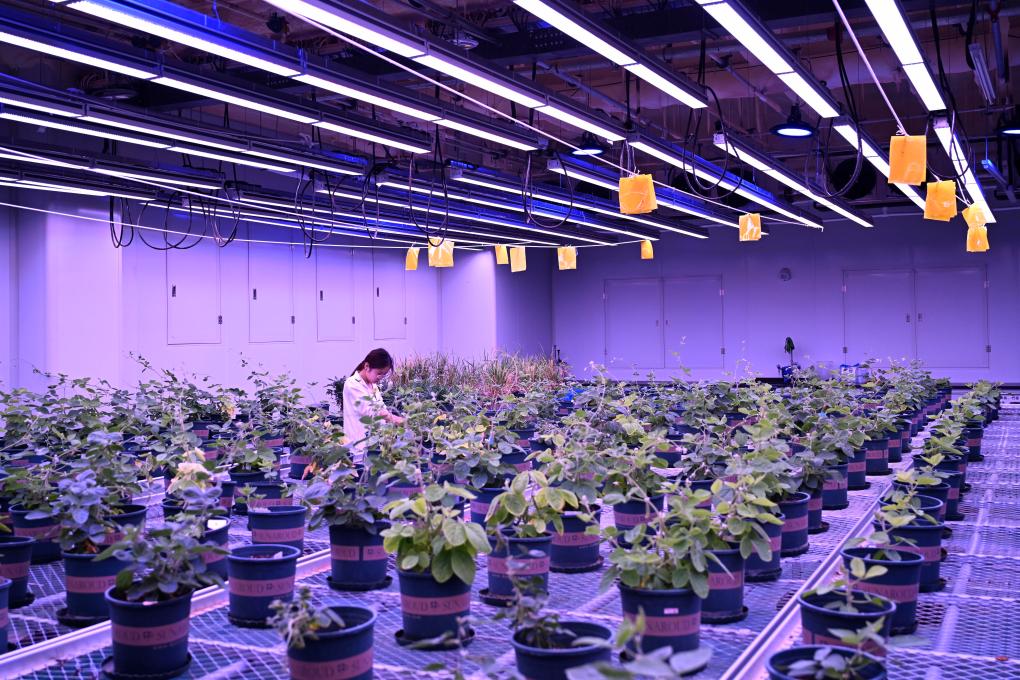 2025年7月6日,研究人员在位于安徽宿州的黄淮海(宿州)种业科技谷南京农业大学大豆生物育种中心人工气候室查看大豆长势。新华社记者 黄博涵 摄