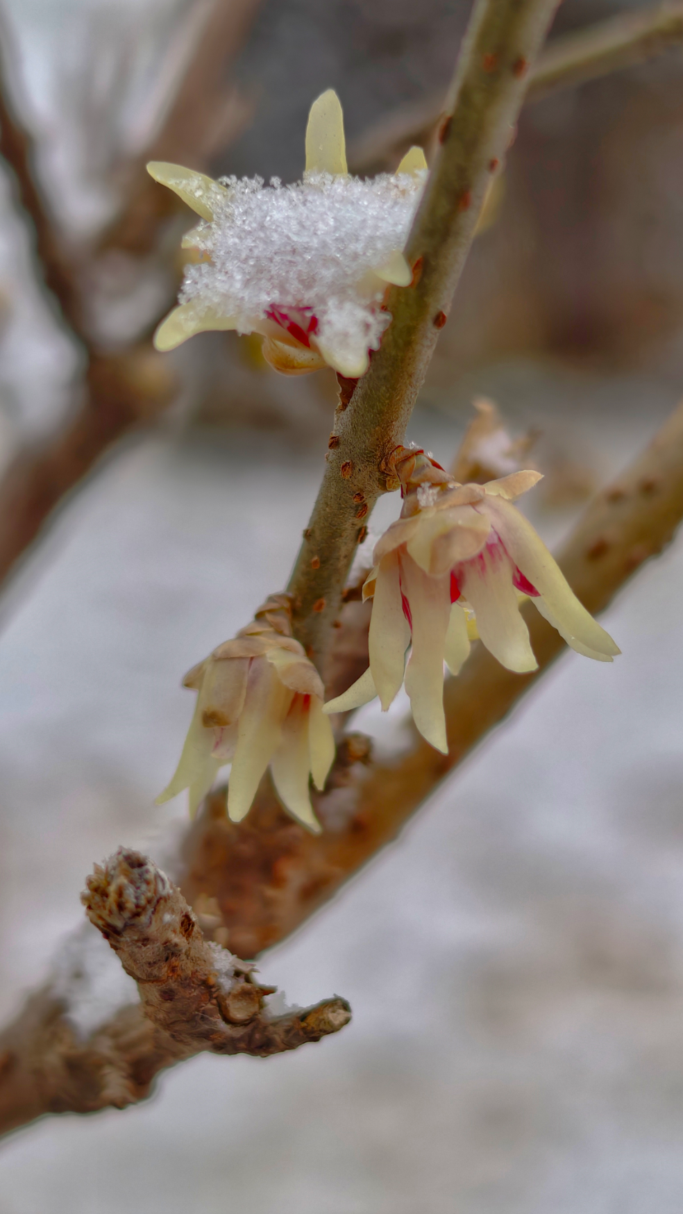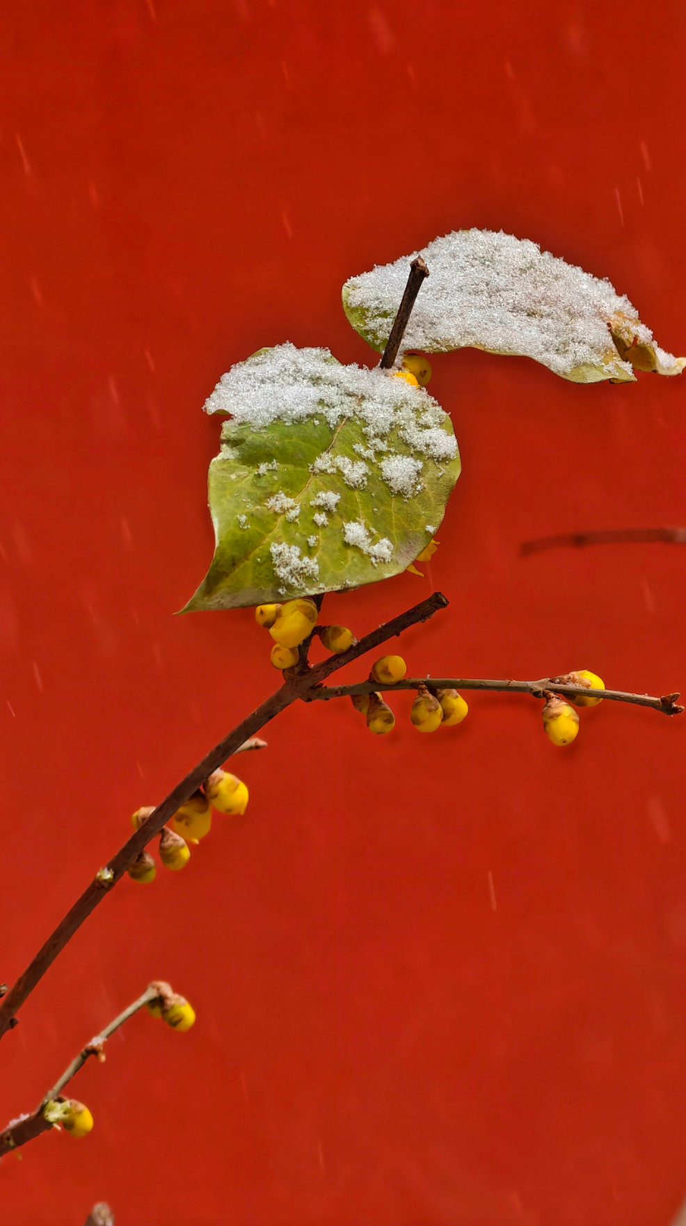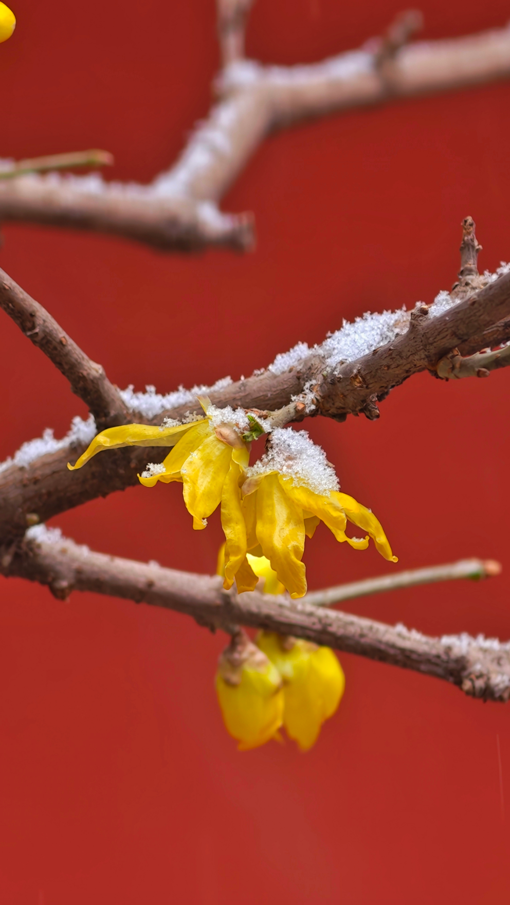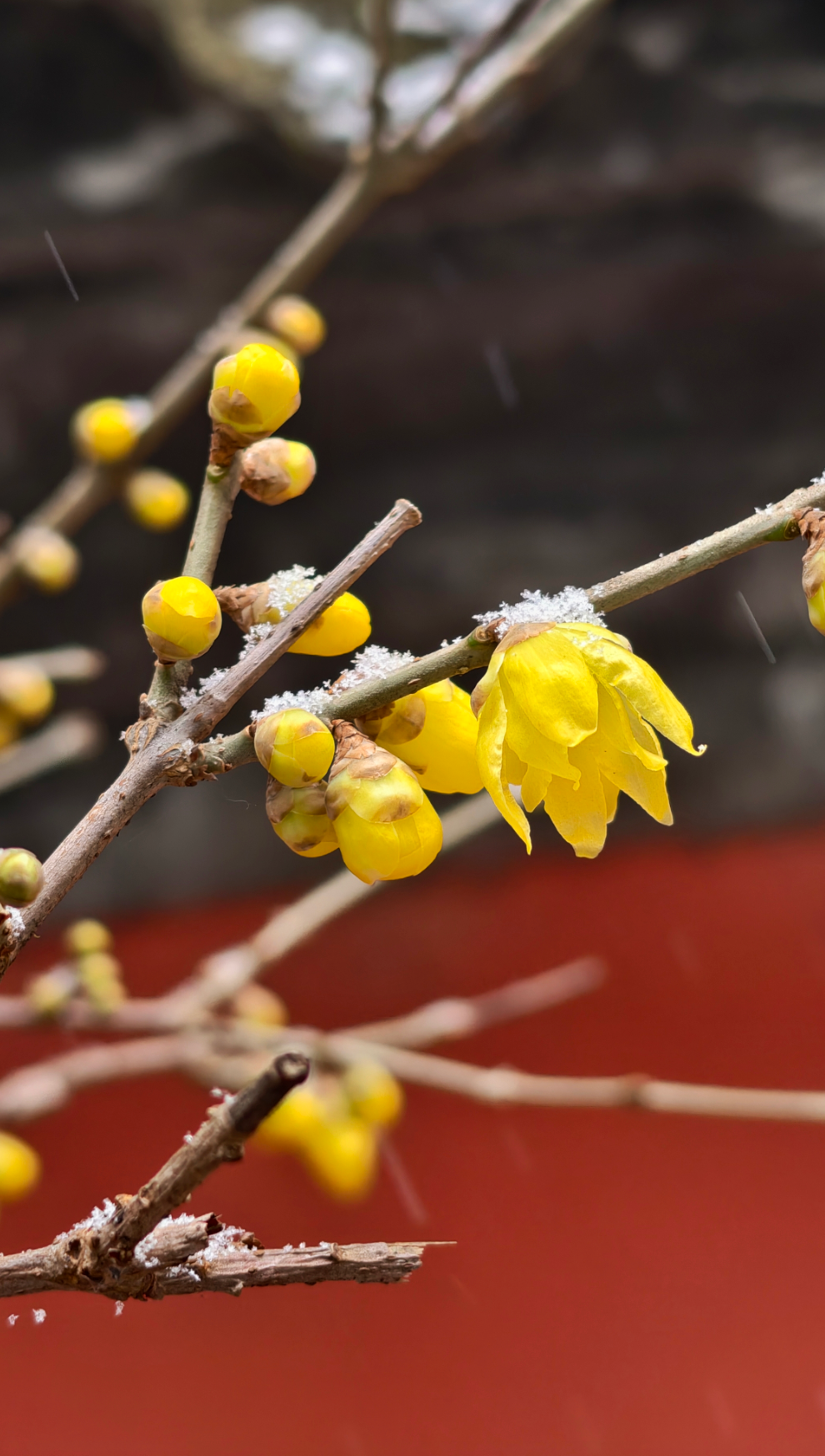 雪落古刹,卧佛寺的腊梅在寒冬绽放,细密的雪絮轻覆枝头,给金黄的花瓣缀上一层朦胧白霜,绘就一幅独有的清雅画卷。
