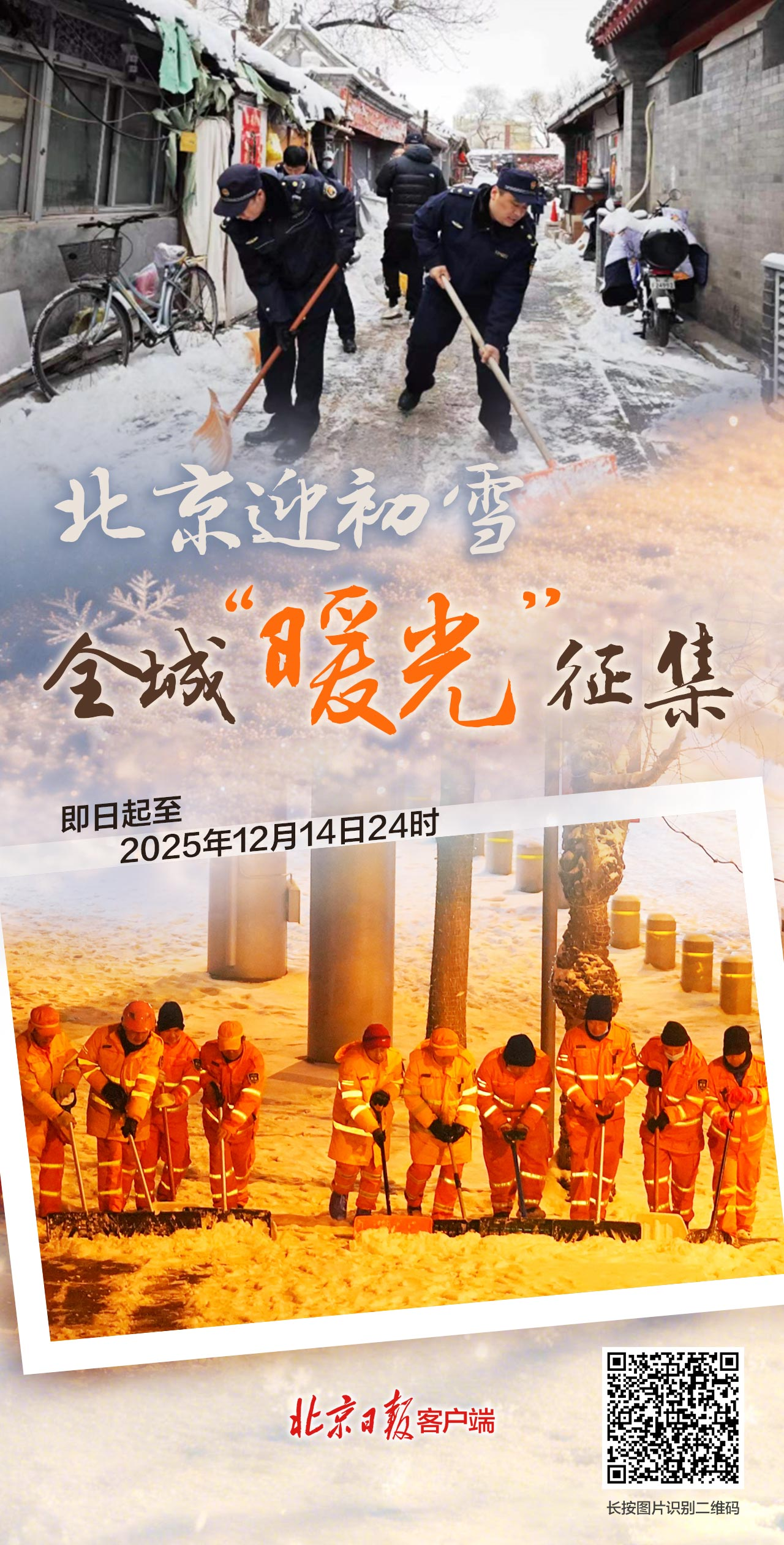 点击海报直接参与,或者扫码进入“京城拍客”小程序,参与话题“首场降雪最暖身影”进行投稿,点赞数前20名的作品可获得北京日报客户端精美文创礼物。结果将于2025年12月16日在北京日报客户端公布。