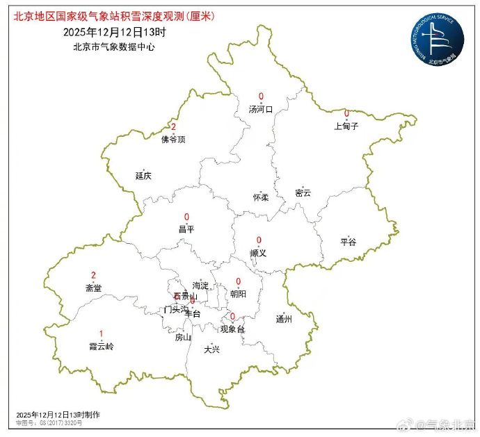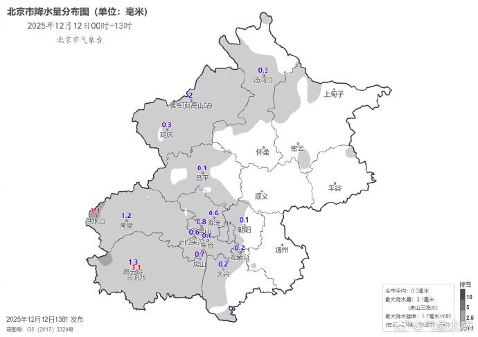 今天中午开始降雪逐渐加强,城区出现明显降雪,截至13时,全市平均0.3毫米,城区平均0.3毫米,最大降水量在门头沟洪水口3.1毫米,最大积雪深度在延庆佛爷顶和门头沟斋堂2厘米。
