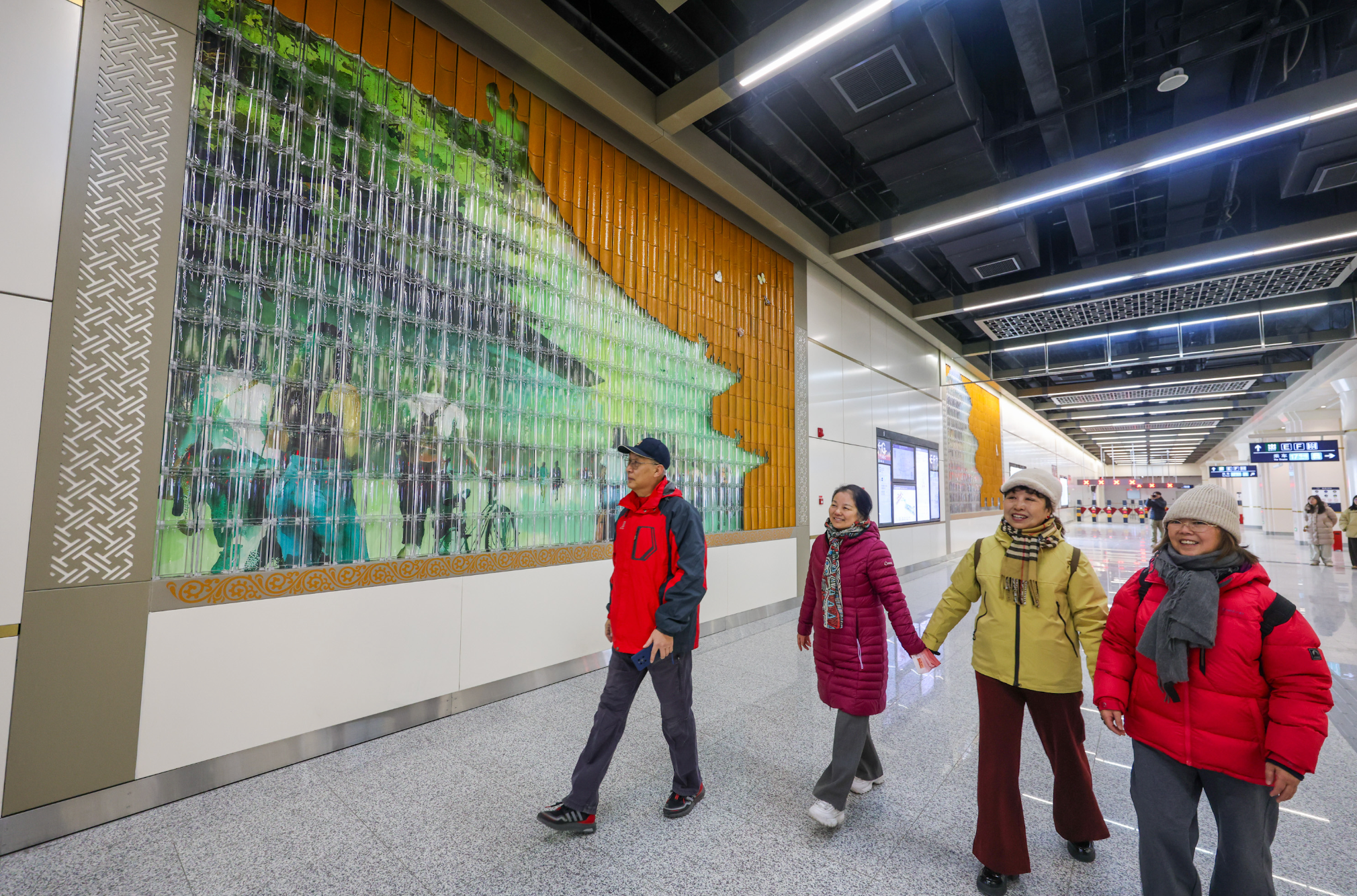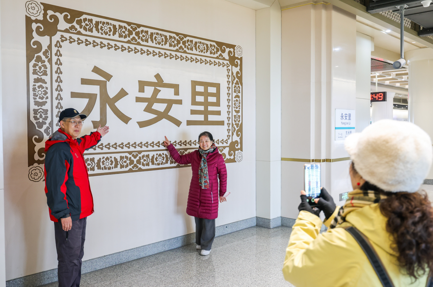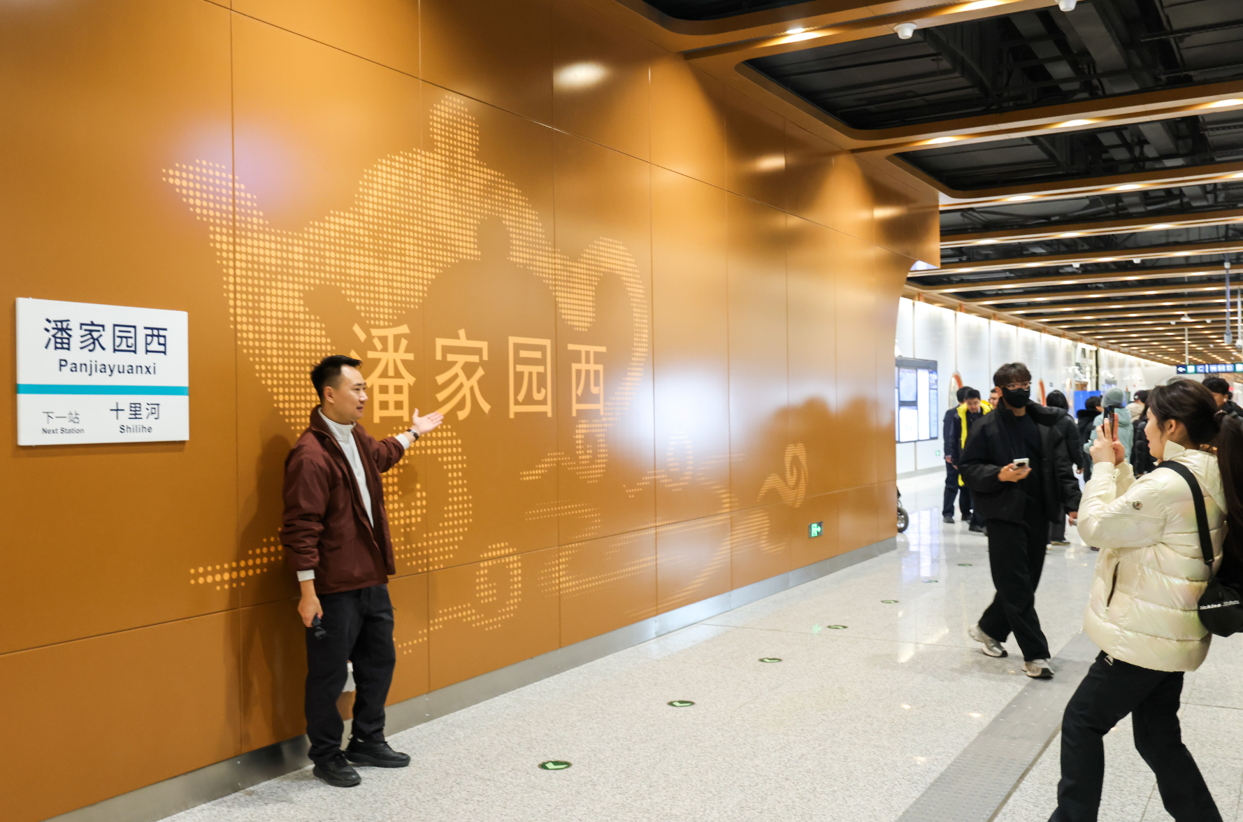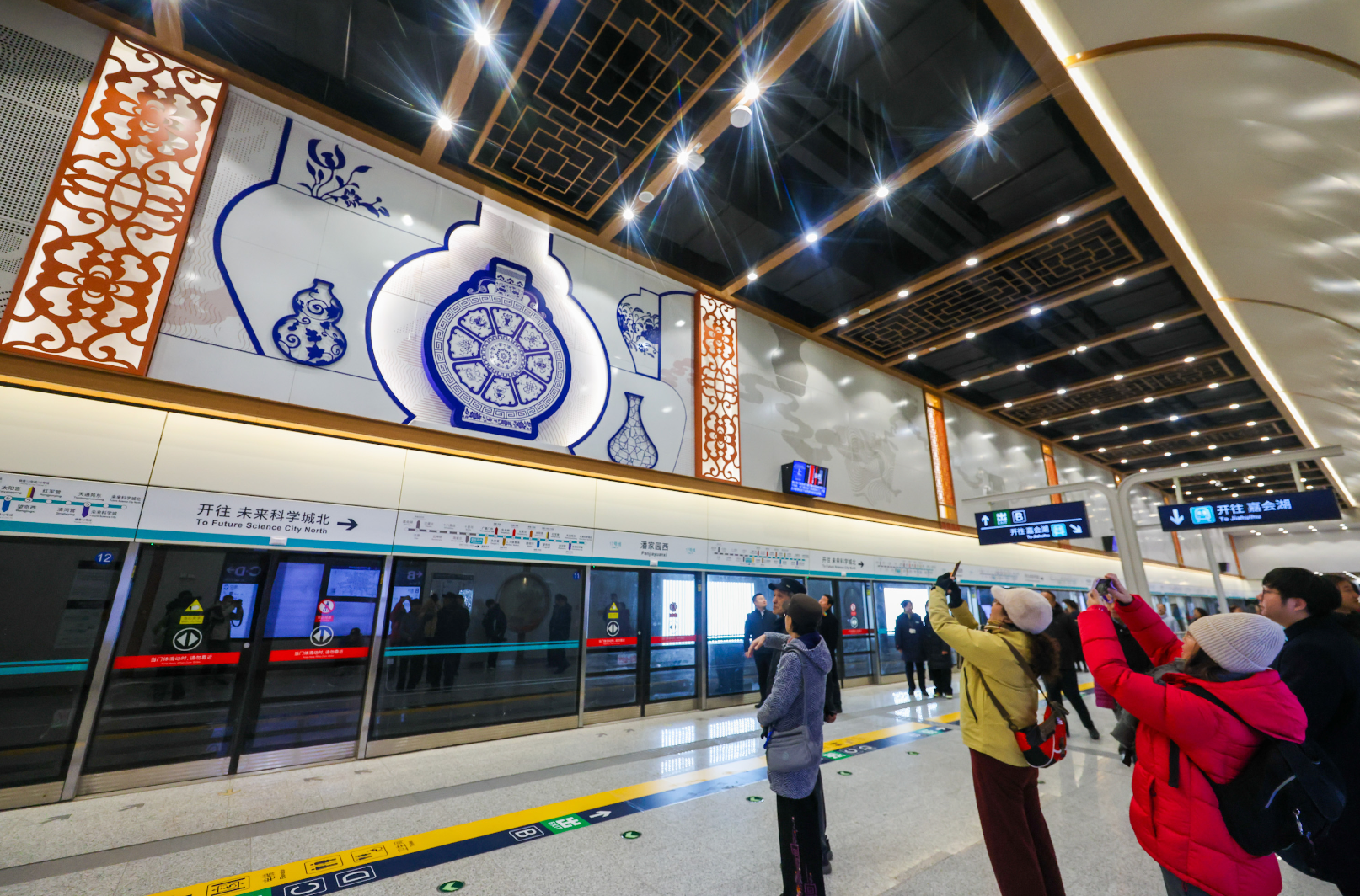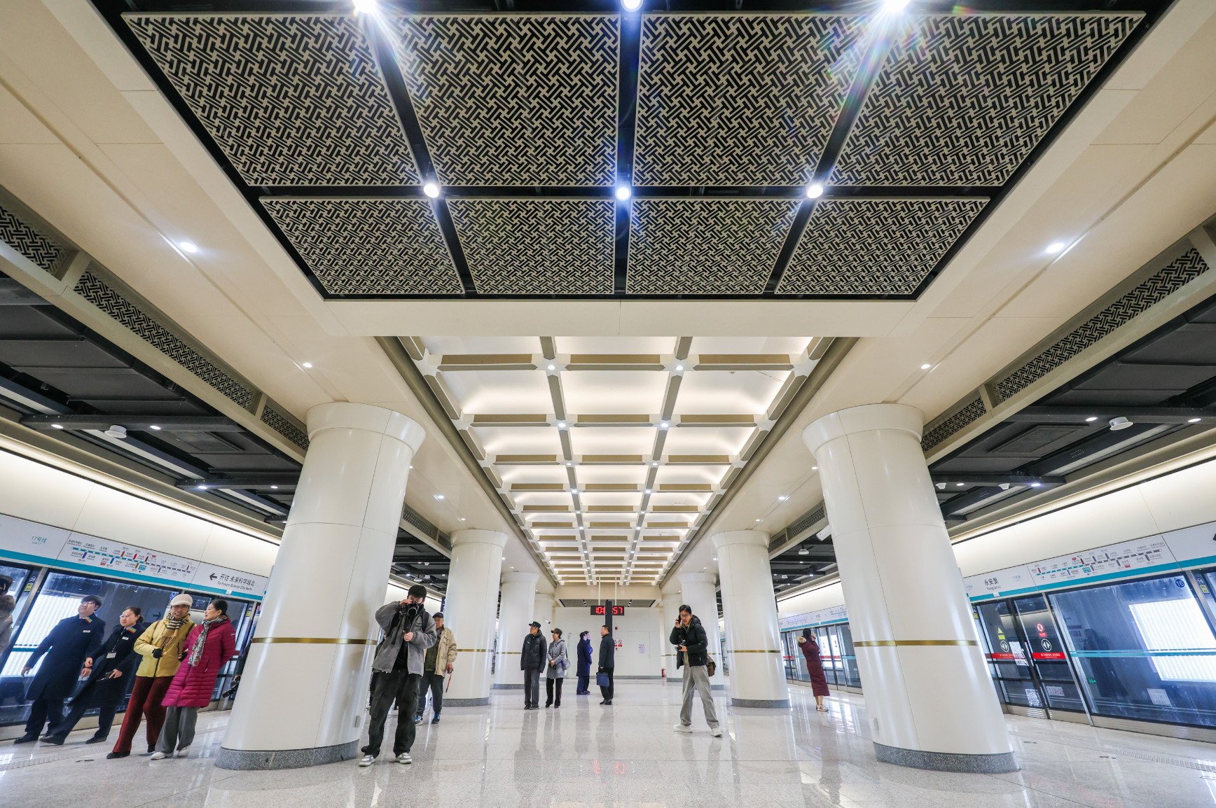 新站颜值高、有看点。永安里站装修采用新中式风格,以米色为主色调,衬以褐色线条与顶部藻井造型,展现中式空间之美。站内布置“东方之韵”主题壁画,琉璃瓦片、古建筑剪影上墙,展现古都文化底蕴与都市活力。潘家园西站则结合结构空间特点及周边地域文化元素,布置了大量的古画、花格等艺术品,站台门上方还嵌入精美的“青花瓷”,让人眼前一亮。