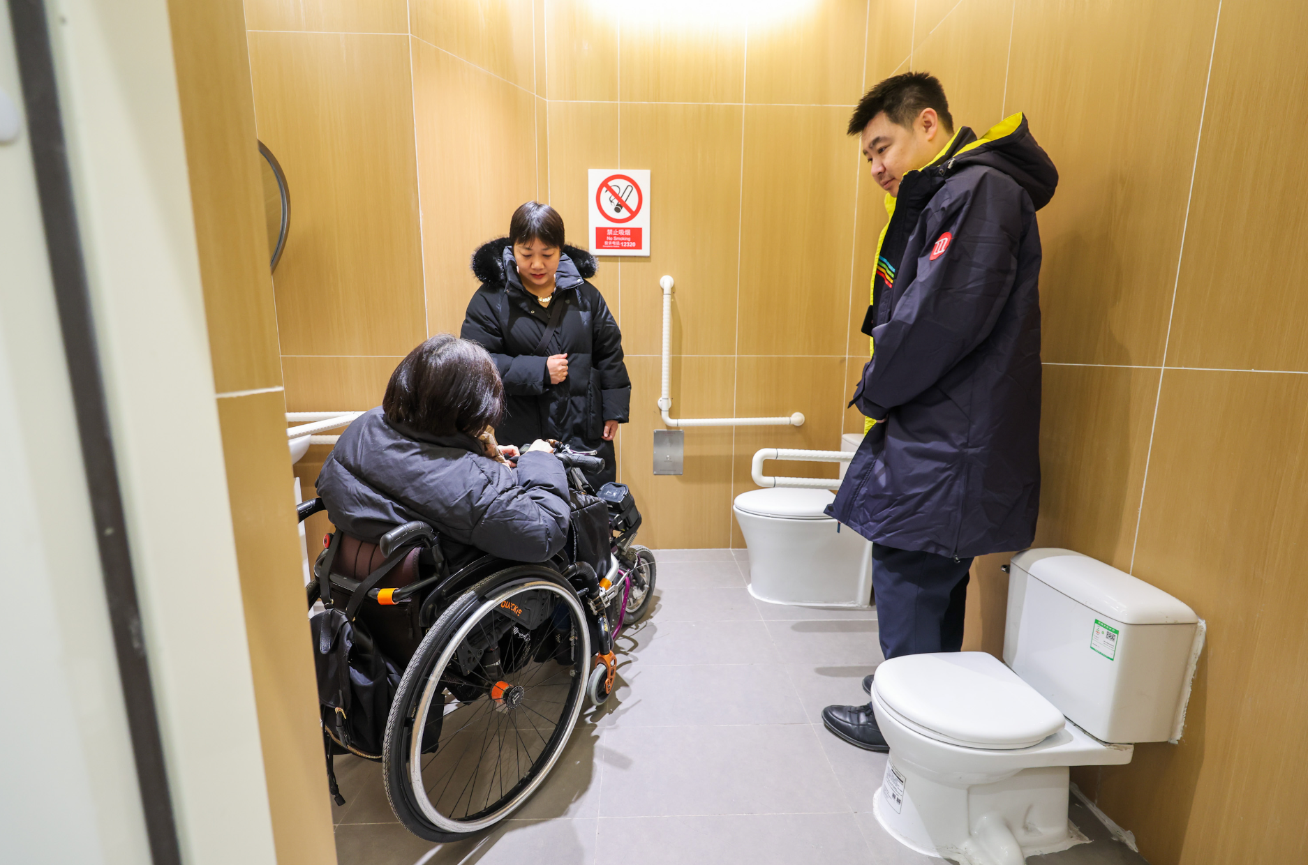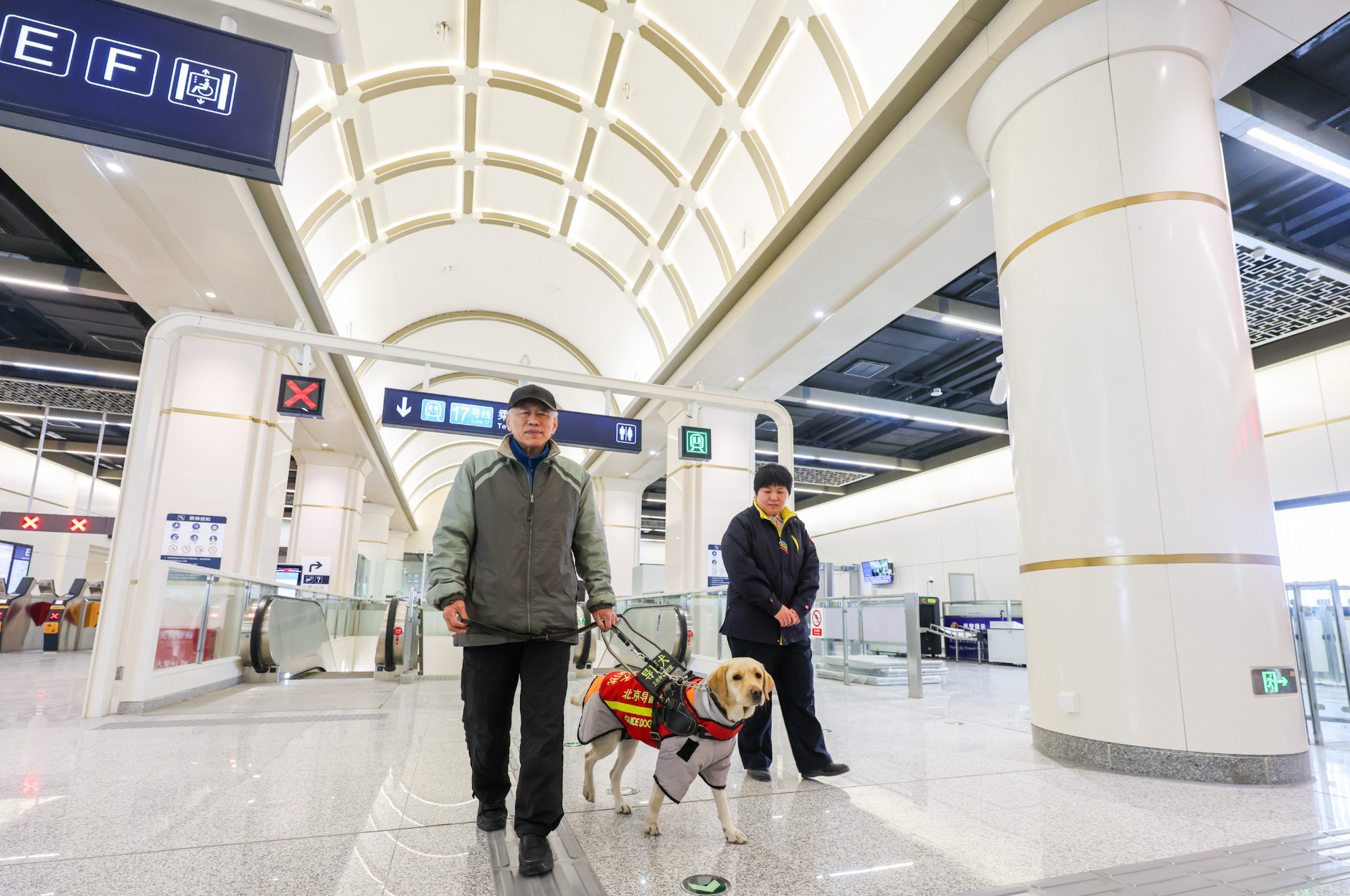 新车站还格外注重出行服务细节。17号线全线车站均配备母婴室、家庭式无障碍卫生间及AED急救设备。潘家园西站和永安里站延续使用双面开门直梯,并优化开门方向,方便轮椅乘客进出。针对冬季候车,站台座椅全部加装暖心坐垫。各站出入口采用大尺寸字母编号,方便远距离识别,便利低视力及老年乘客。针对外籍乘客较多的永安里站,配备了多语种翻译机并优化双语标识。