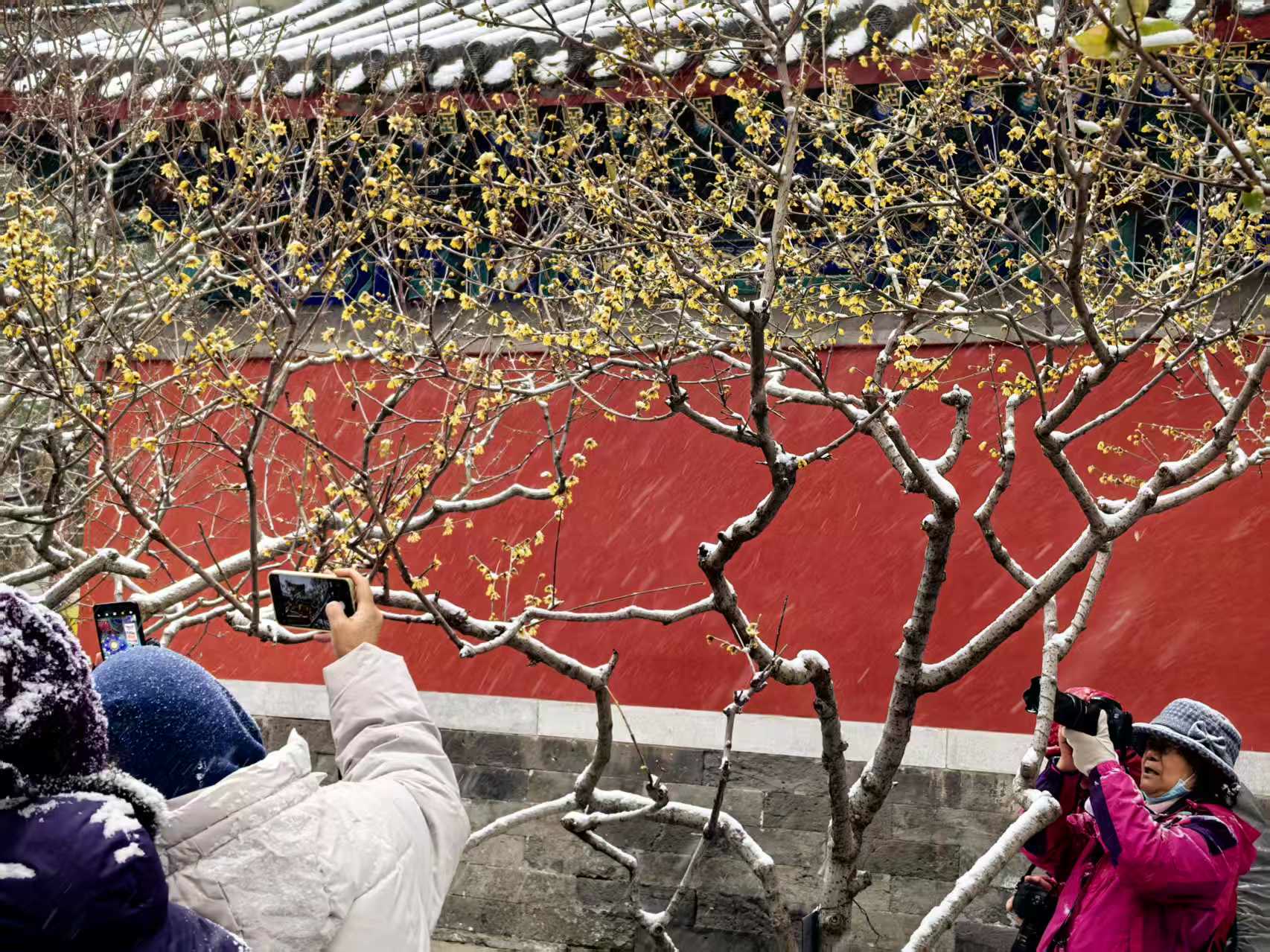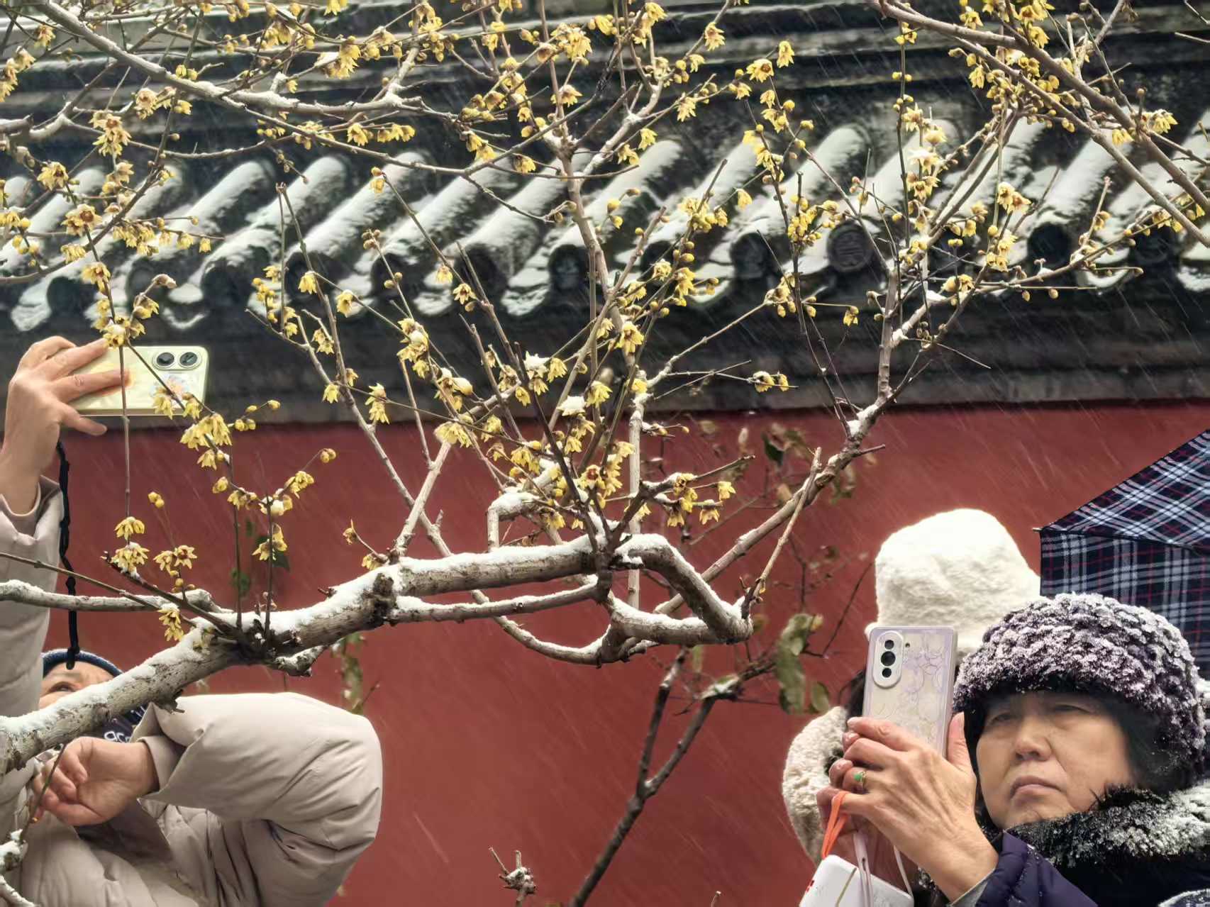 游人或是举着手机凑近花枝,定格雪落梅间的灵动瞬间;或是端起相机调整角度,将金黄与雪白的交织、古寺红墙的映衬一并纳入镜头。