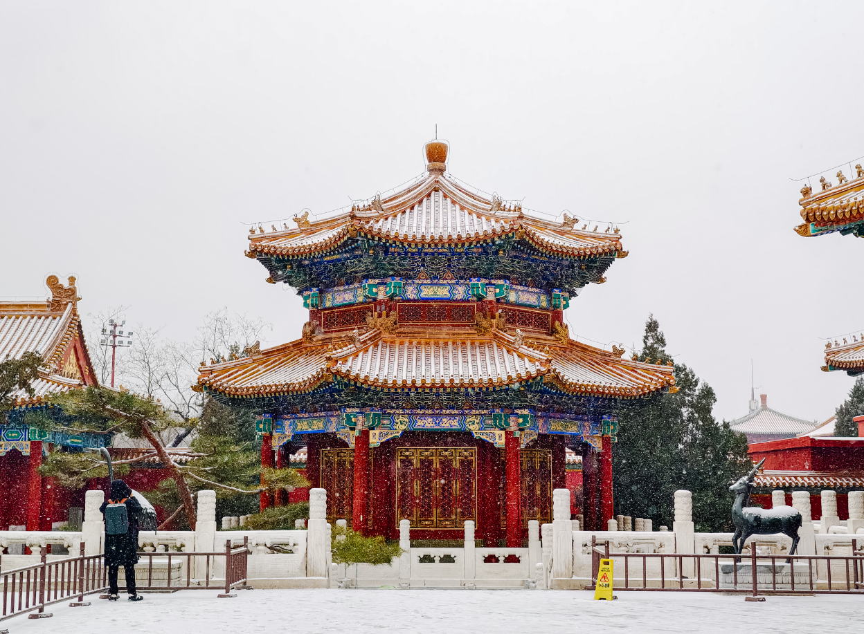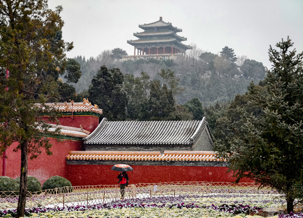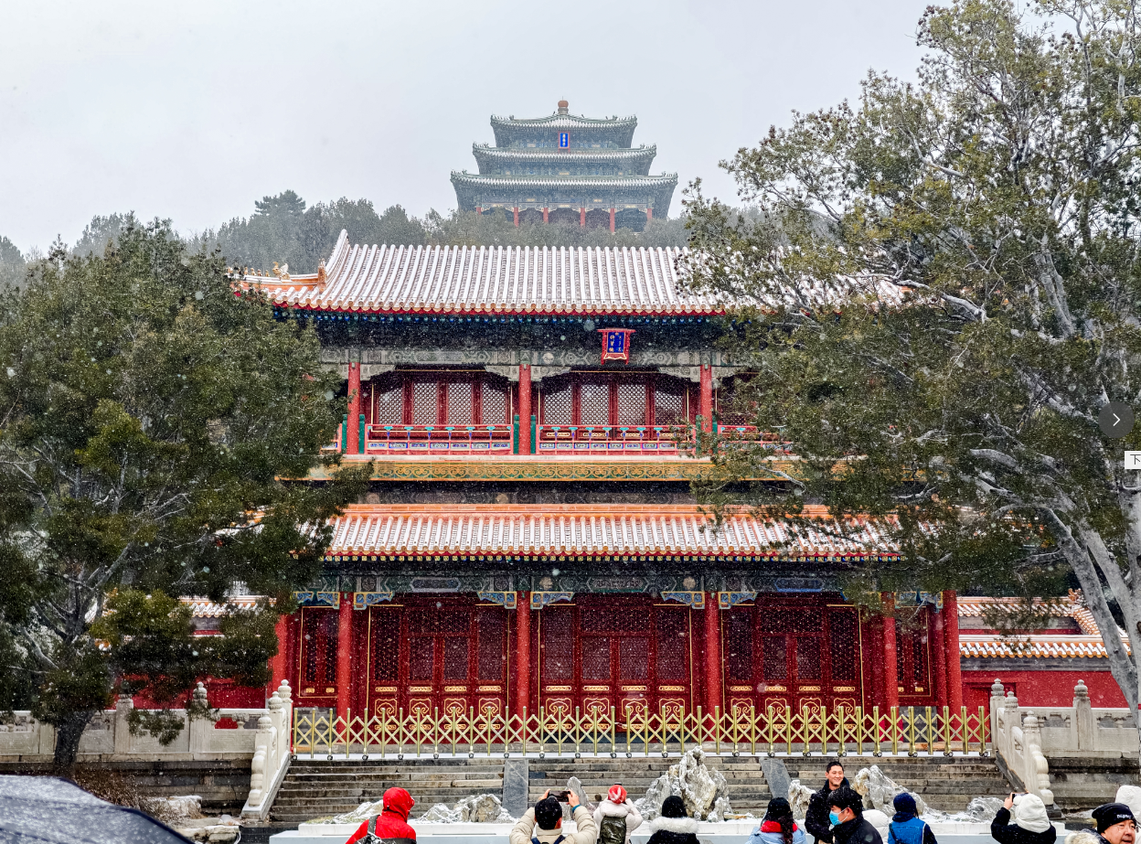 12月12日,北京迎来初雪。景山公园是眺望北京中轴线初雪的最佳去处,近看园内雪景也是分外迷人,古建与白雪同框,人在景中走仿若画中游。