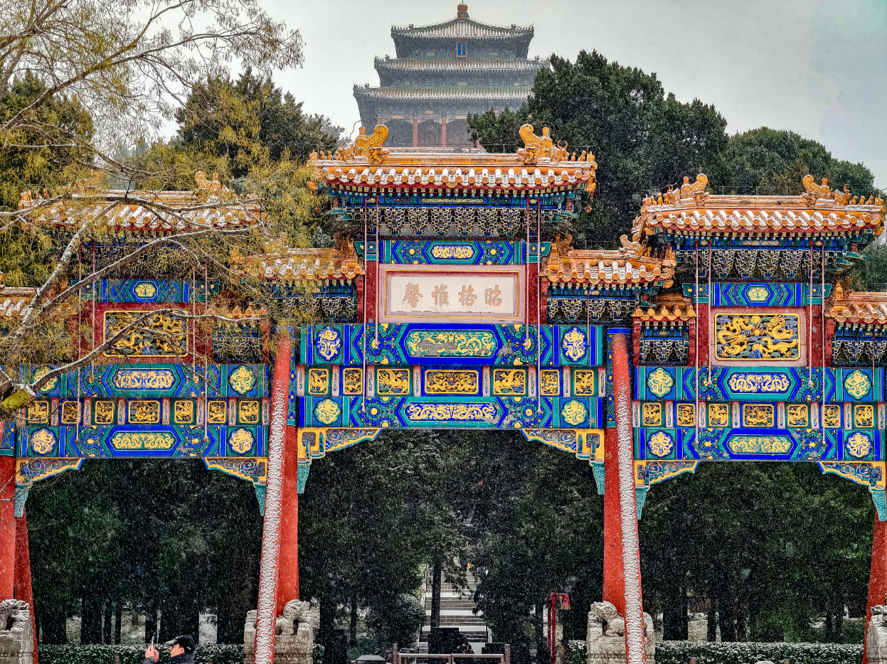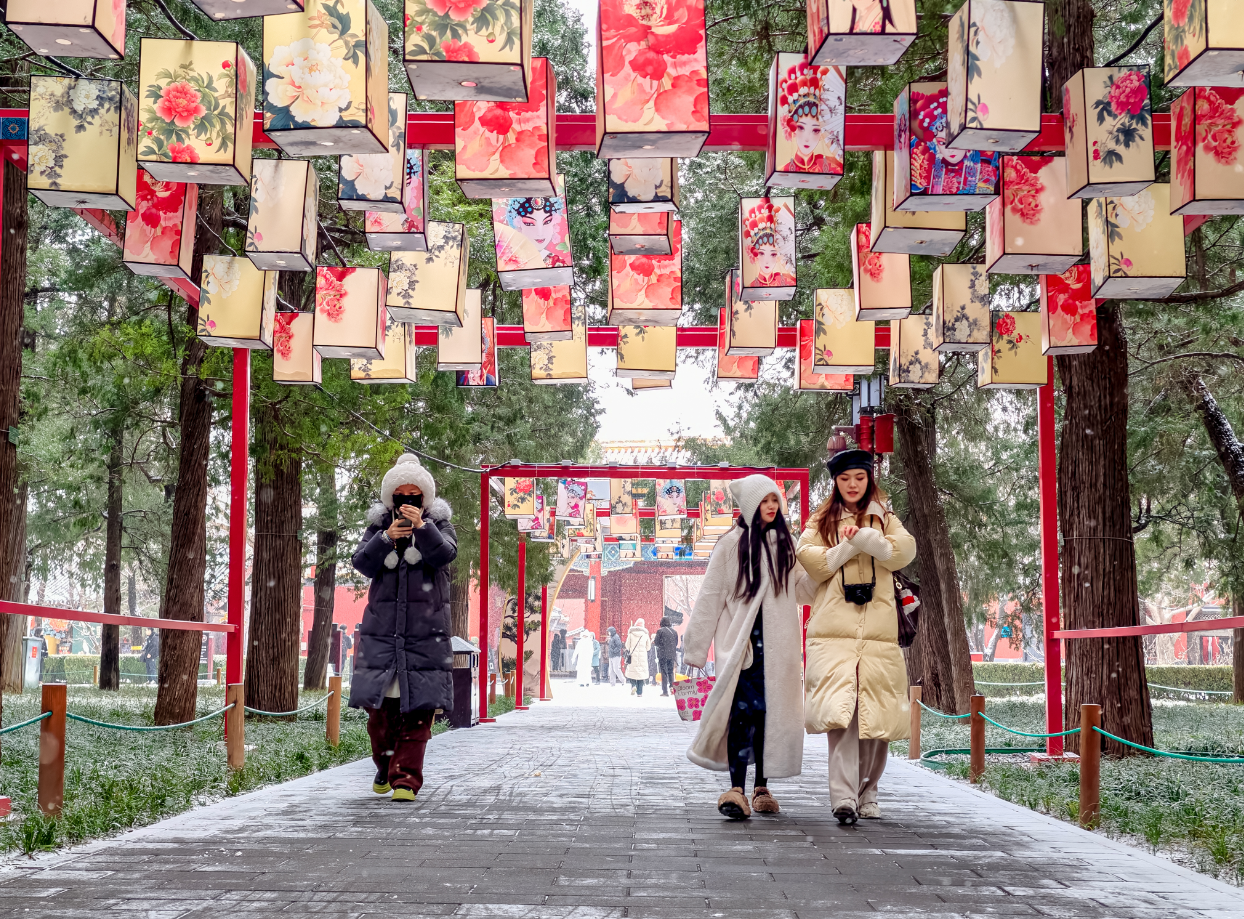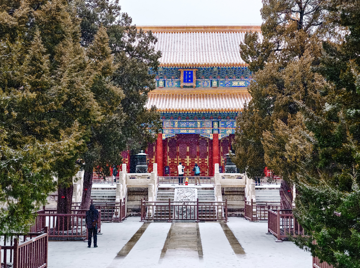 12月12日,北京迎来初雪。景山公园是眺望北京中轴线初雪的最佳去处,近看园内雪景也是分外迷人,古建与白雪同框,人在景中走仿若画中游。