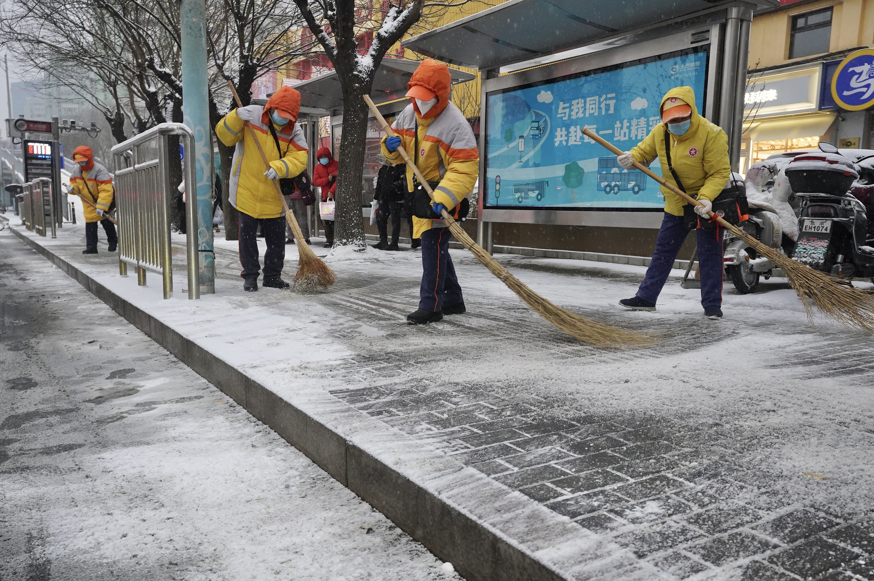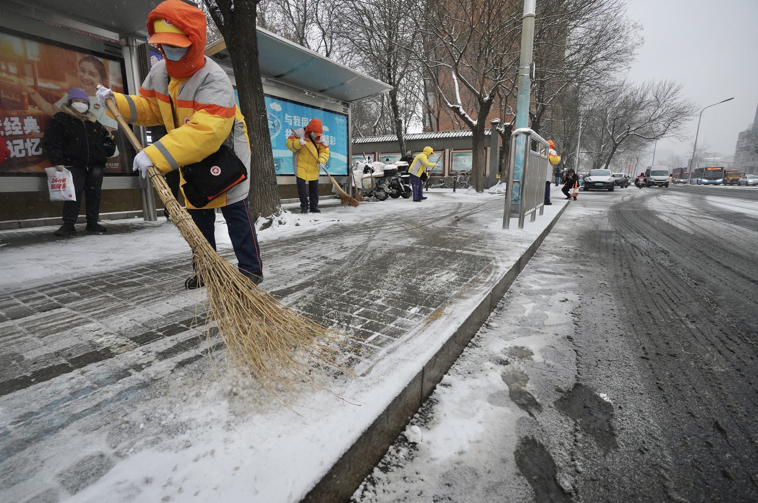 文明引导员晚高峰前清扫公交站台积雪,方便乘客候车