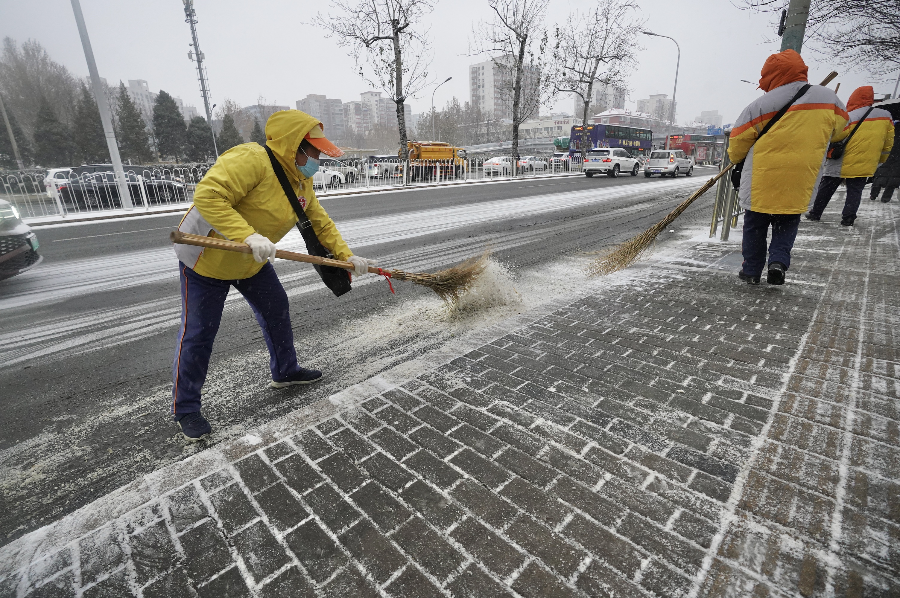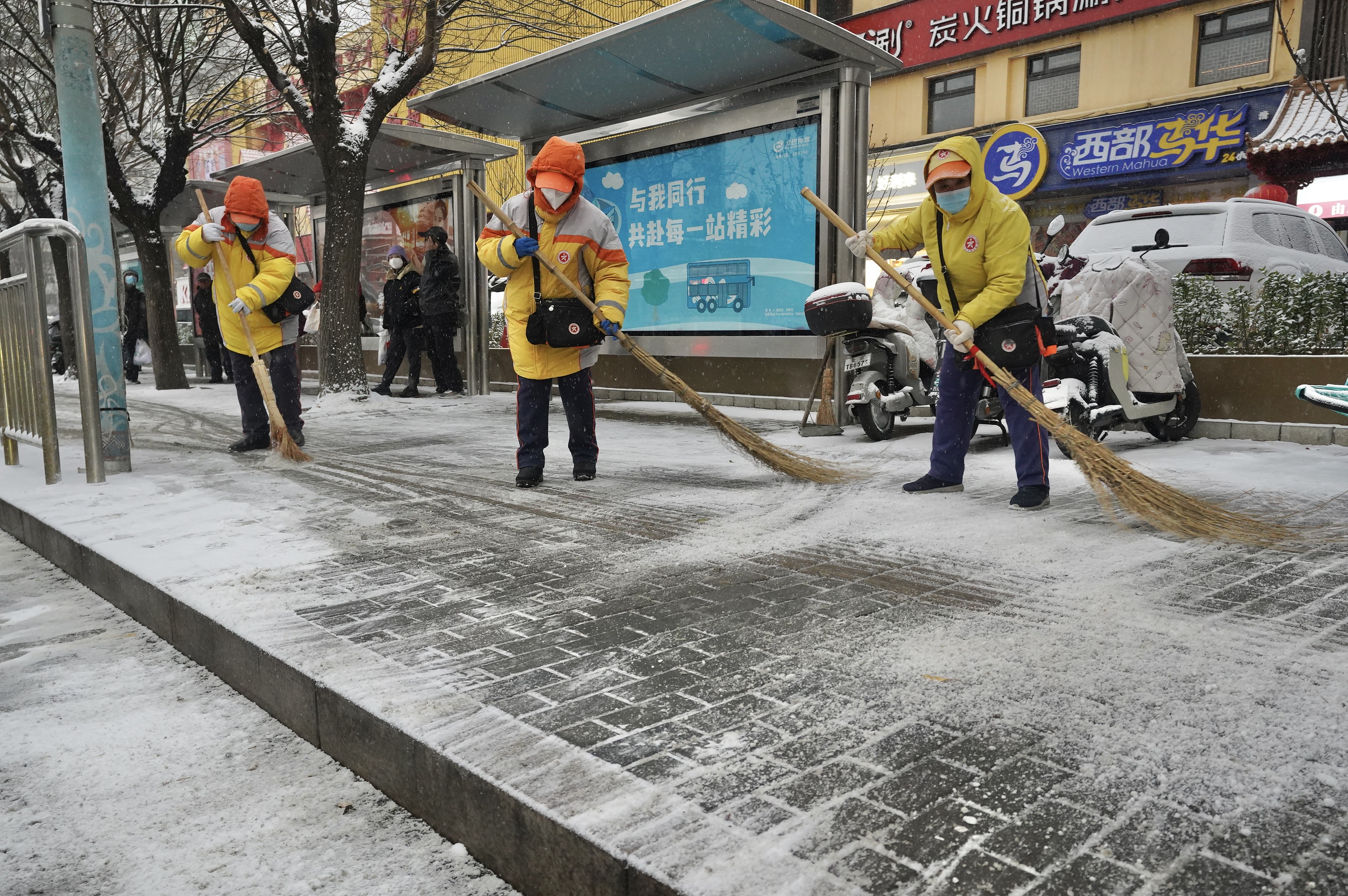 12月12日,安贞街道公共文明引导员赶在周五晚高峰到来之前清扫公交站台上的积雪,方便乘客候车。
