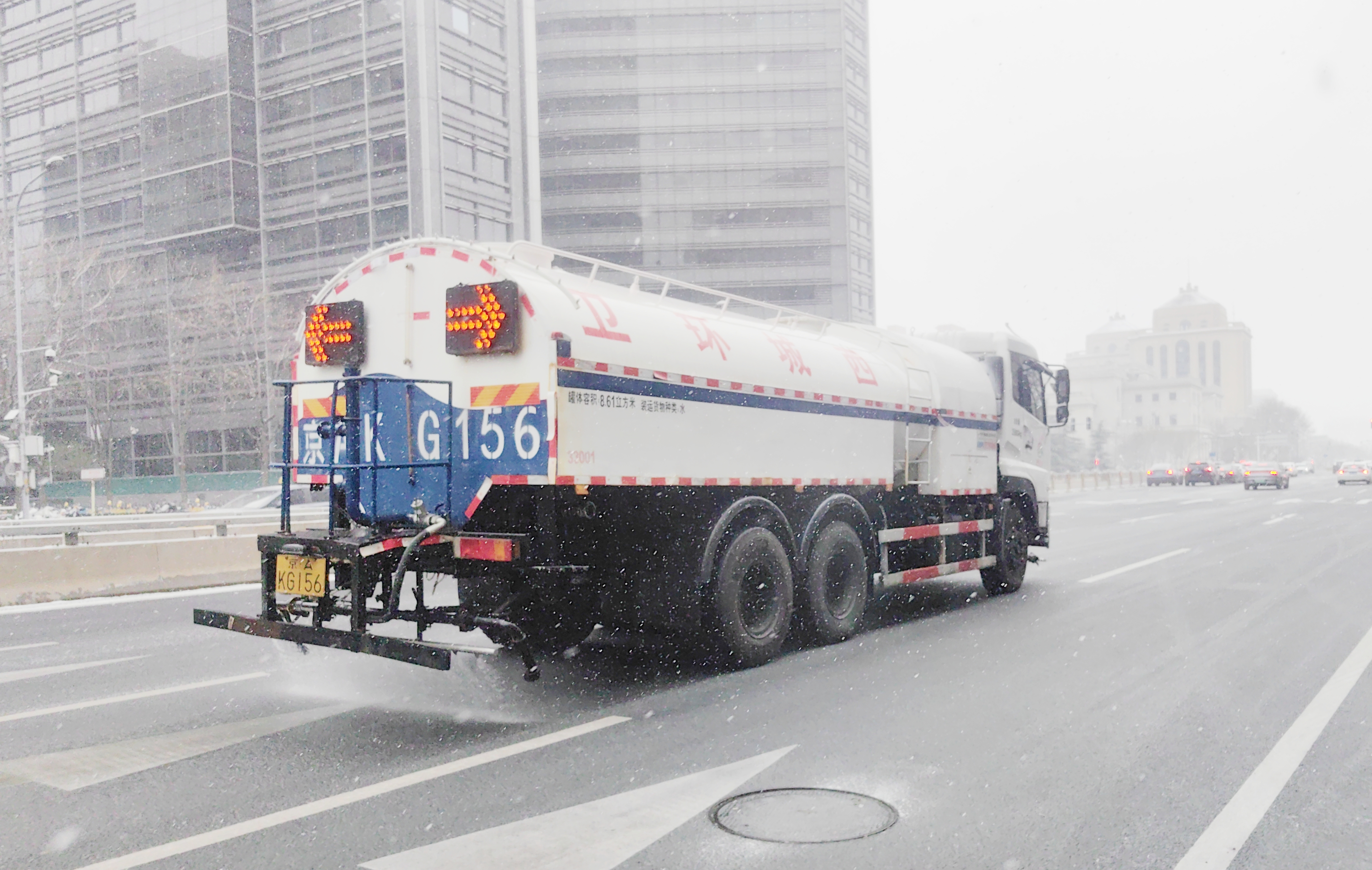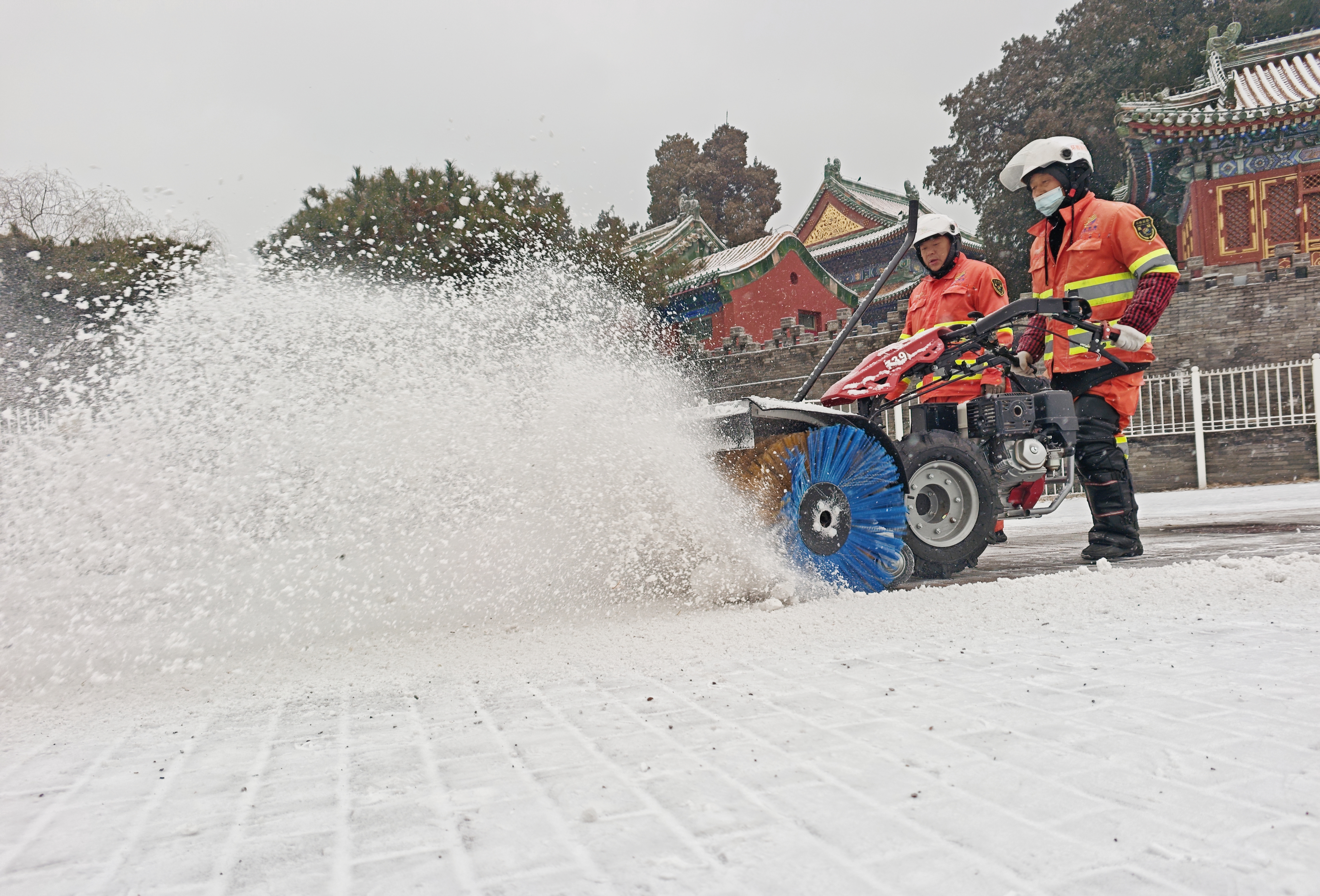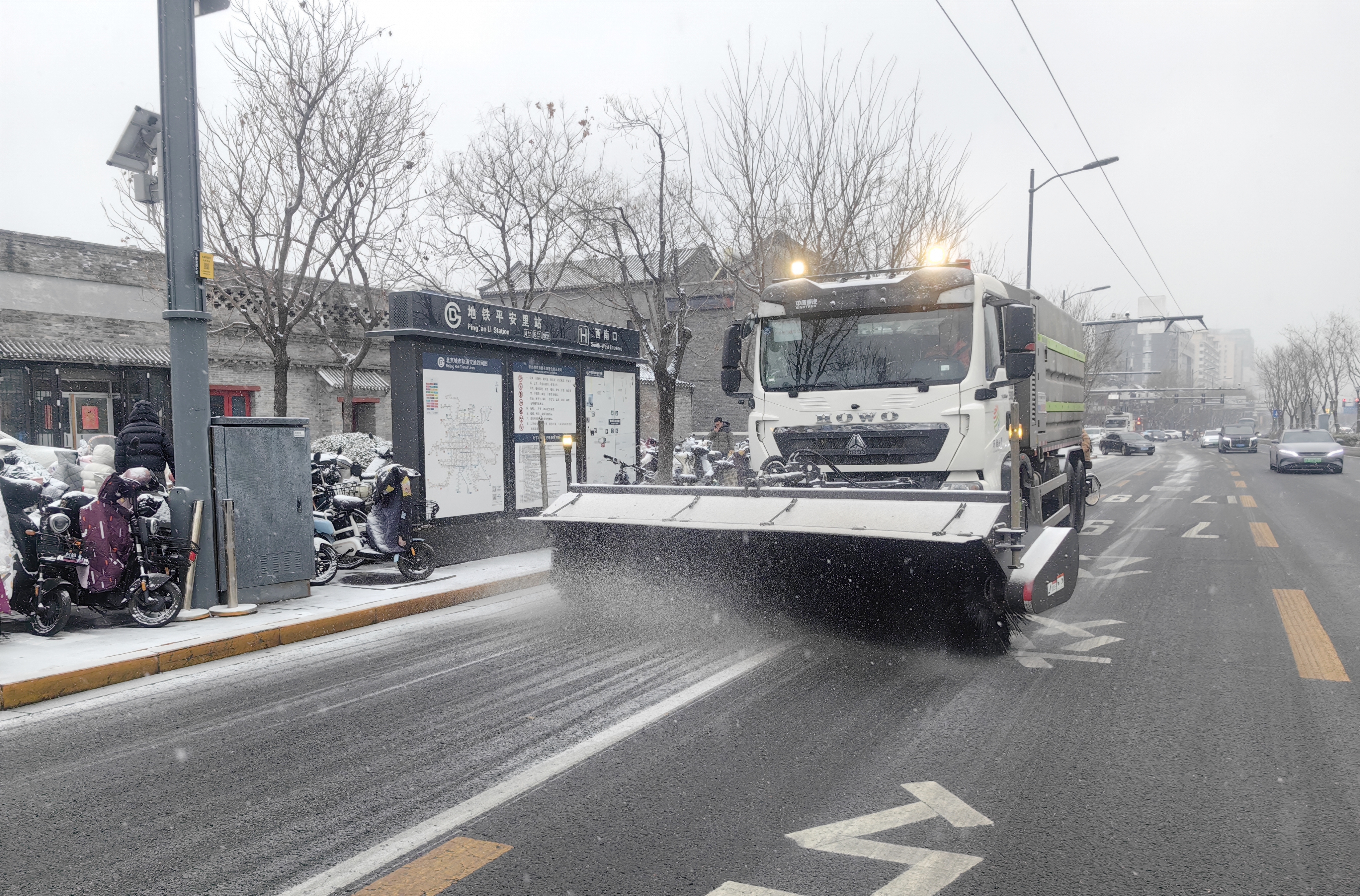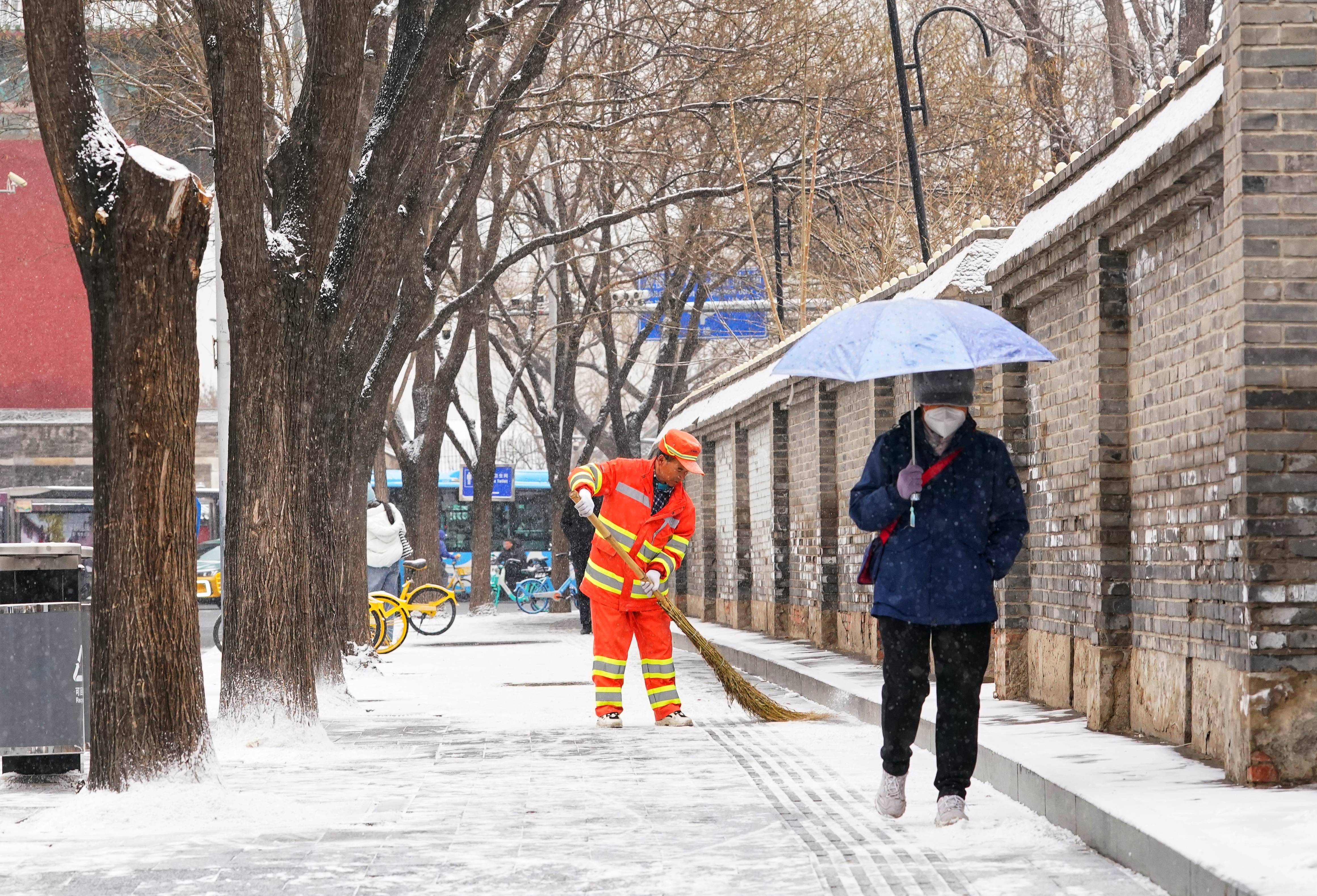 12月12日,北京普降入冬初雪,西城环卫(环雅丽都公司)采用人机配合作业模式,及时清理路面及人行便道积雪,保障市民和游客通行。