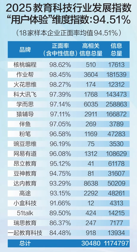 从“用户体验”维度整体数据情况来看,在2025教育科技行业发展指数降噪处理后的1174797条数据中,与用户体验及消费者权益高度相关的信息总量为30480条,这一部分高质量、高信噪比的数据,为“用户体验”维度指数编写奠定了坚实的基础。