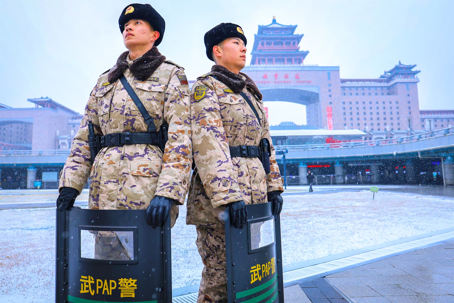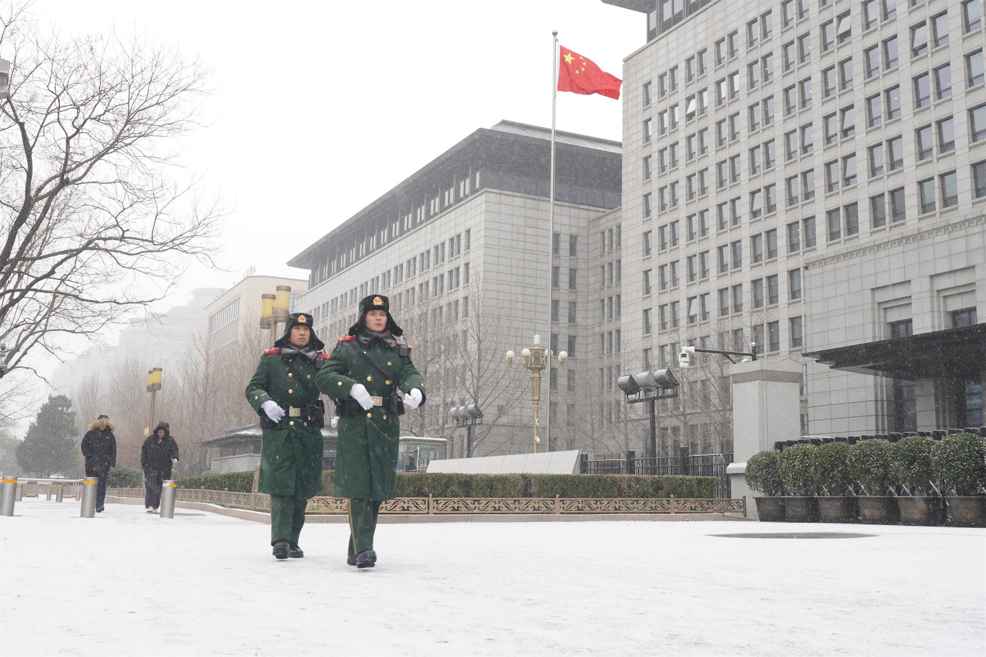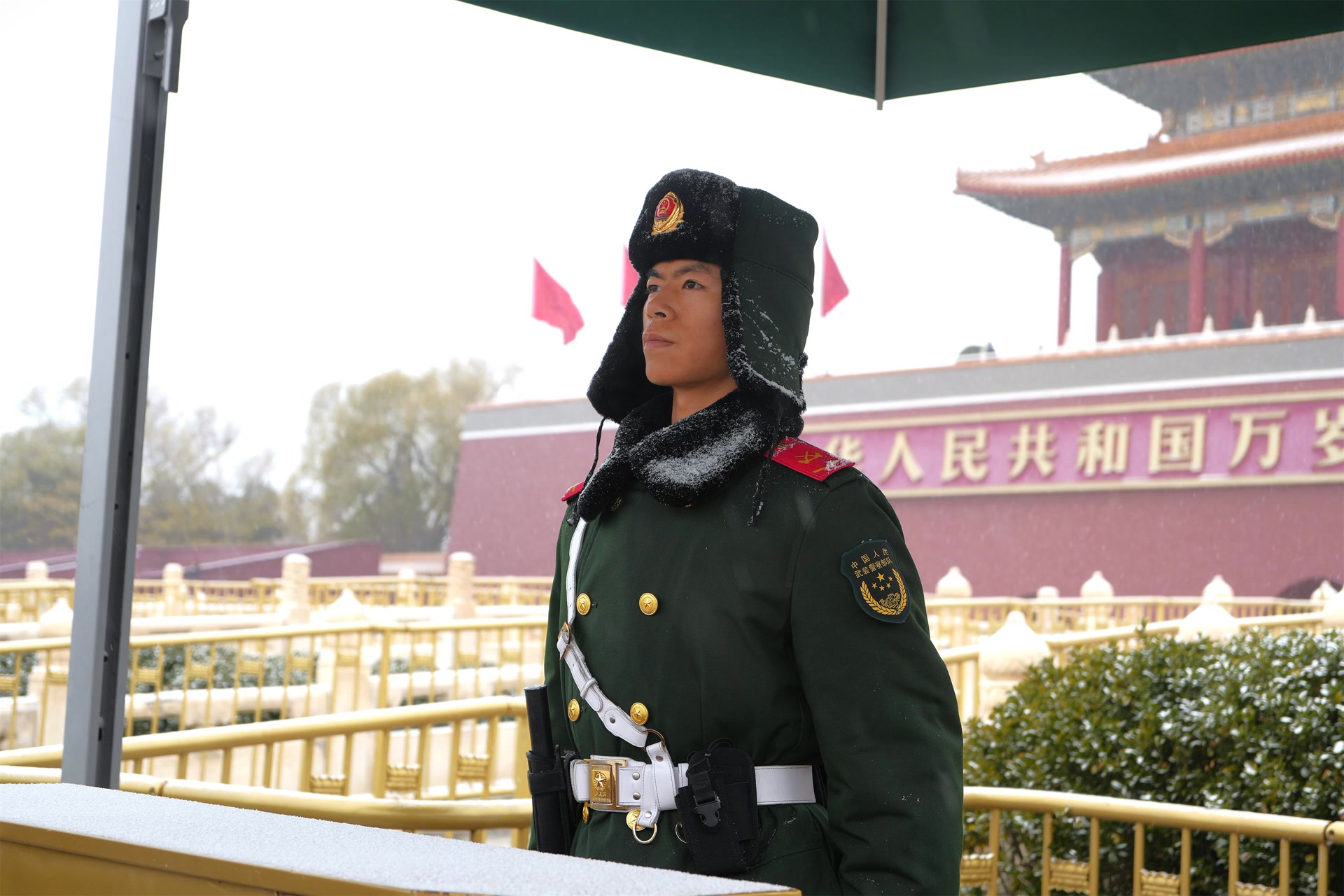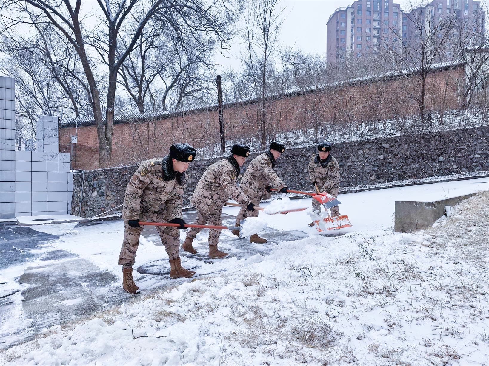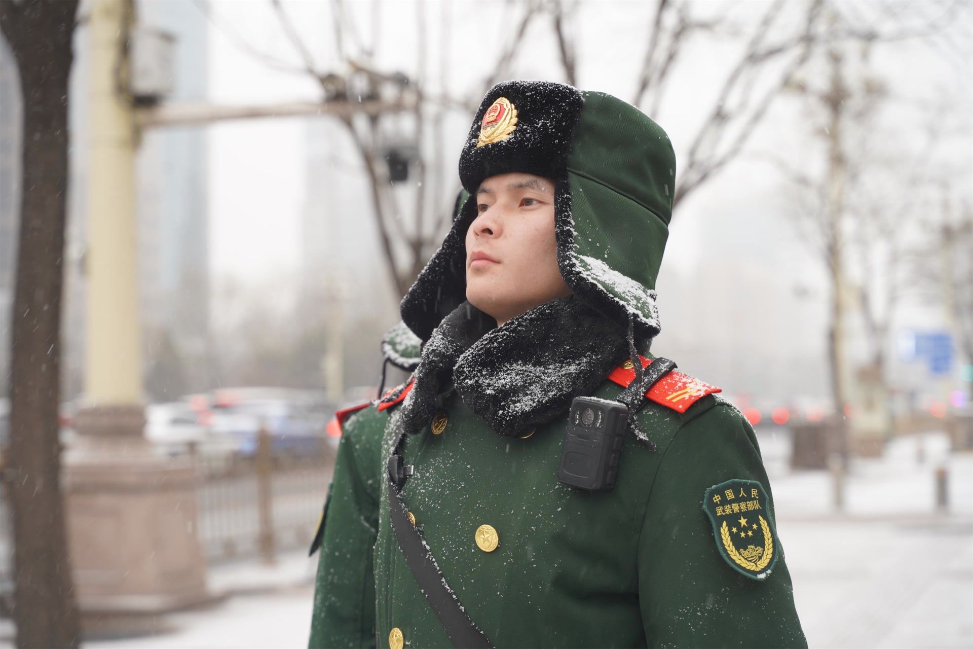 12月12日,北京迎来今冬首场降雪,武警官兵雪中执勤守护平安。