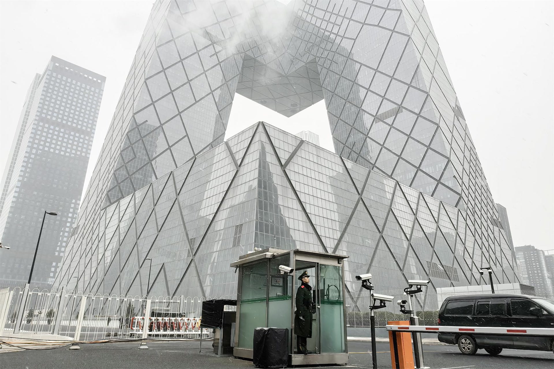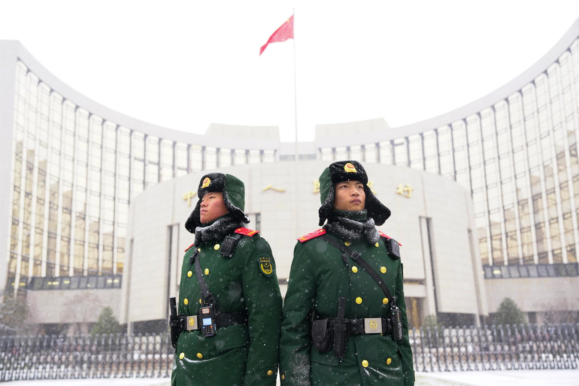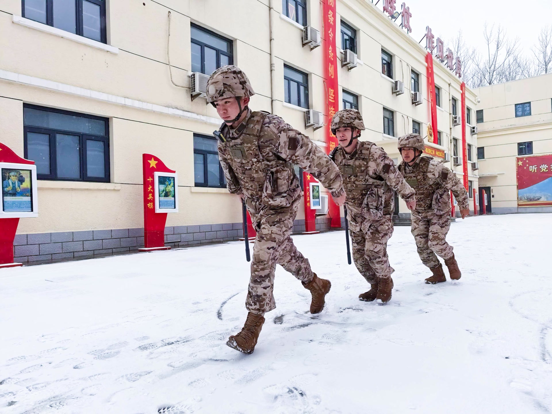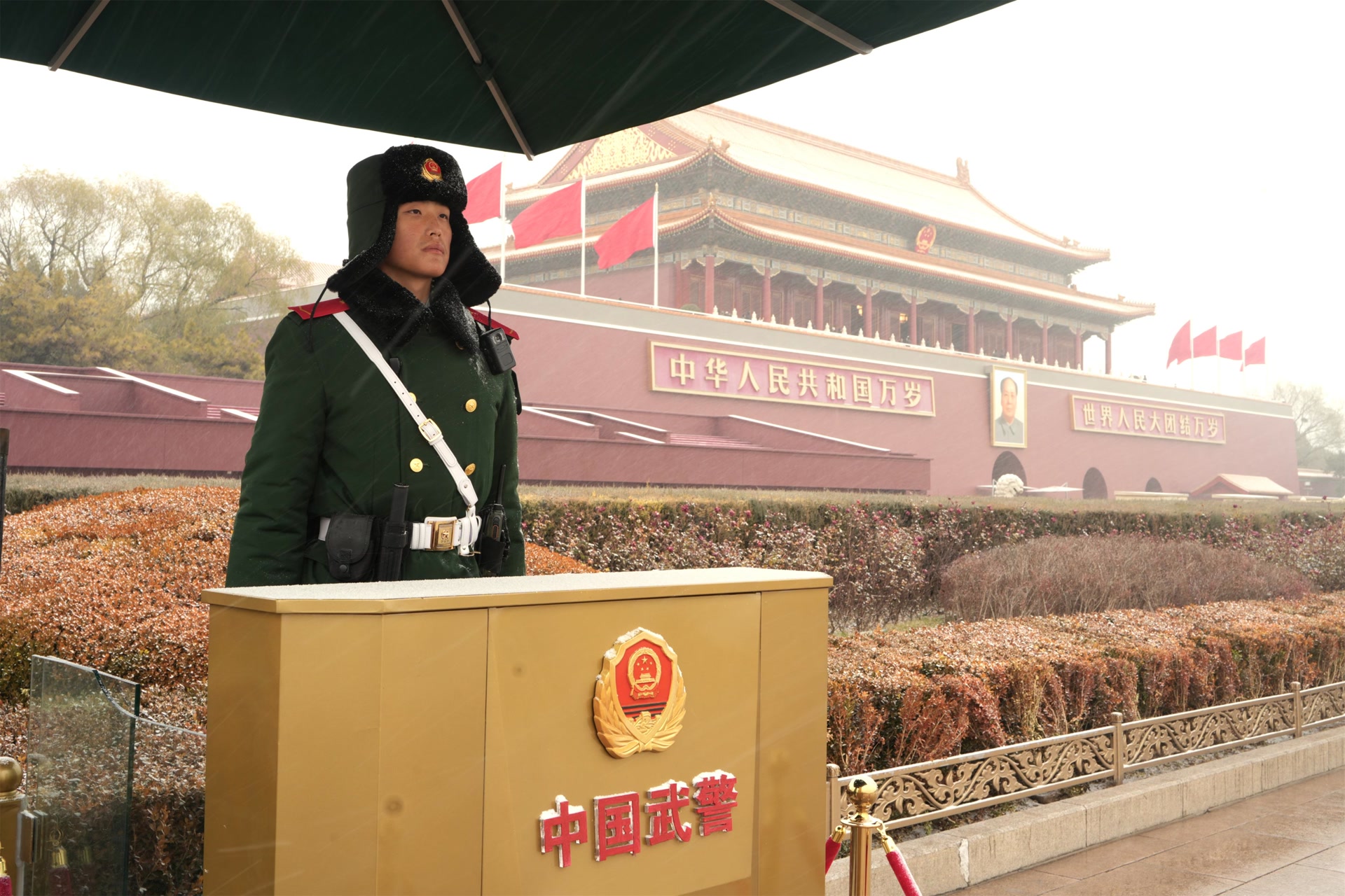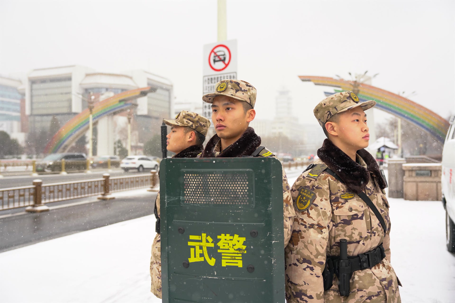 12月12日,北京迎来今冬首场降雪,武警官兵雪中执勤守护平安。