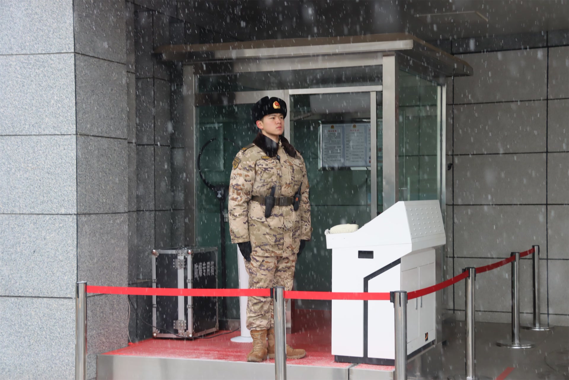 哨兵马宇乐表示:“作为一名军人,坚守岗位是我的职责所在,无论刮风还是下雪,我都会认真履好职、尽好责,保卫一方平安。”