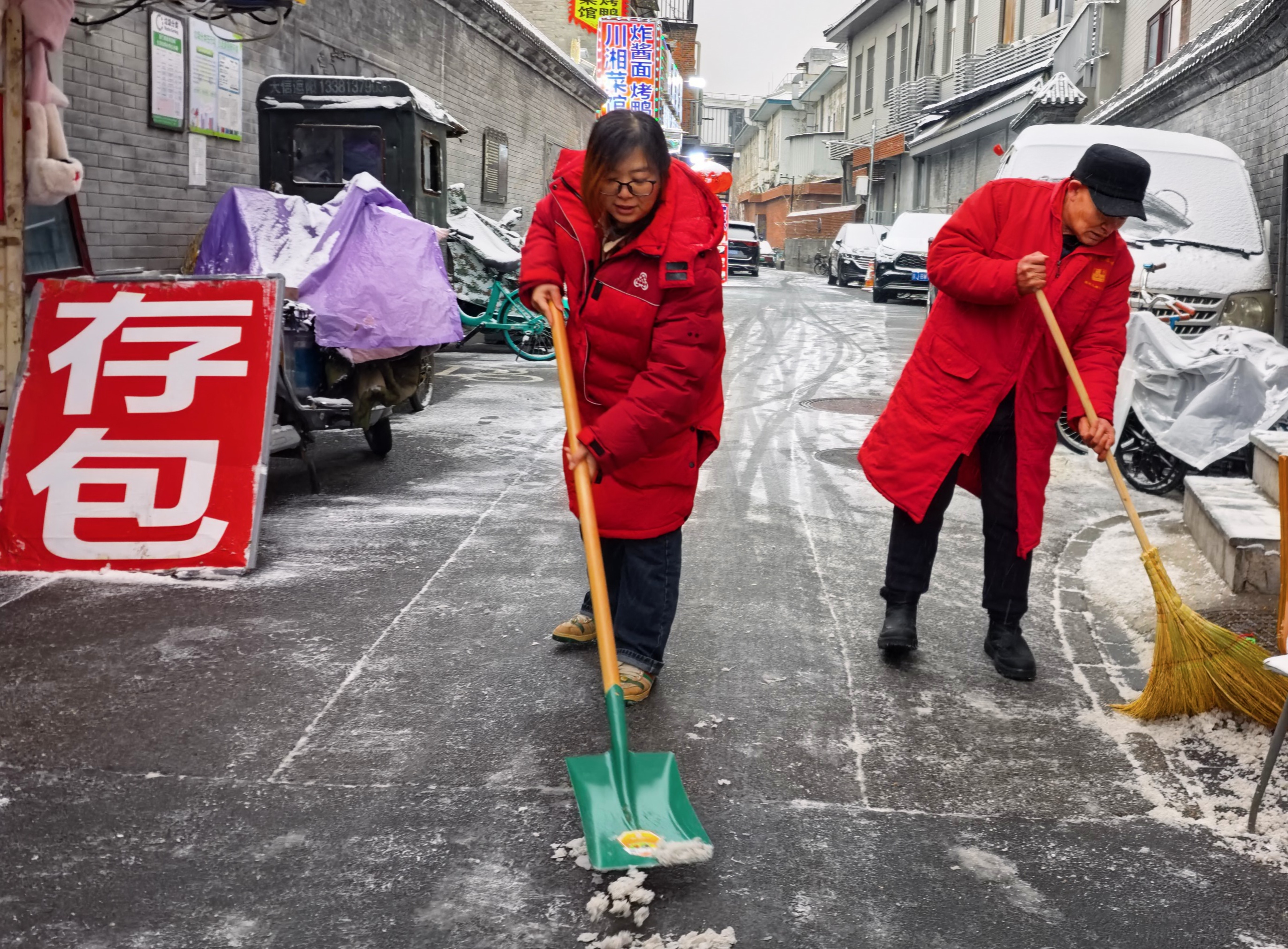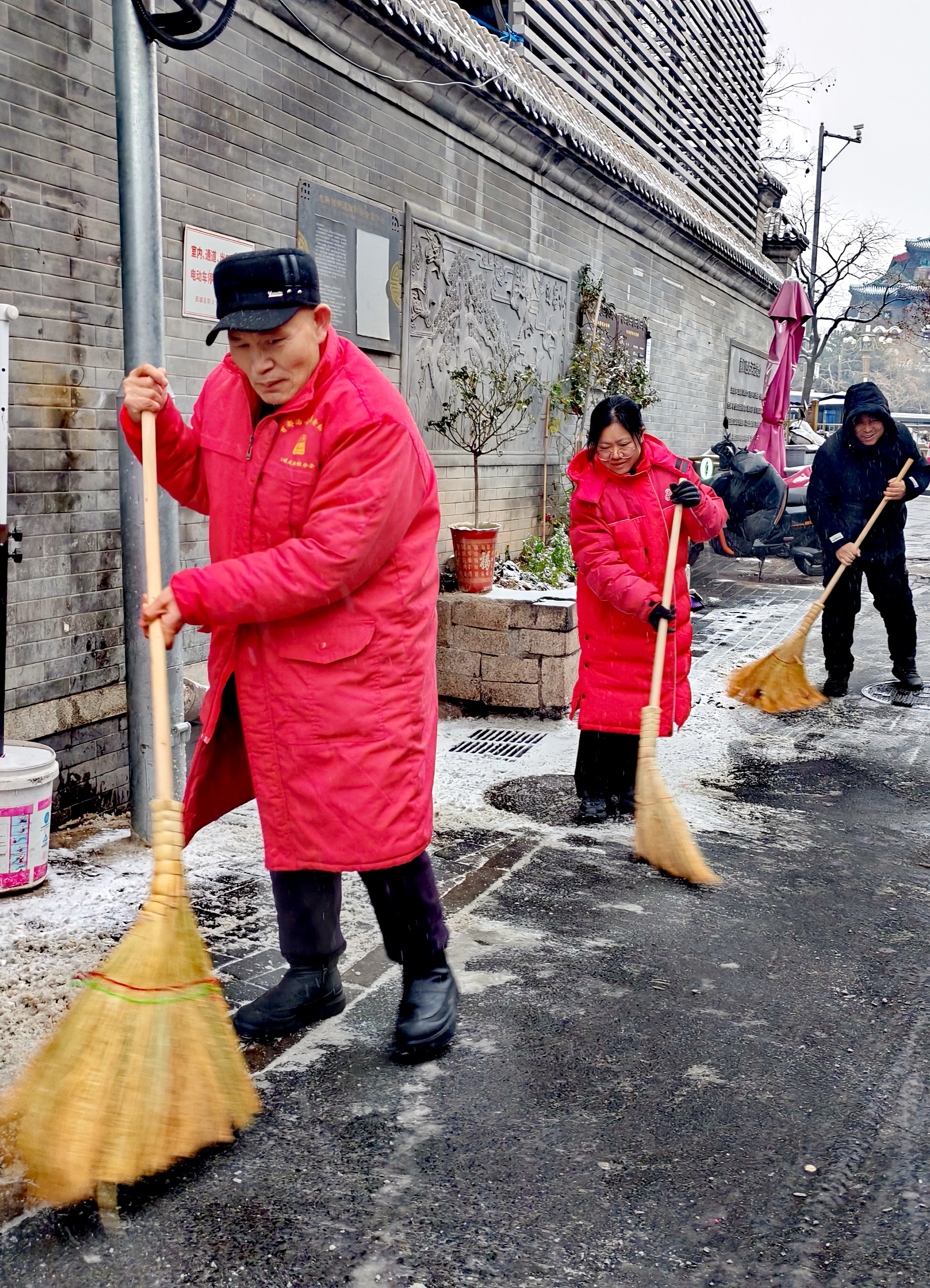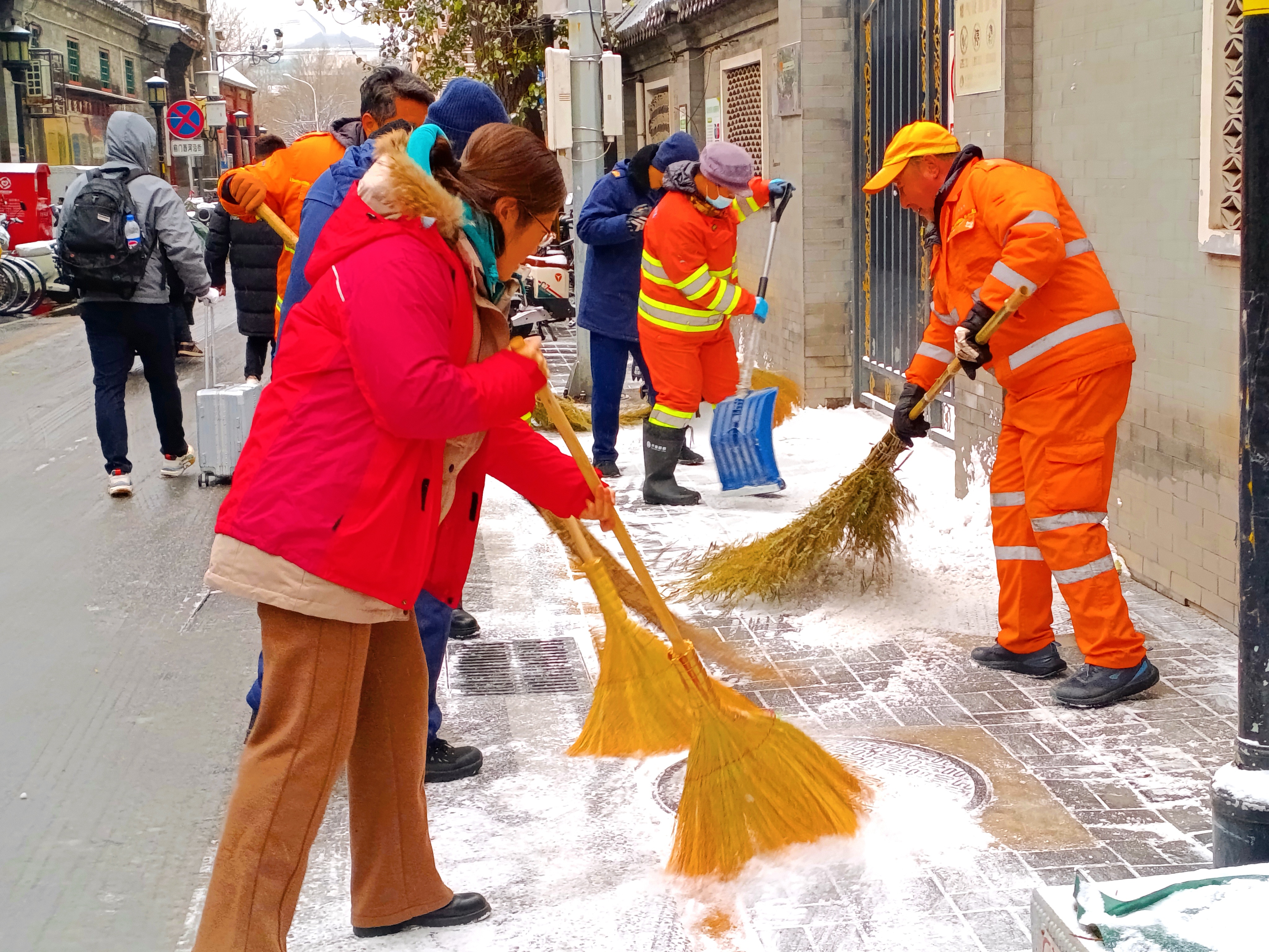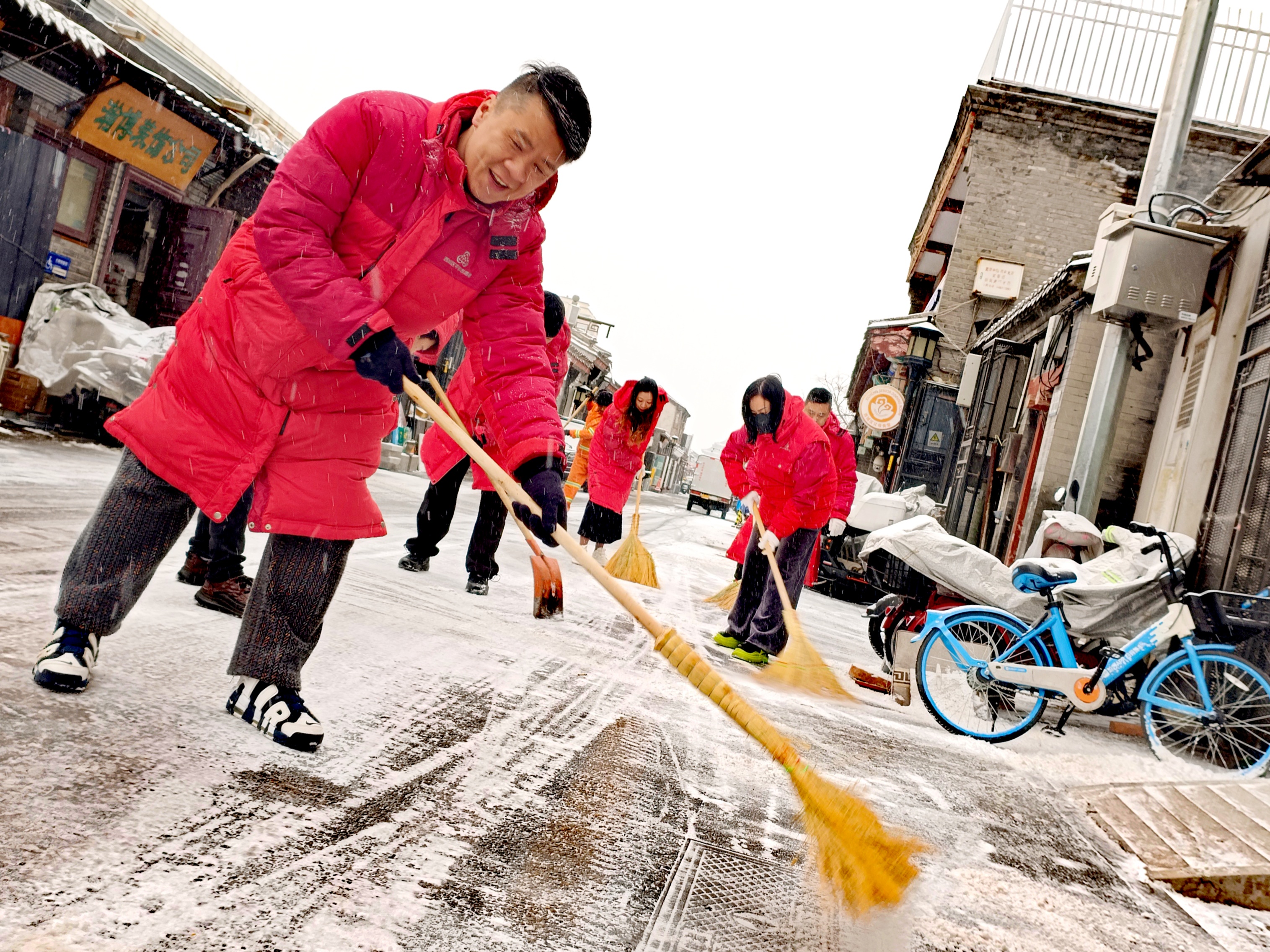 今天北京首场降雪,北京西城区大栅栏街道前门西河沿社区40余名代表紧急集合到社区,集体铲冰扫雪。