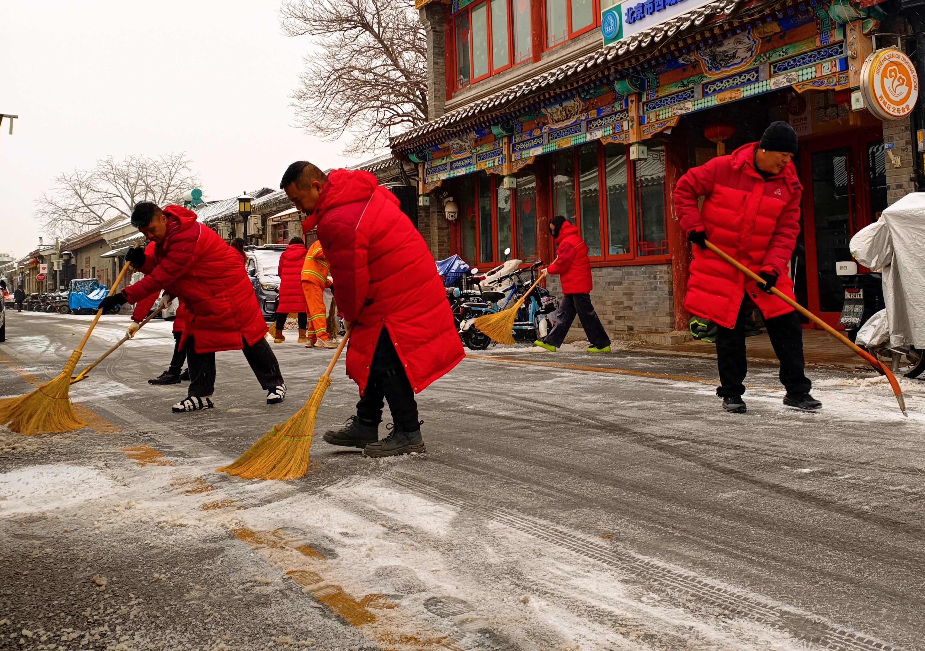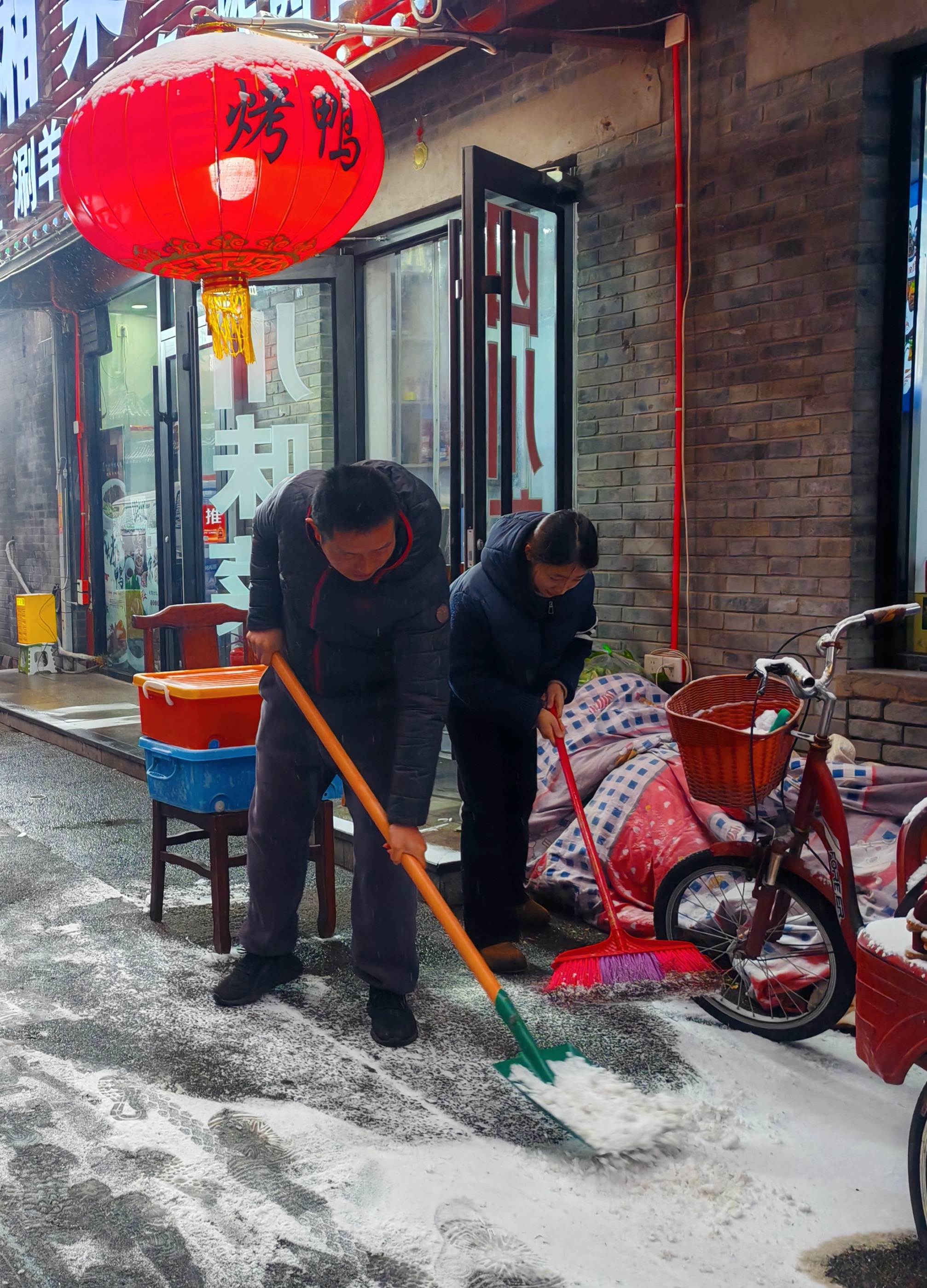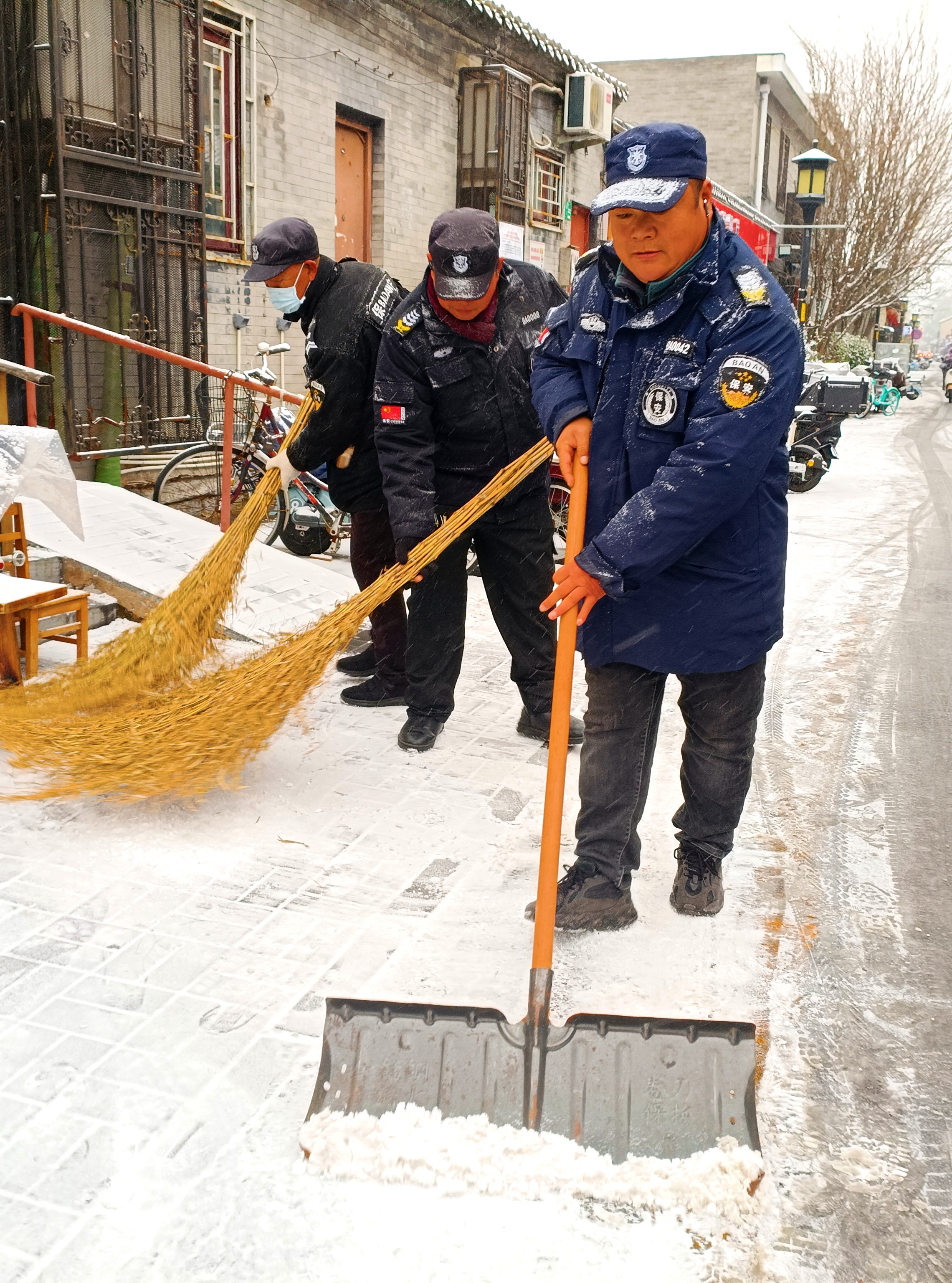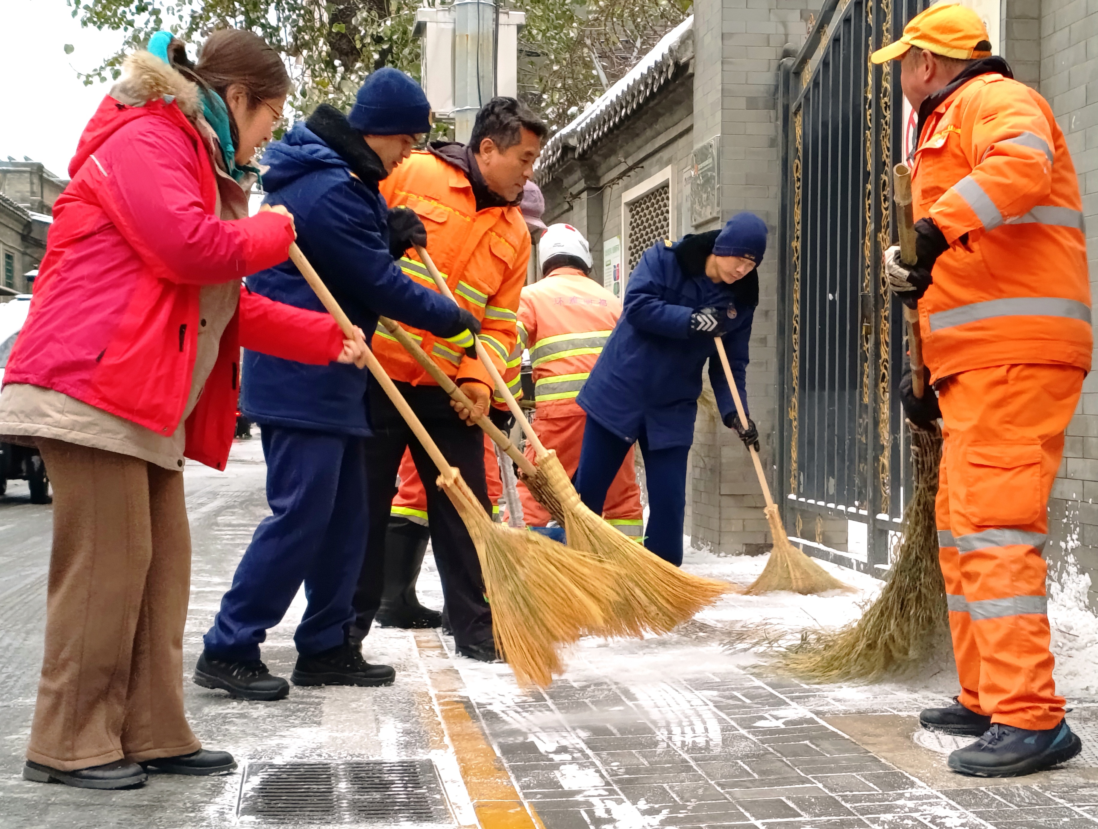 今天北京首场降雪,北京西城区大栅栏街道前门西河沿社区40余名代表紧急集合到社区,集体铲冰扫雪。