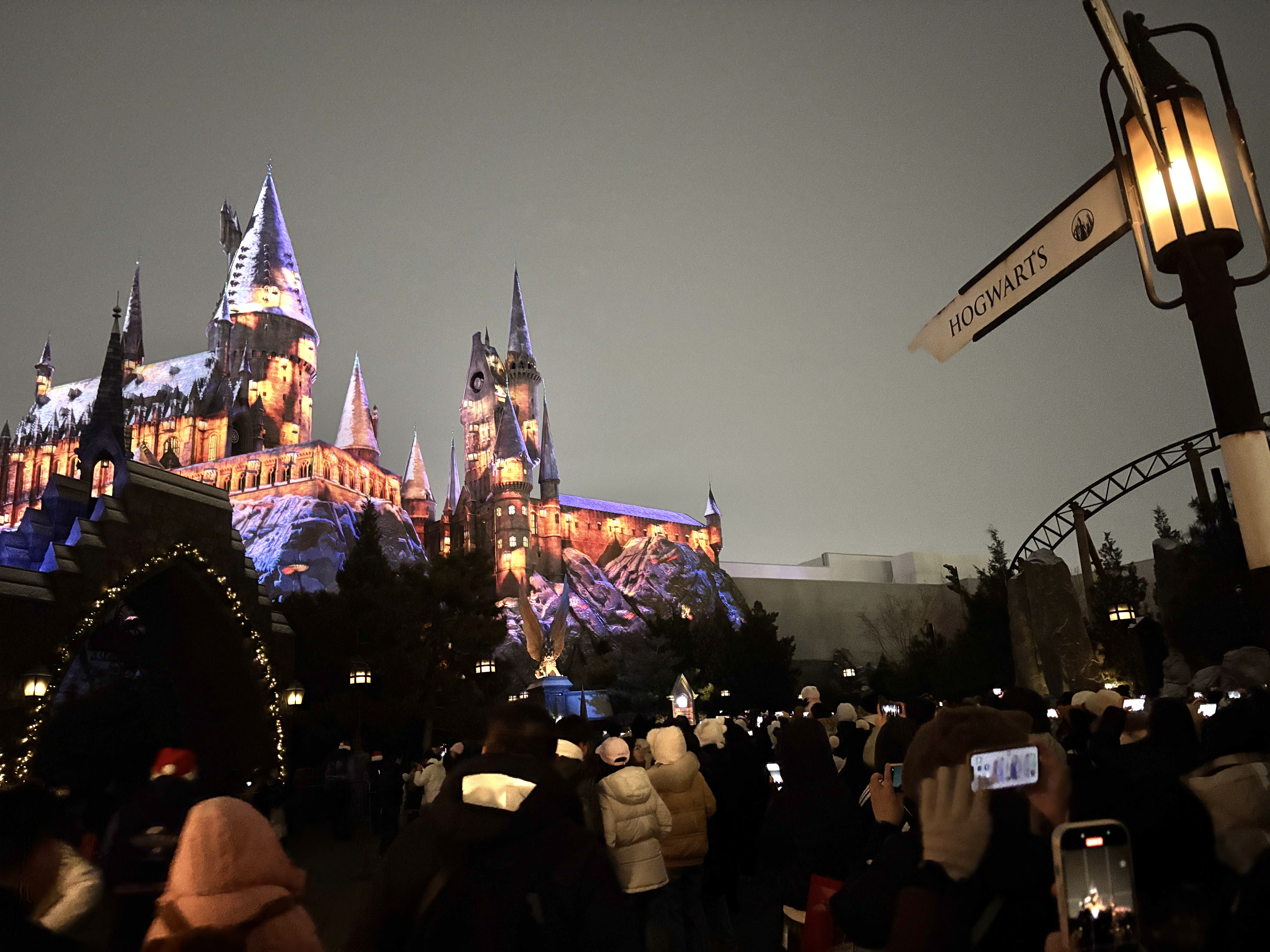 当夜幕降临,街巷的橱窗被温暖的灯光点亮,松树林也被温馨的灯饰围绕,在浪漫氛围中,霍格沃茨城堡圣诞魔法庆典灯光秀准时上演。绚丽的灯光随音乐不断变幻,城堡上时而出现猫头鹰送来的冬日礼物,时而呈现热闹舞会的场景,为城堡更添魔幻色彩。