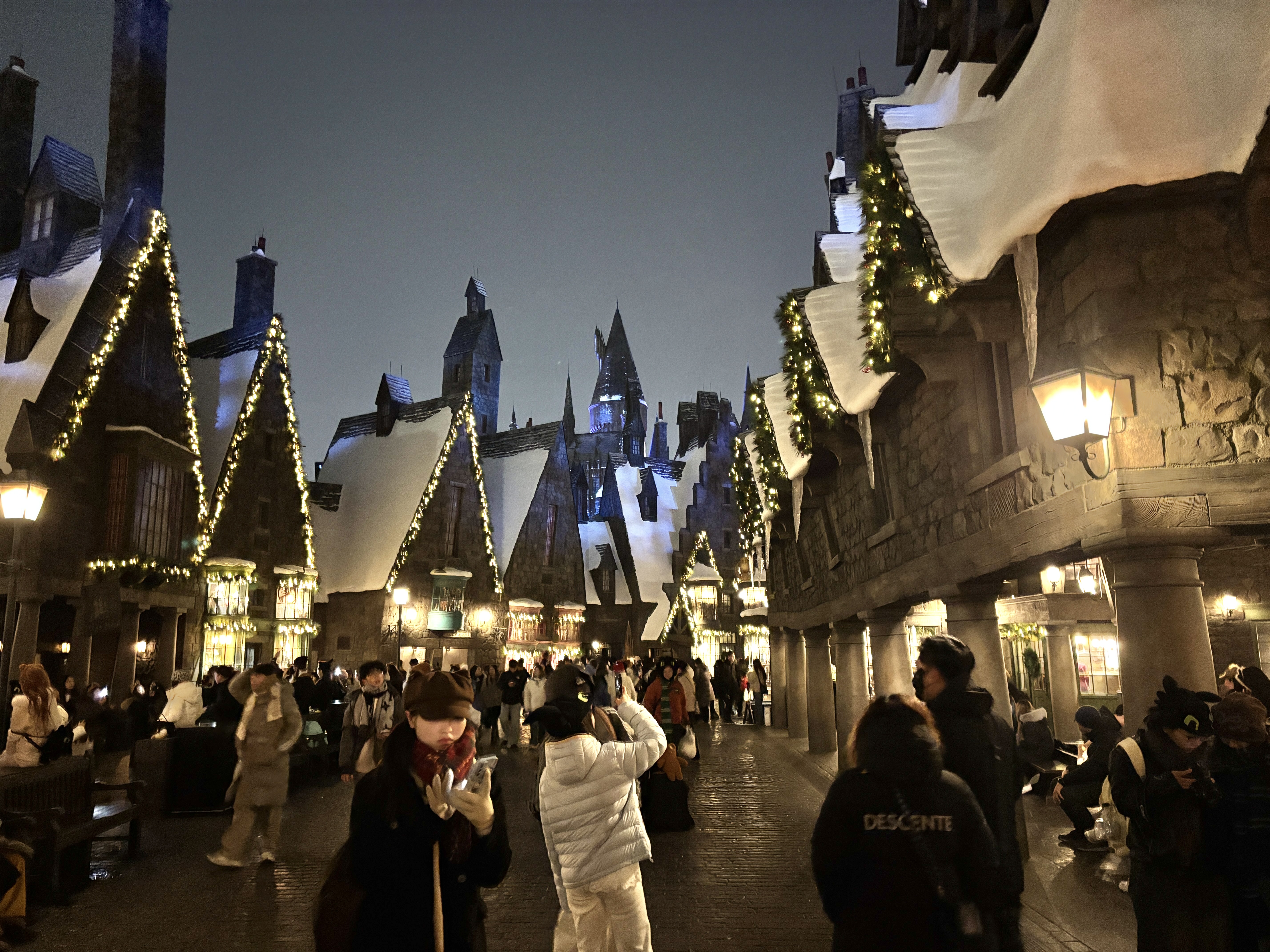 还有不少游客一进入园区,就一路小跑直奔哈利·波特魔法世界景区。“妈妈你看,这一幕跟电影里一模一样。”一名小朋友指着银装素裹的霍格沃茨城堡兴奋地说。顺着他手指的方向,记者看到许多穿着巫师袍的游客,正手持魔杖模仿着电影中巫师的样子摆出各种动作,并与身后的城堡合影留念。“今天太幸运,竟然碰到霍格沃茨下雪了。”一名游客说。