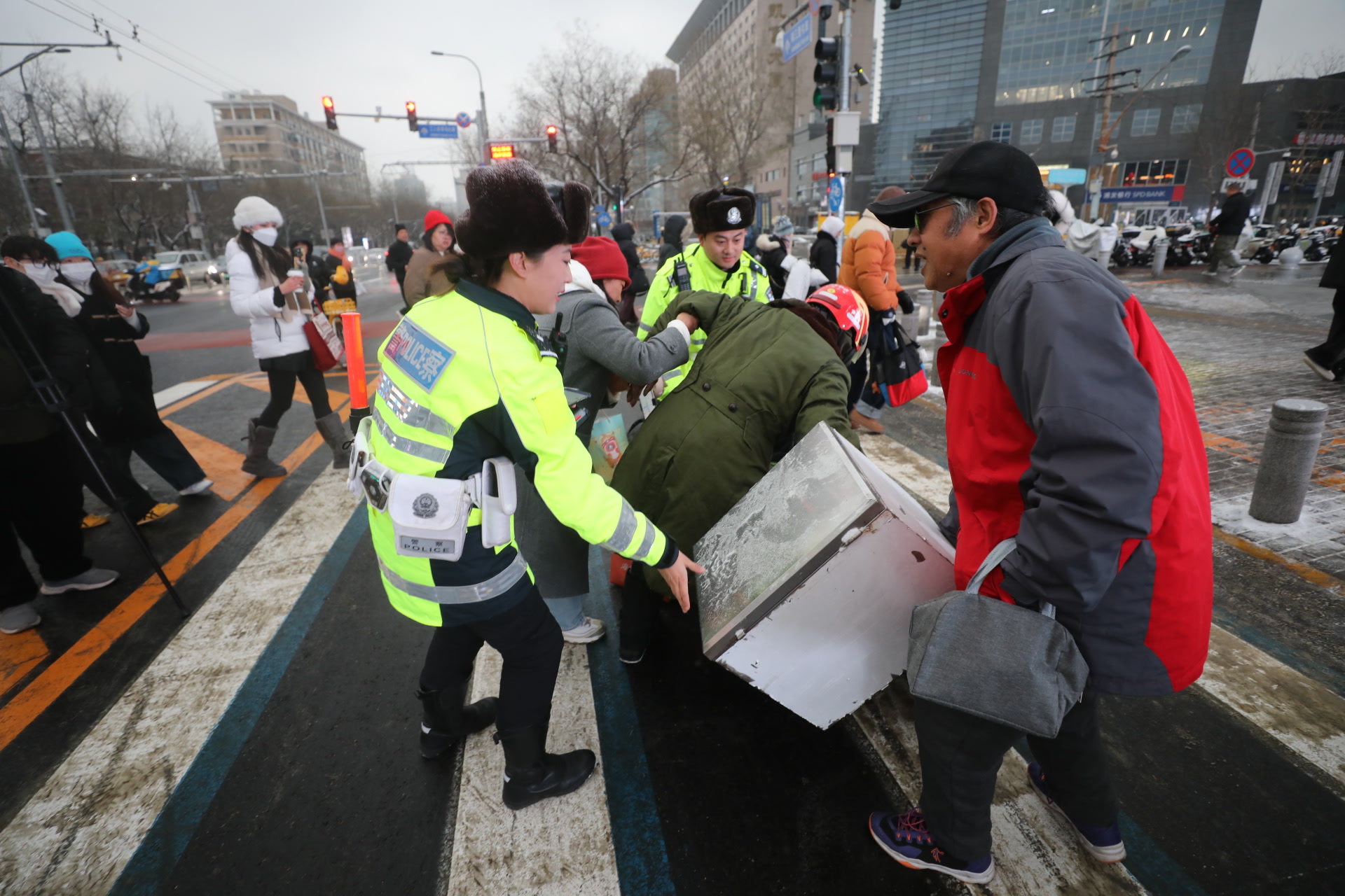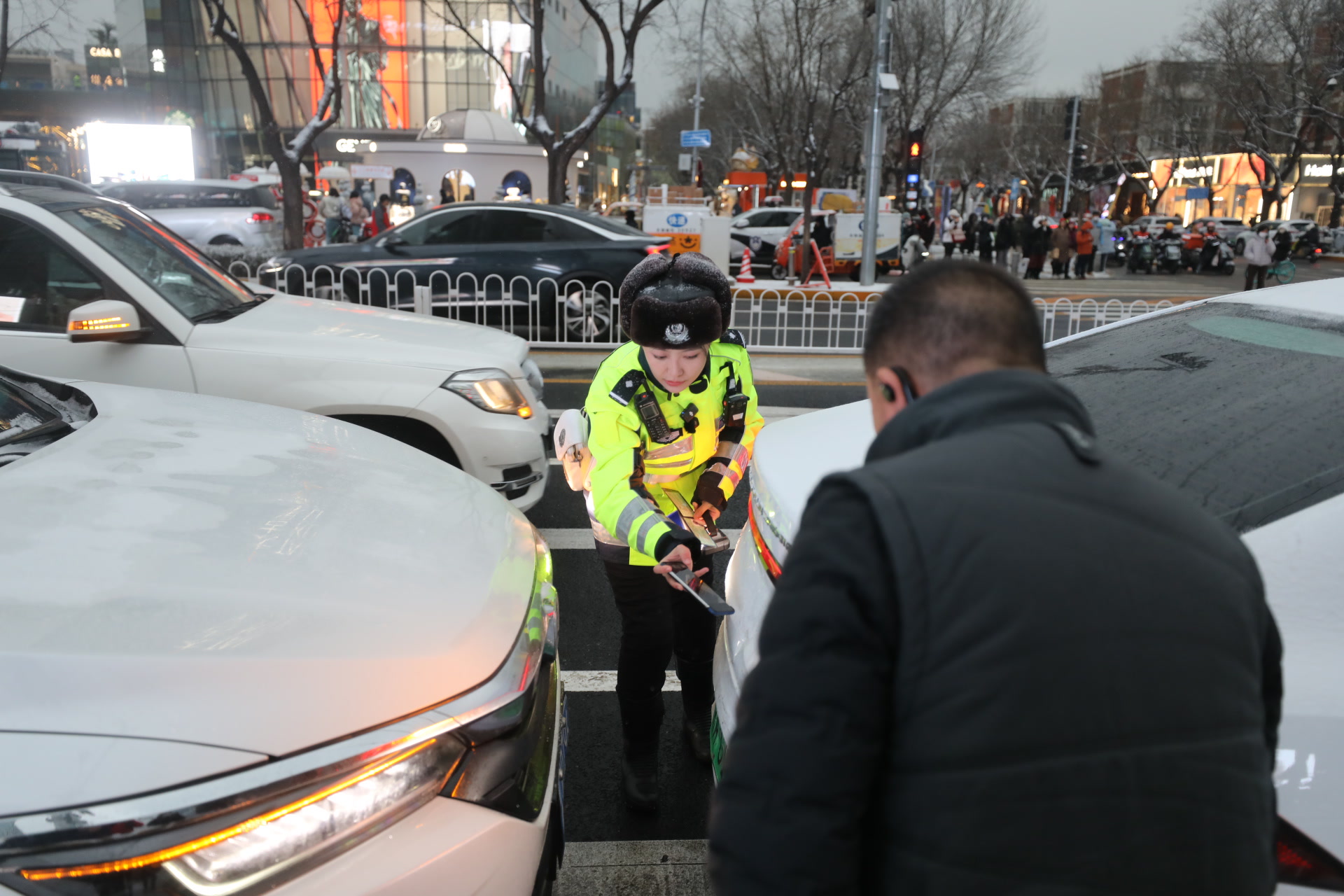 17时,刚刚进入晚高峰,受降雪影响,北京市内部分商圈已出现车辆缓行情况。朝阳区太古里商圈附近,因路面湿滑,车辆纷纷放缓速度。短短一刻钟,一处路口便接连发生4起电动自行车骑行人因刹车打滑摔倒的险情,还有1起因路面湿滑引发的机动车追尾事故。