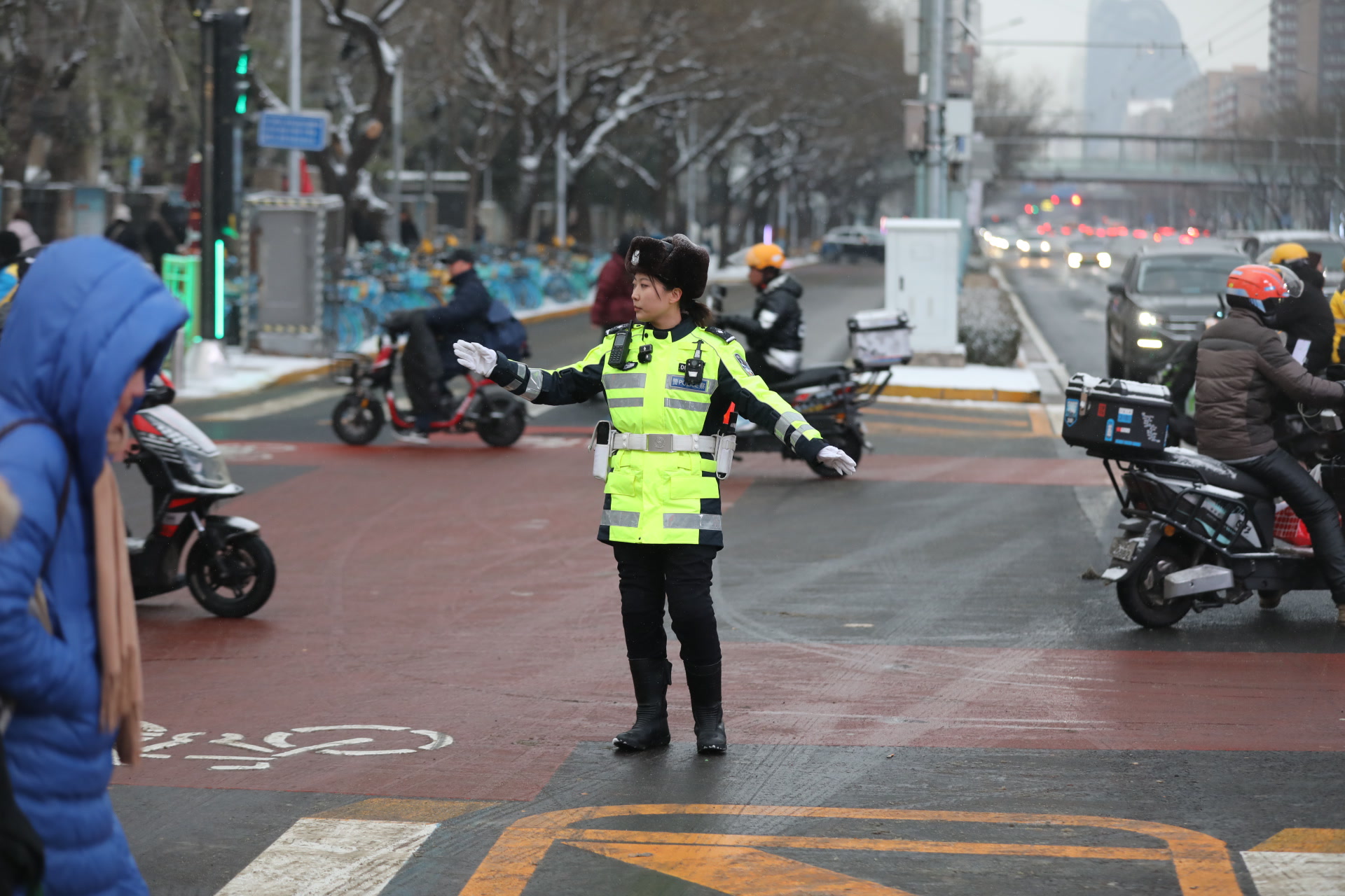 朝阳交通支队安全监督管理中队中队长王泽地提醒机动车驾驶员,行驶中不随意变道、避免急加速急刹车,转弯和过路口时减速慢行并停车让行。非机动车骑行人过路口时,应在距离路口30米至50米处提前减速,不使用影响操控的挡风被,做好防寒保暖措施。