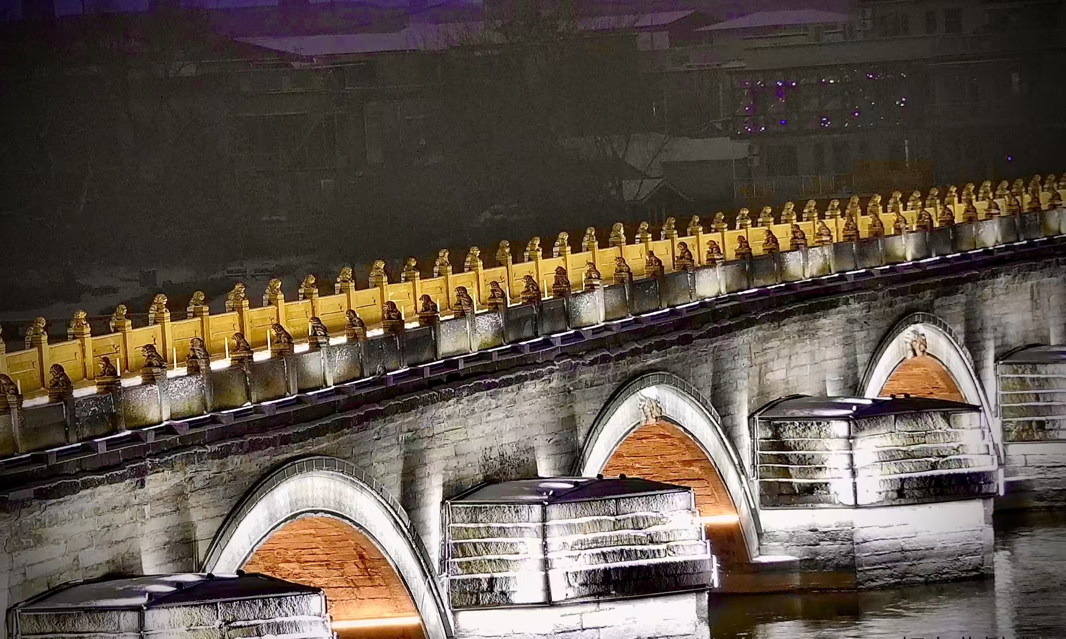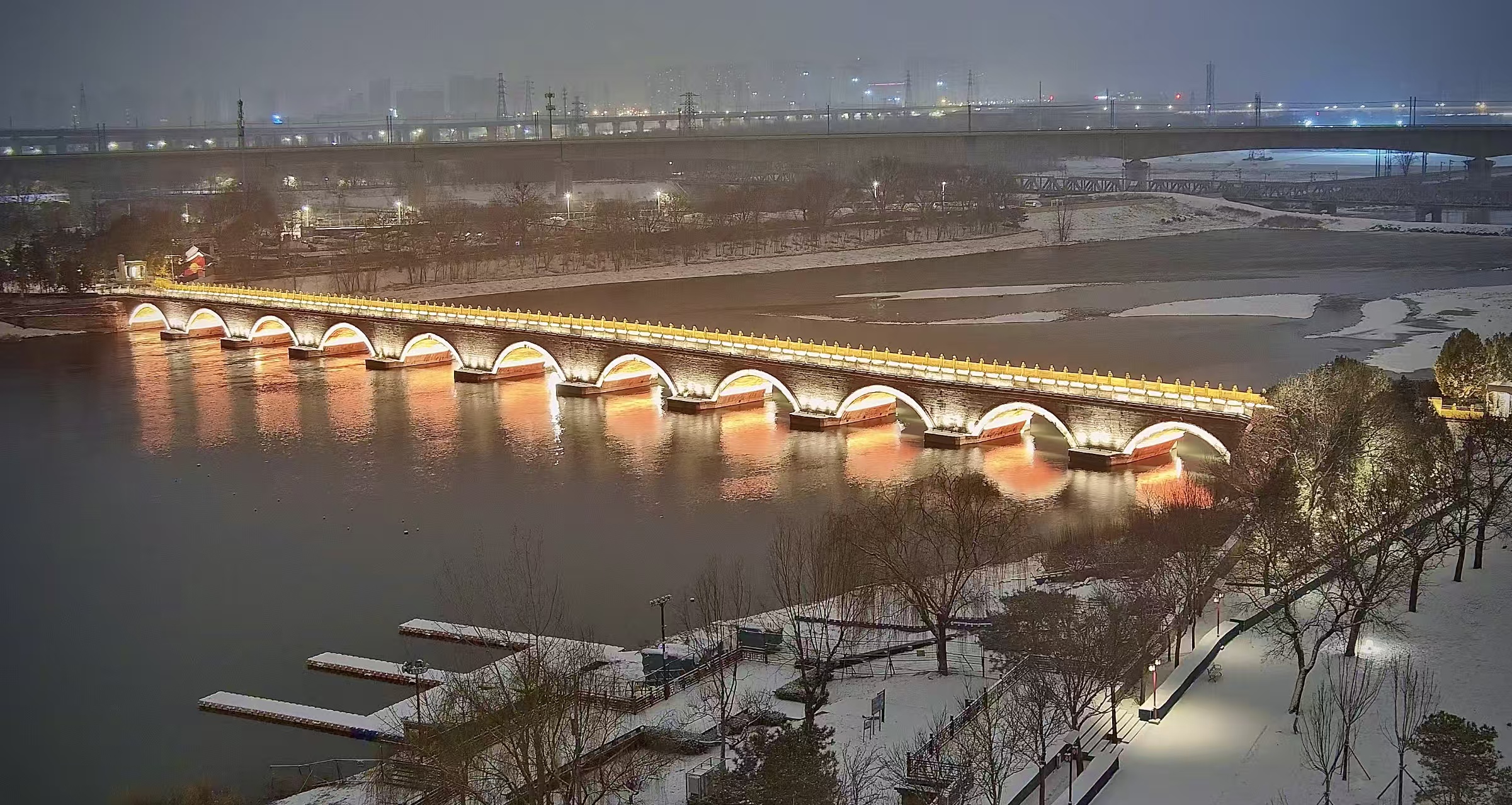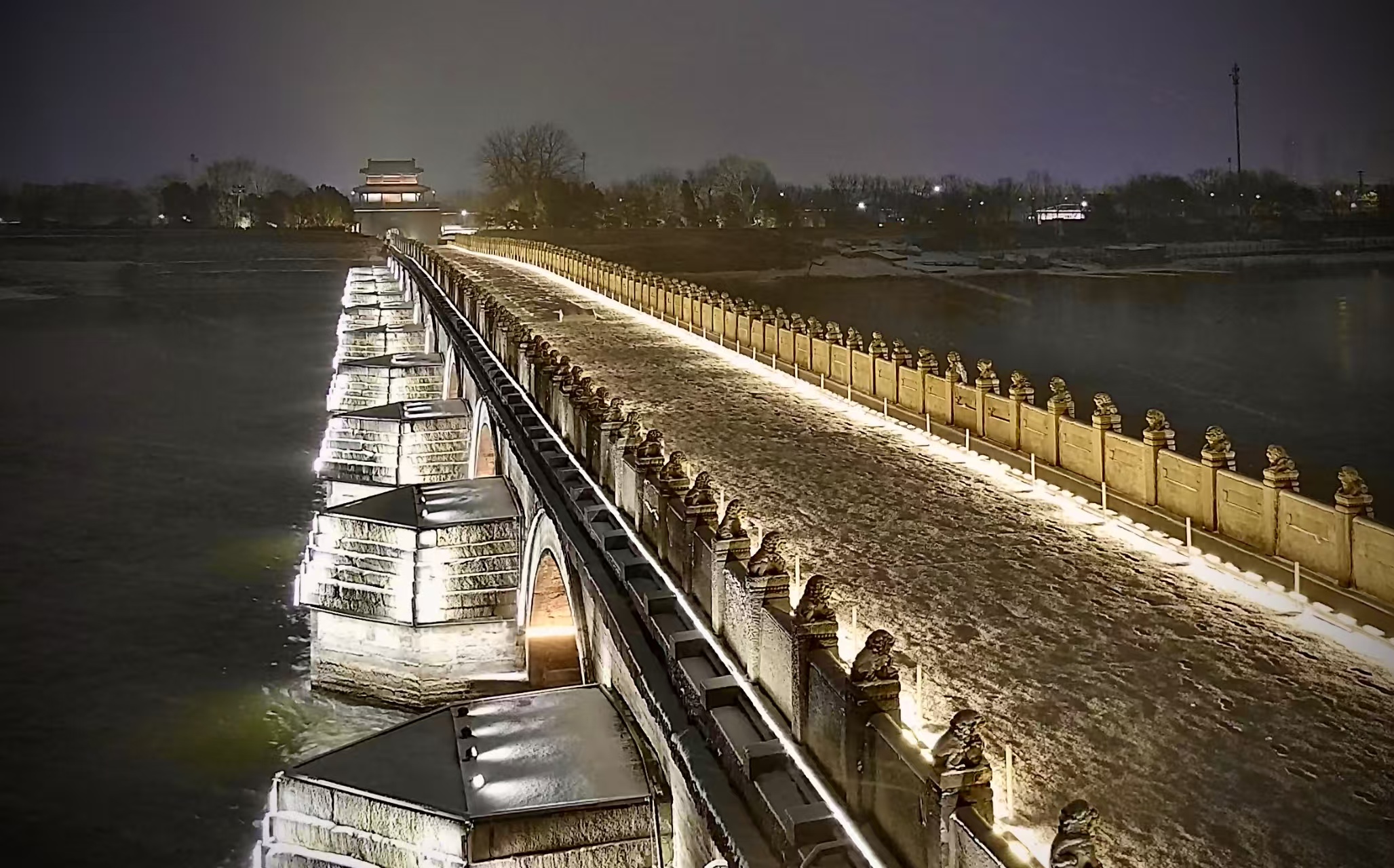 12月12日,北京初雪,夜晚,卢沟桥被点亮,银装素裹更添古韵与浪漫!
