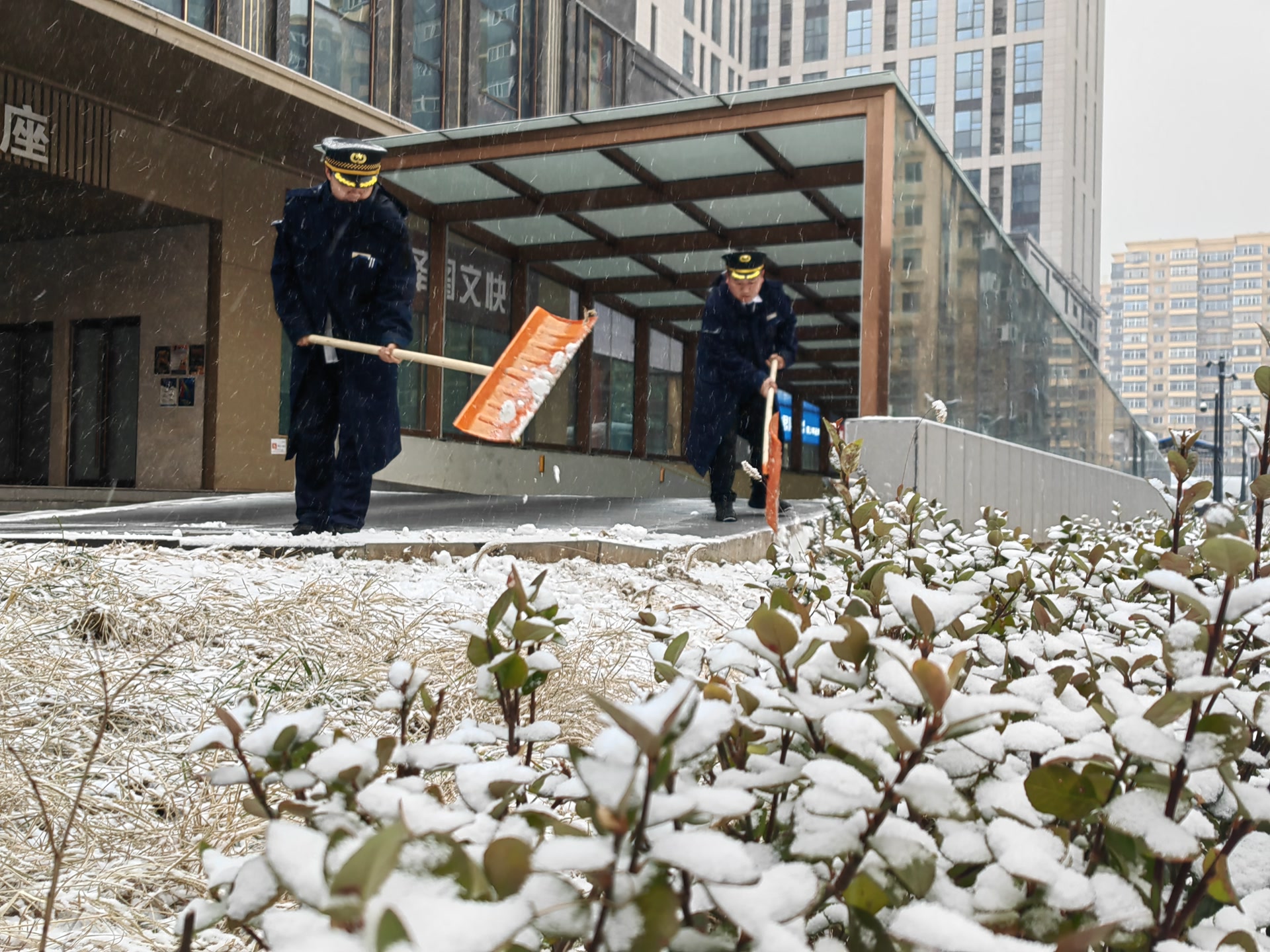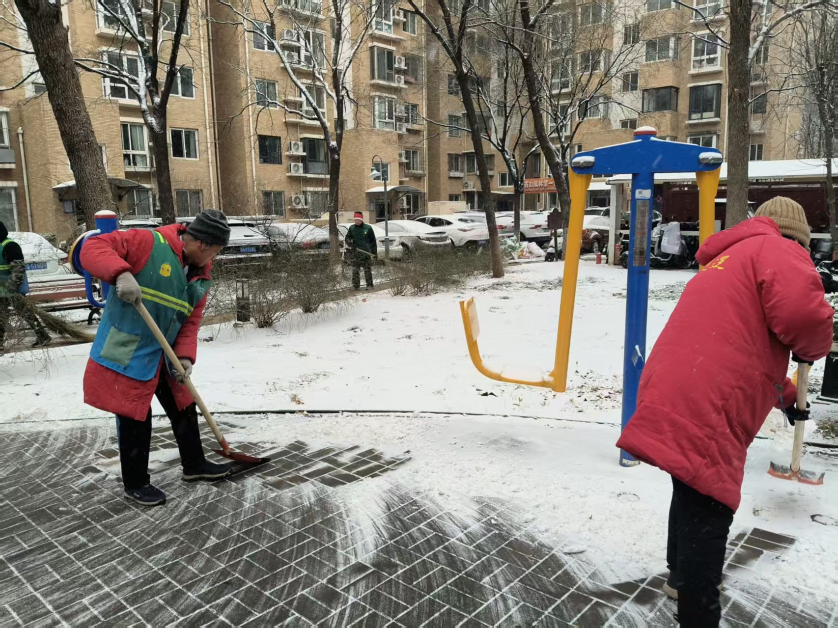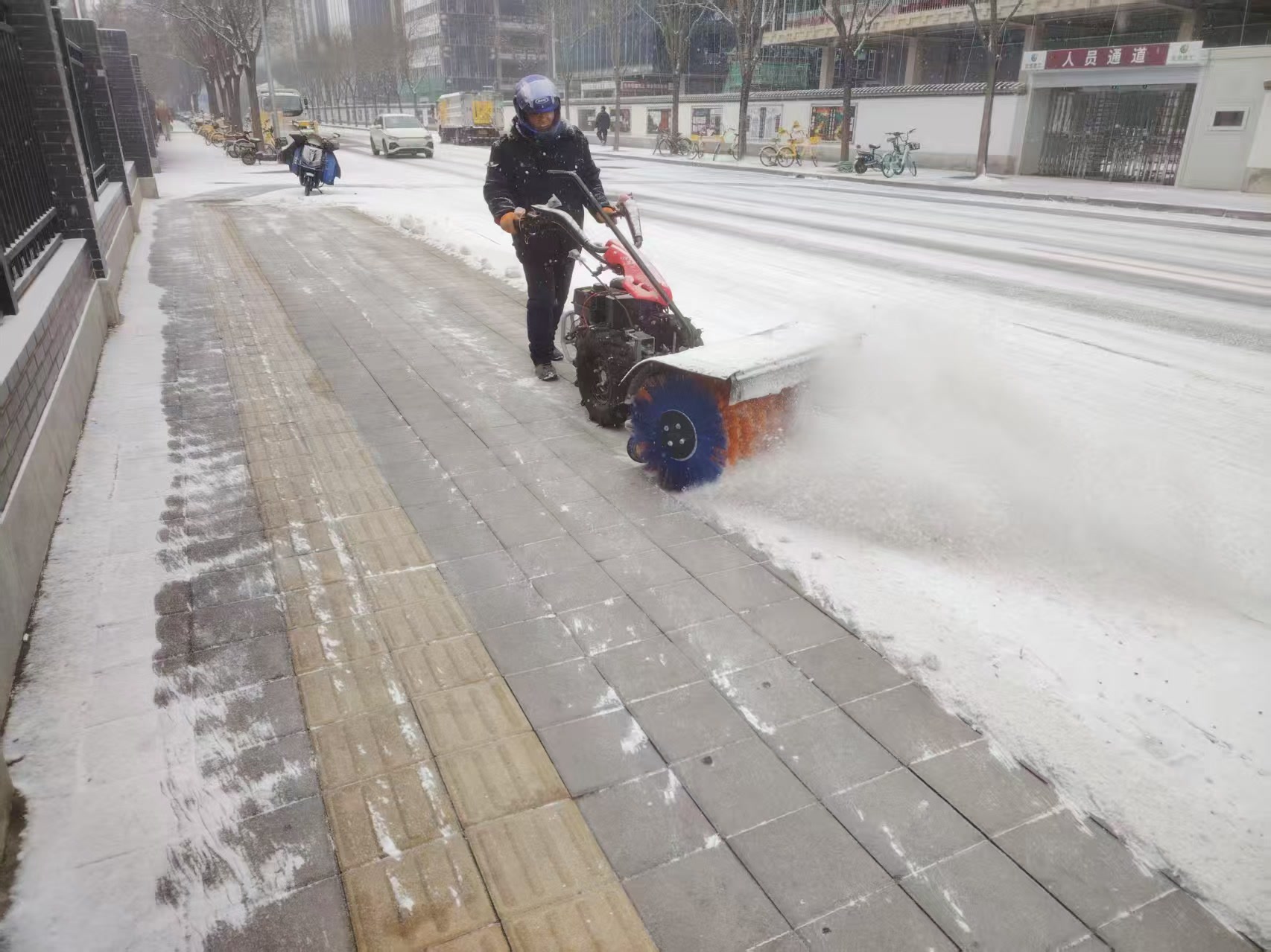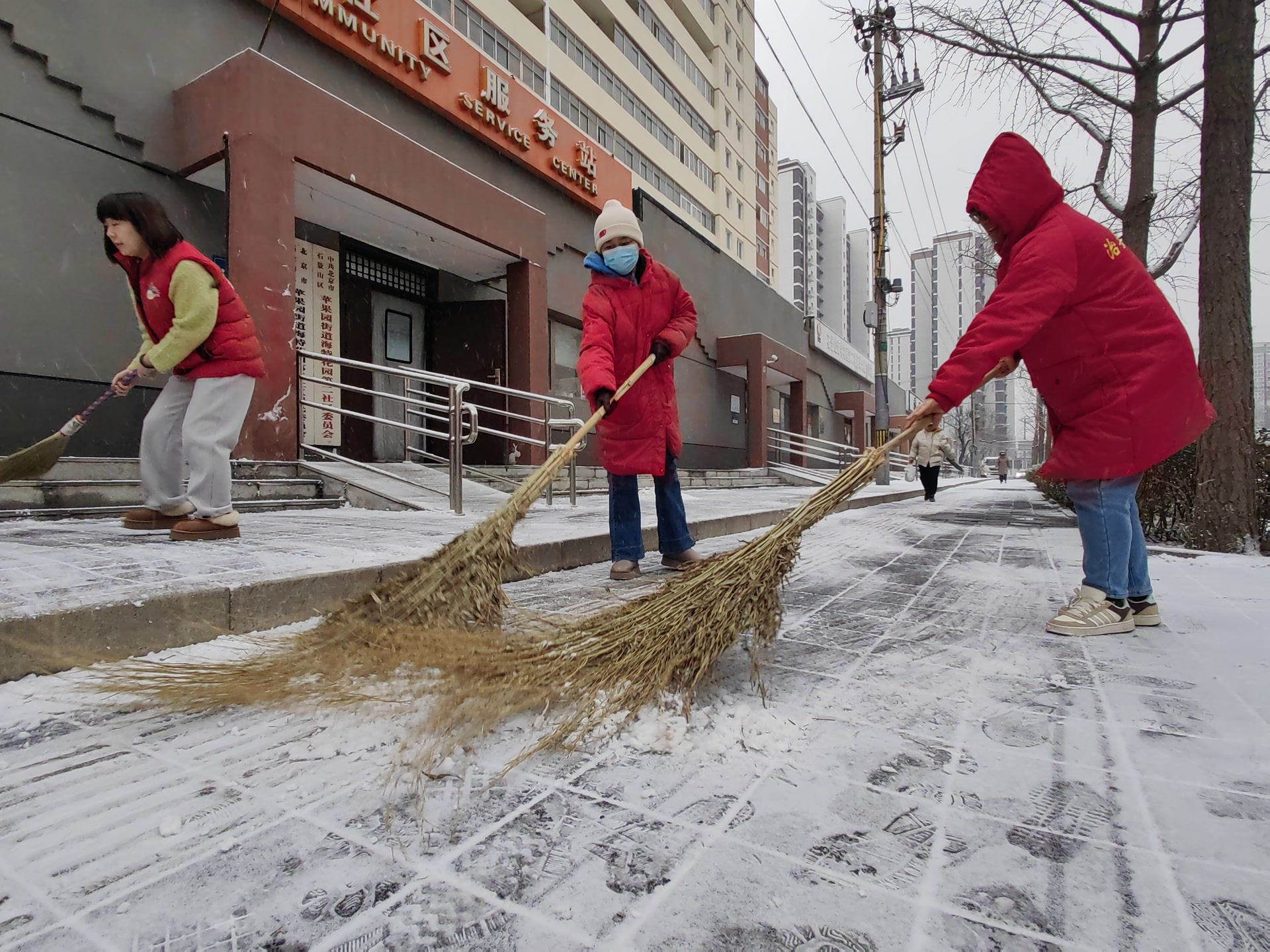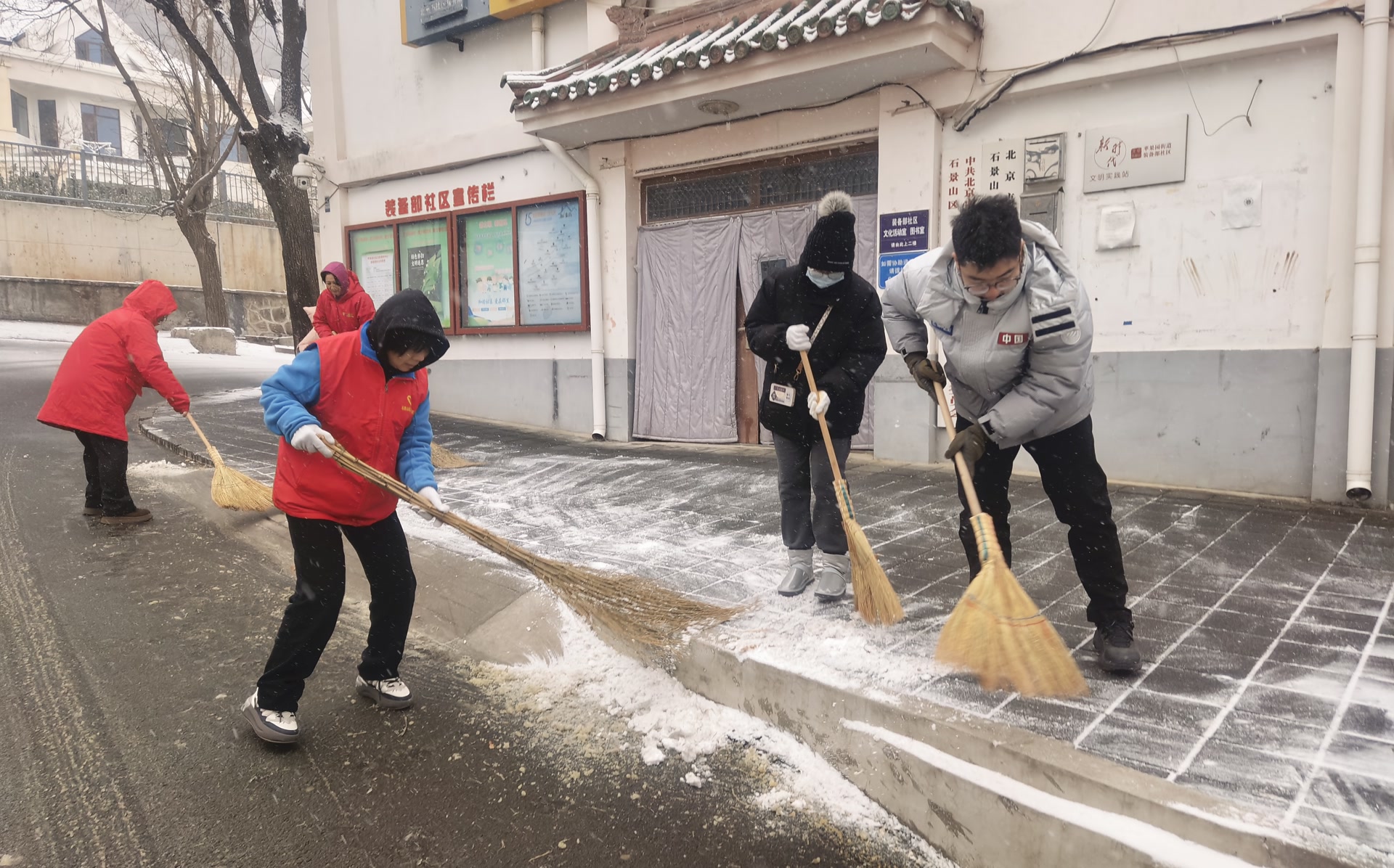 在海特花园第二社区居委会门口,社区工作人员正在扫雪清雪,他们将人行步道、社区出入口、坡道等关键点位清理干净,保障居民等出行安全。