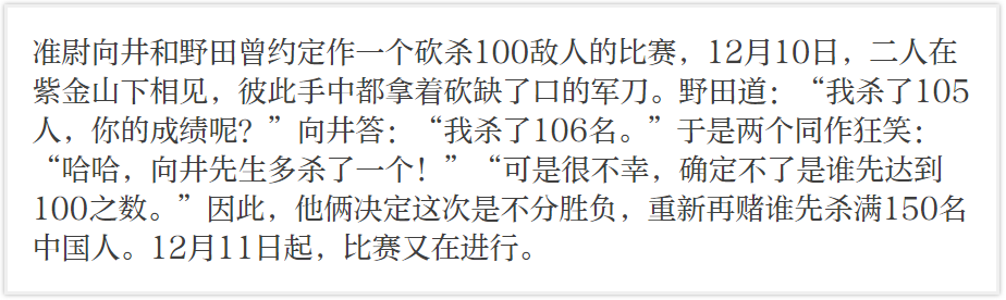 六朝古都成了血和尸体的地狱。而在日本,却因此举行大规模的庆祝活动。且看日本报纸载日军向井和野田在紫金山下进行的“杀人比赛”新闻——