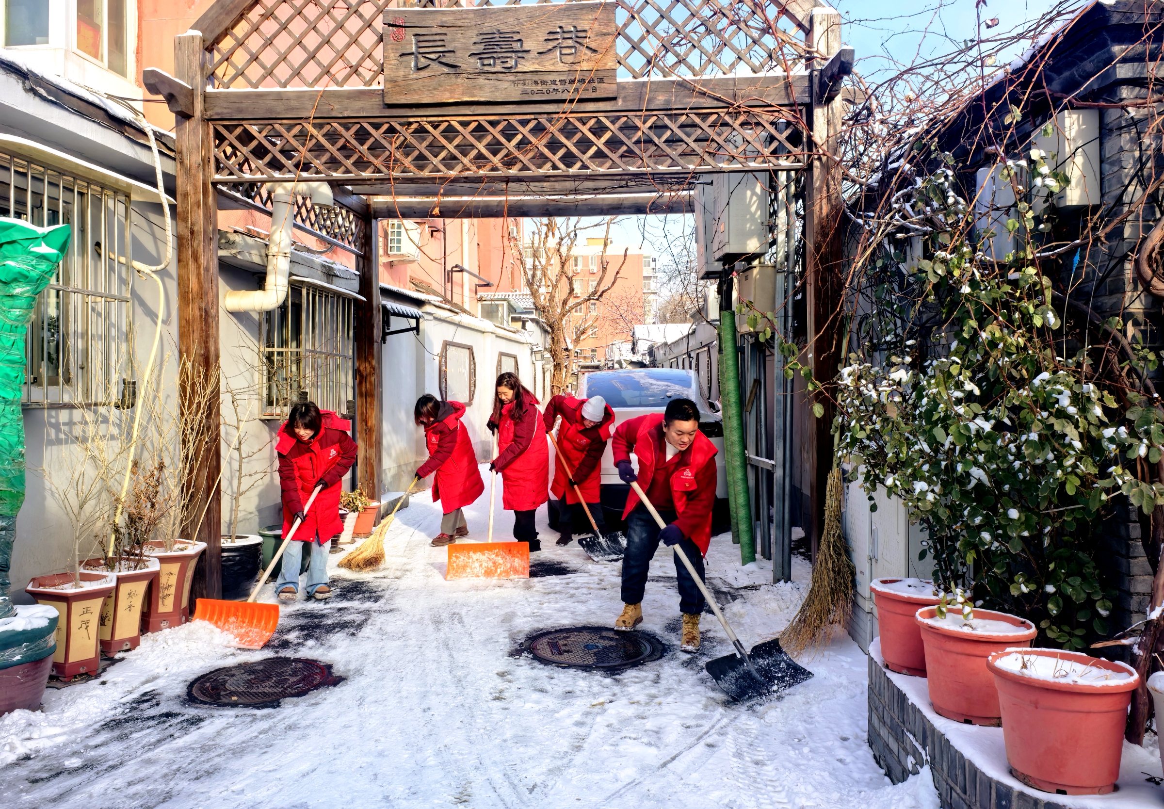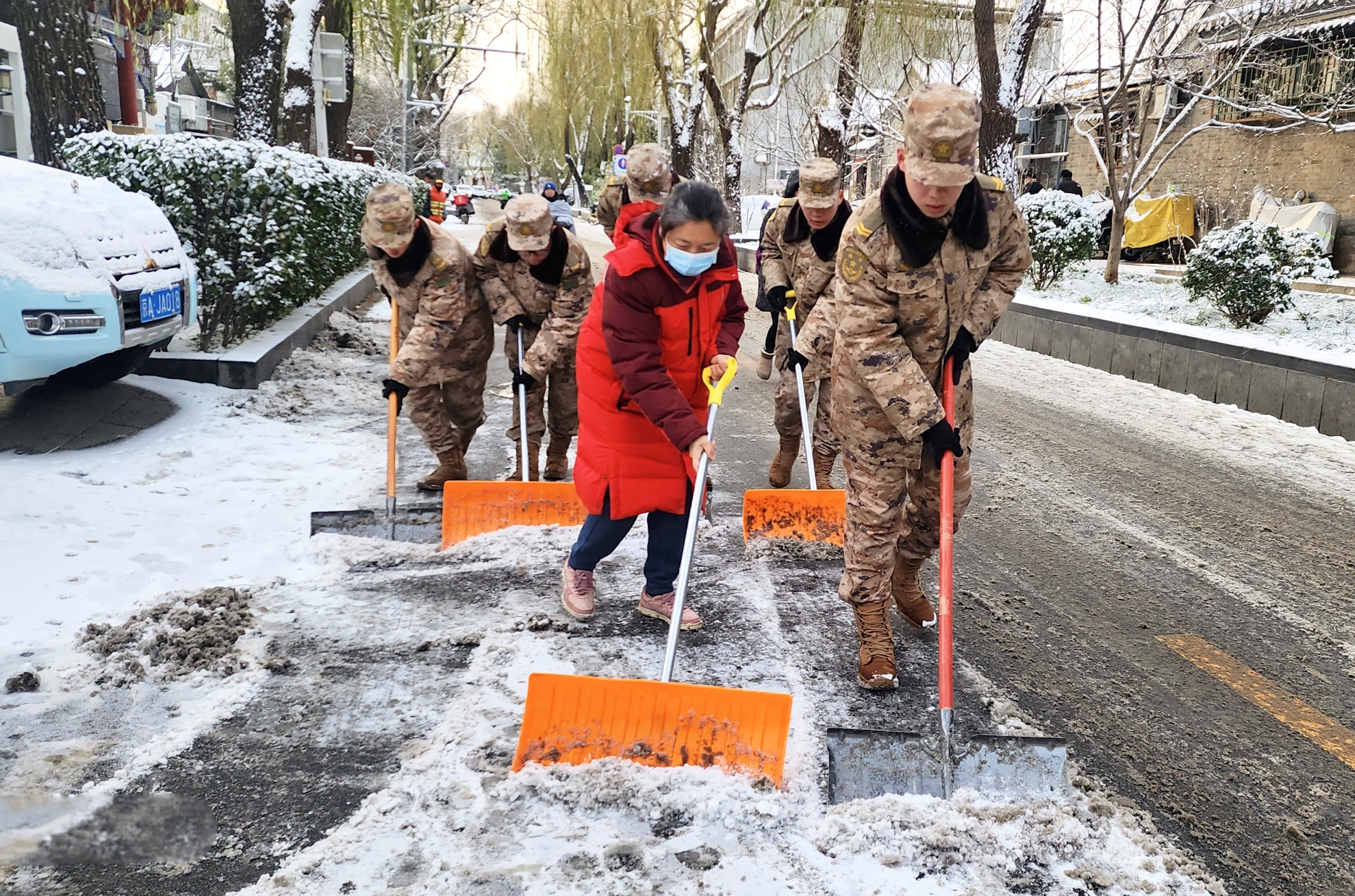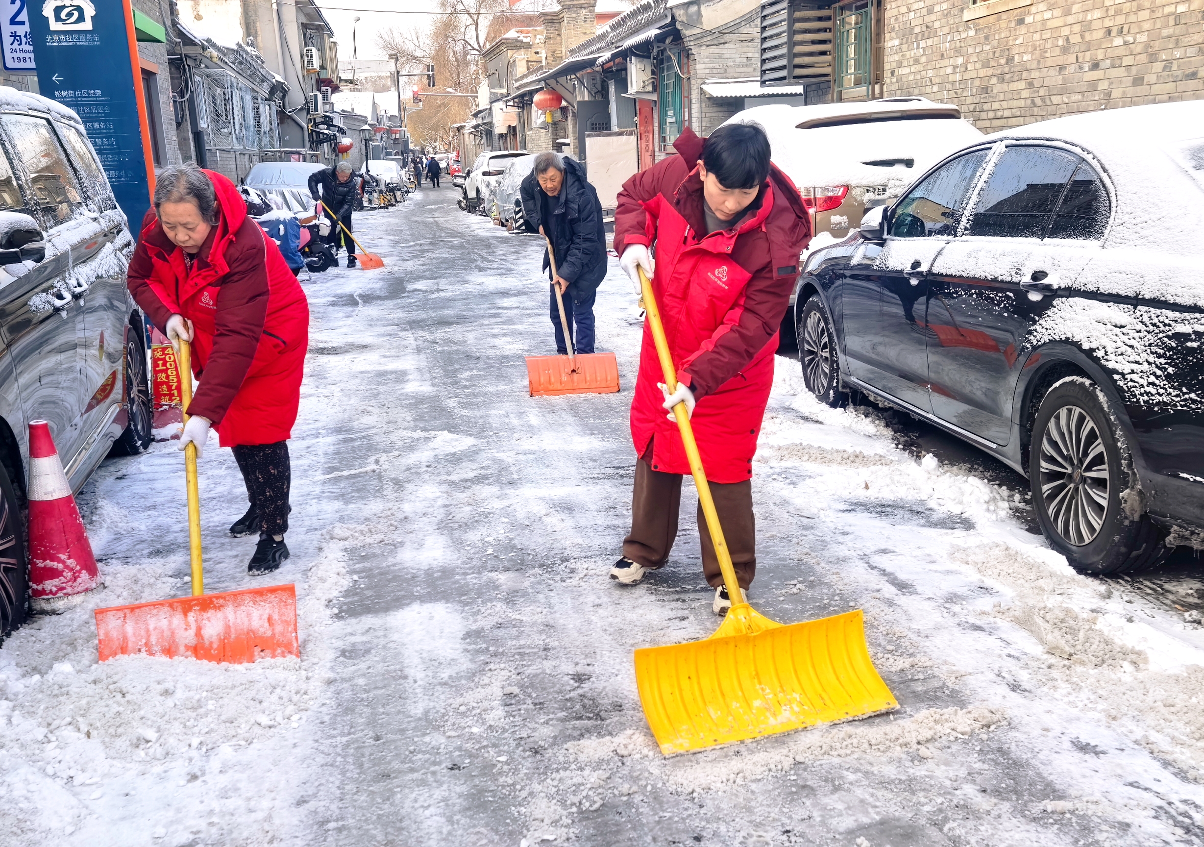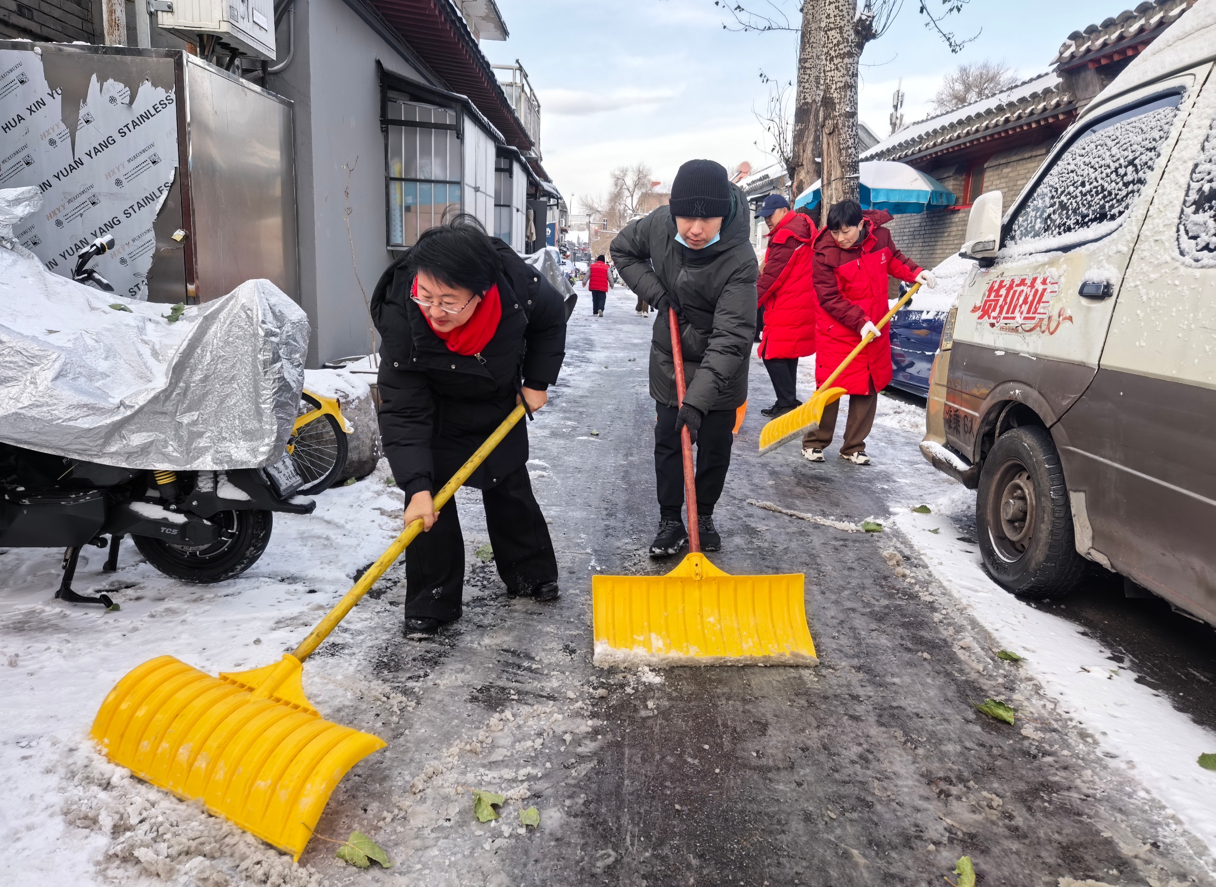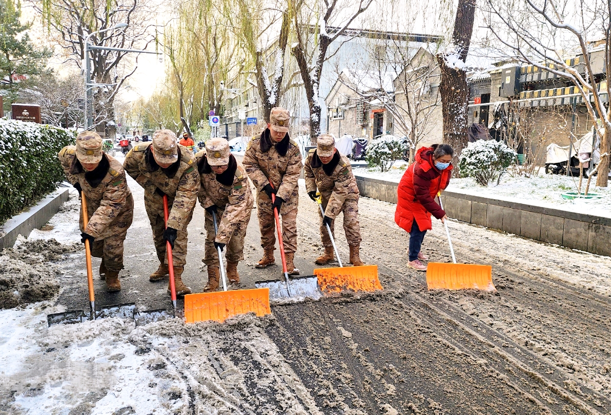 北京初雪后,什刹海街道积极动员各方力量对辖区易积雪点位开展清扫。街道干部下沉社区,与社区工作者、居民志愿者一起开展扫雪铲冰工作,大家默契配合,分工负责铲除厚雪和暗冰,跟进清扫碎雪,提醒居民注意安全。周边门店和辖区单位、驻区部队也主动加入,清扫门前区域,确保辖区街巷整洁通畅,保障辖区居民、游客平安出行。