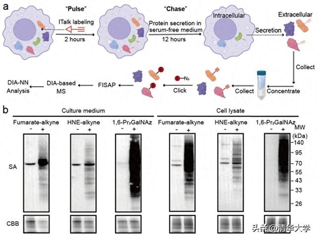 近日,清华大学药学院秦为助理教授课题组与中国药科大学庄申甜副教授团队合作研究了一种名为“PTM-basedsecretomeprofiling(PBSP)”的新型化学蛋白质组学技术,实现了对携带特定翻译后修饰的分泌蛋白的时空动态追踪,并揭示了衣康酸修饰通过激活酪氨酸激酶FYN调控细胞间通讯的新机制。